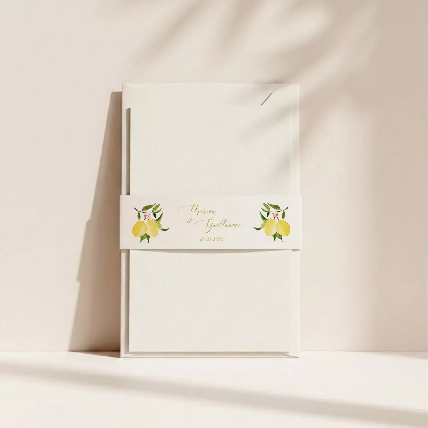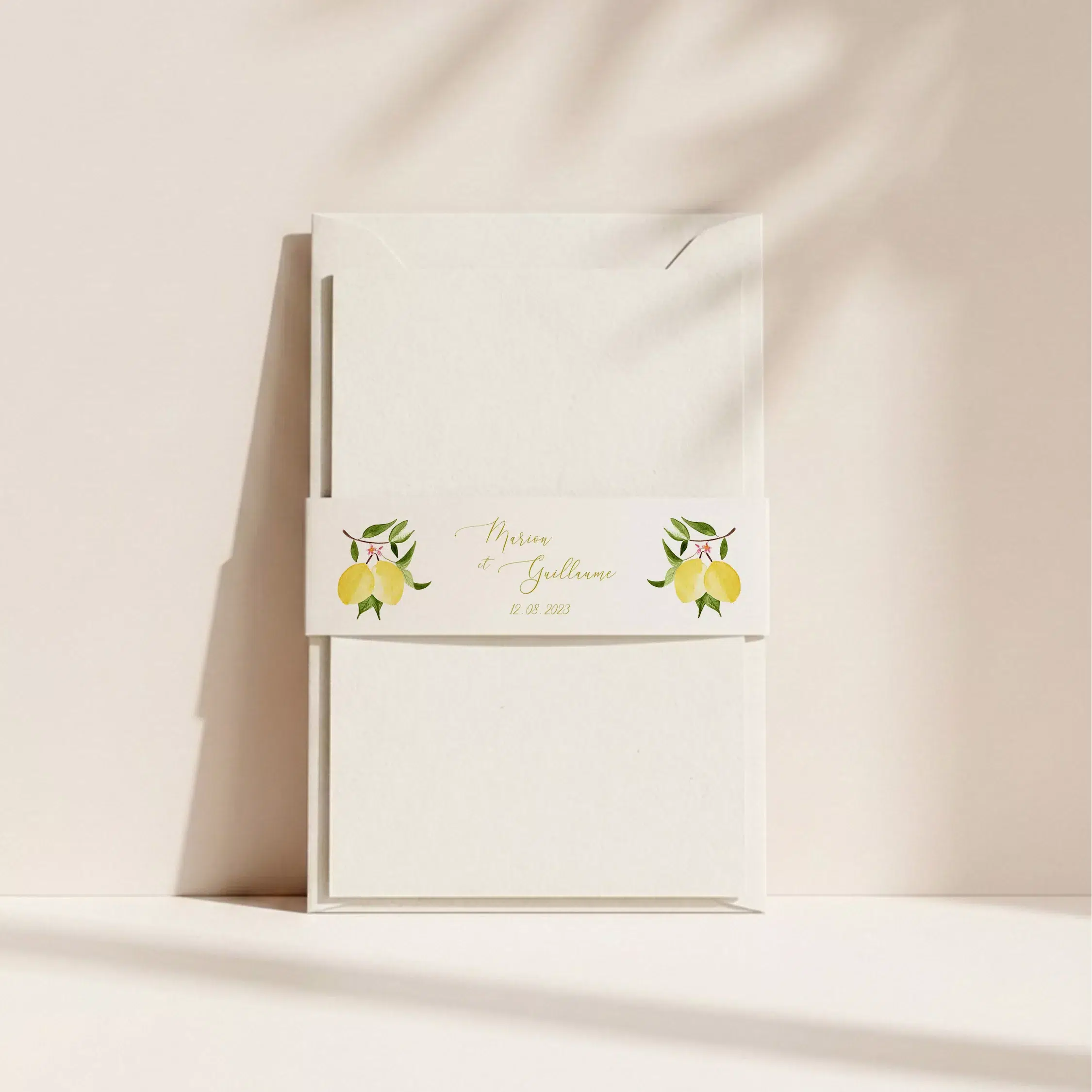 Le belly band permet d’assembler vos différents cartons avec élégance. En effet, cet accessoire maintient votre faire-part et vos invitations dans un ensemble soigné. Le studio se charge de la personnalisation pour qu’il s’accorde parfaitement au design et à l’esprit de votre collection. Ainsi, vos invités profitent d’une présentation raffinée dès l’ouverture de l’enveloppe. La collection Un Amour de Citron de Maison Célestine célèbre les mariages lumineux. Peinte à la main à l’aquarelle, elle met en scène citrons et branchages. Ainsi, les tons jaune et vert évoquent le printemps et l’été. Chaque illustration apporte fraîcheur, poésie et ambiance botanique. Par ailleurs, cette collection convient parfaitement aux mariages bohèmes, naturels ou colorés.