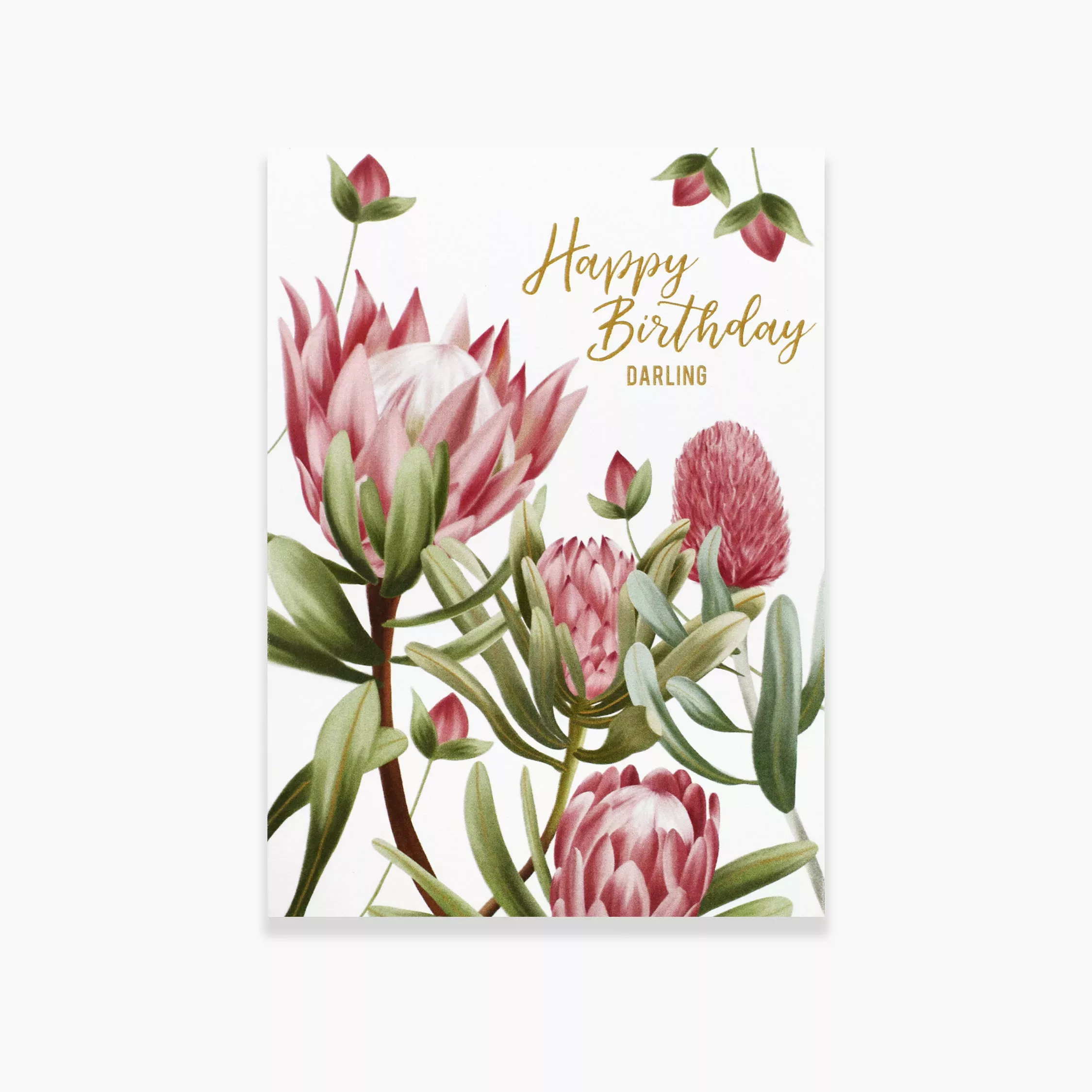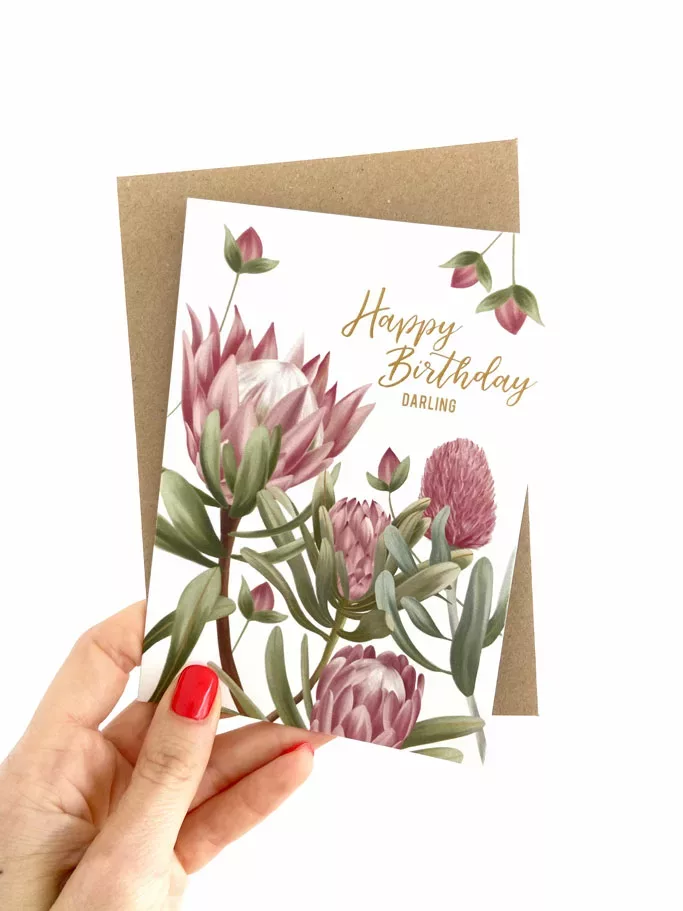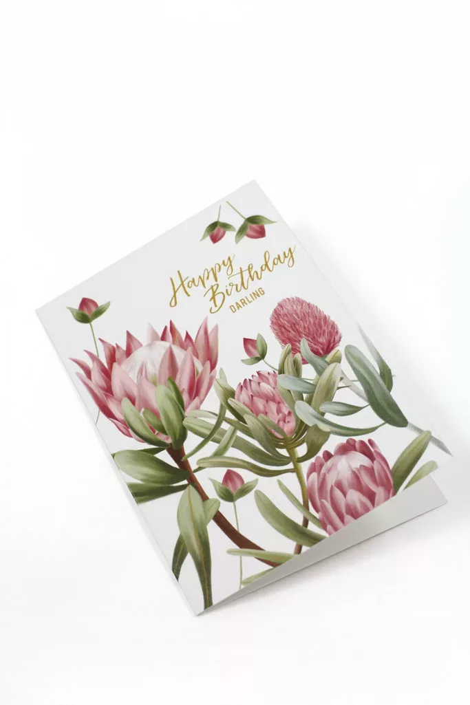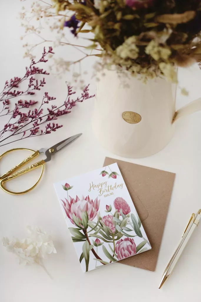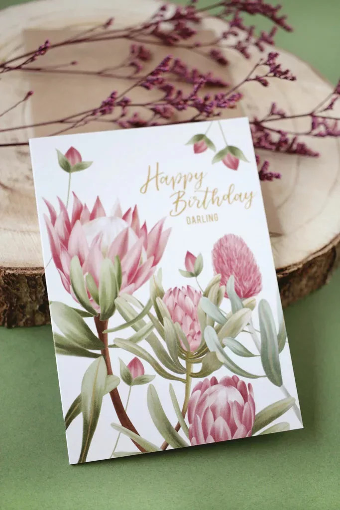 Souhaitez un joyeux anniversaire à l’un de vos proches avec nos cartes de voeux fleuries et colorées. Ici notre modèle Darling Protea. Cette carte pliée a un intérieur vierge afin que vous puissiez y inscrire un message.