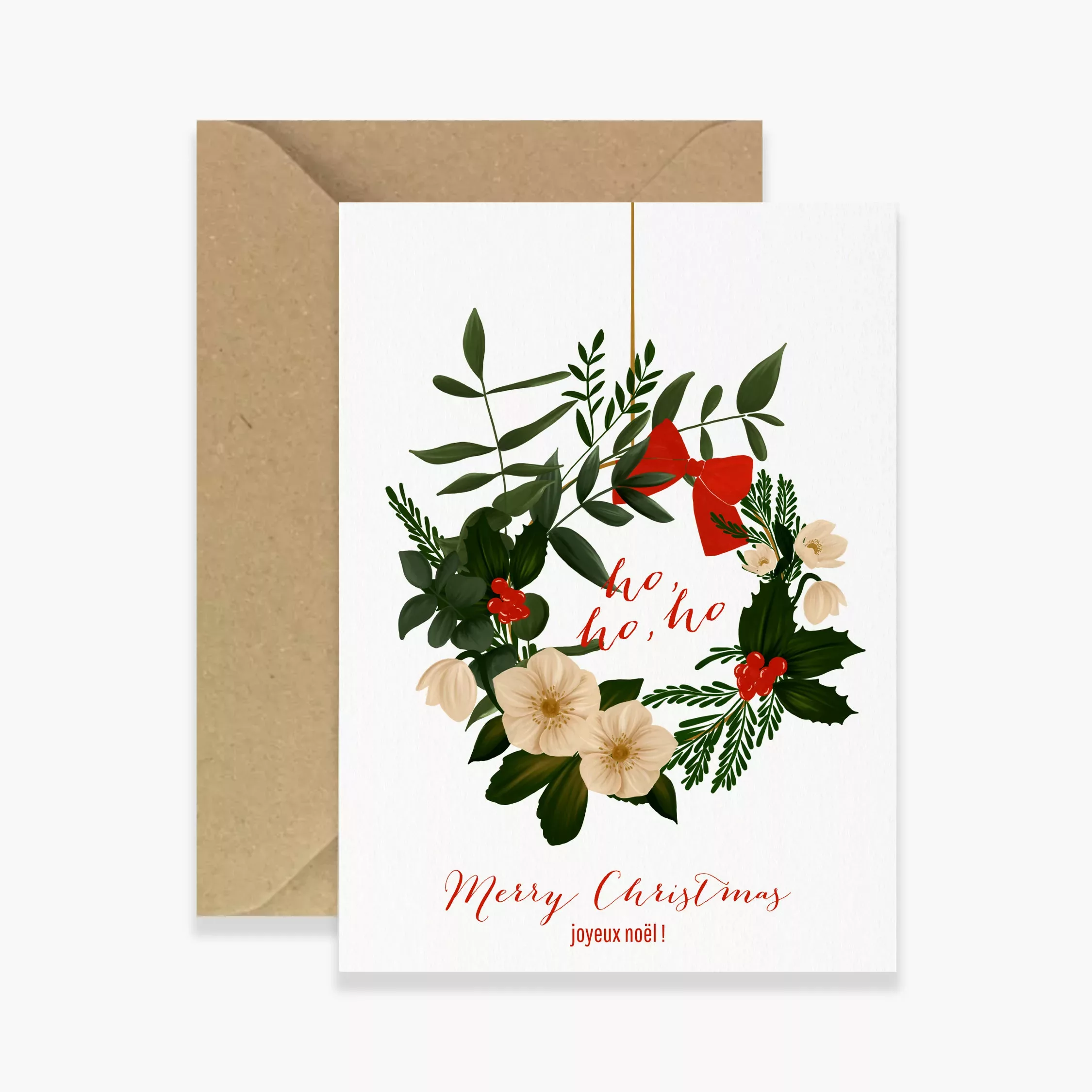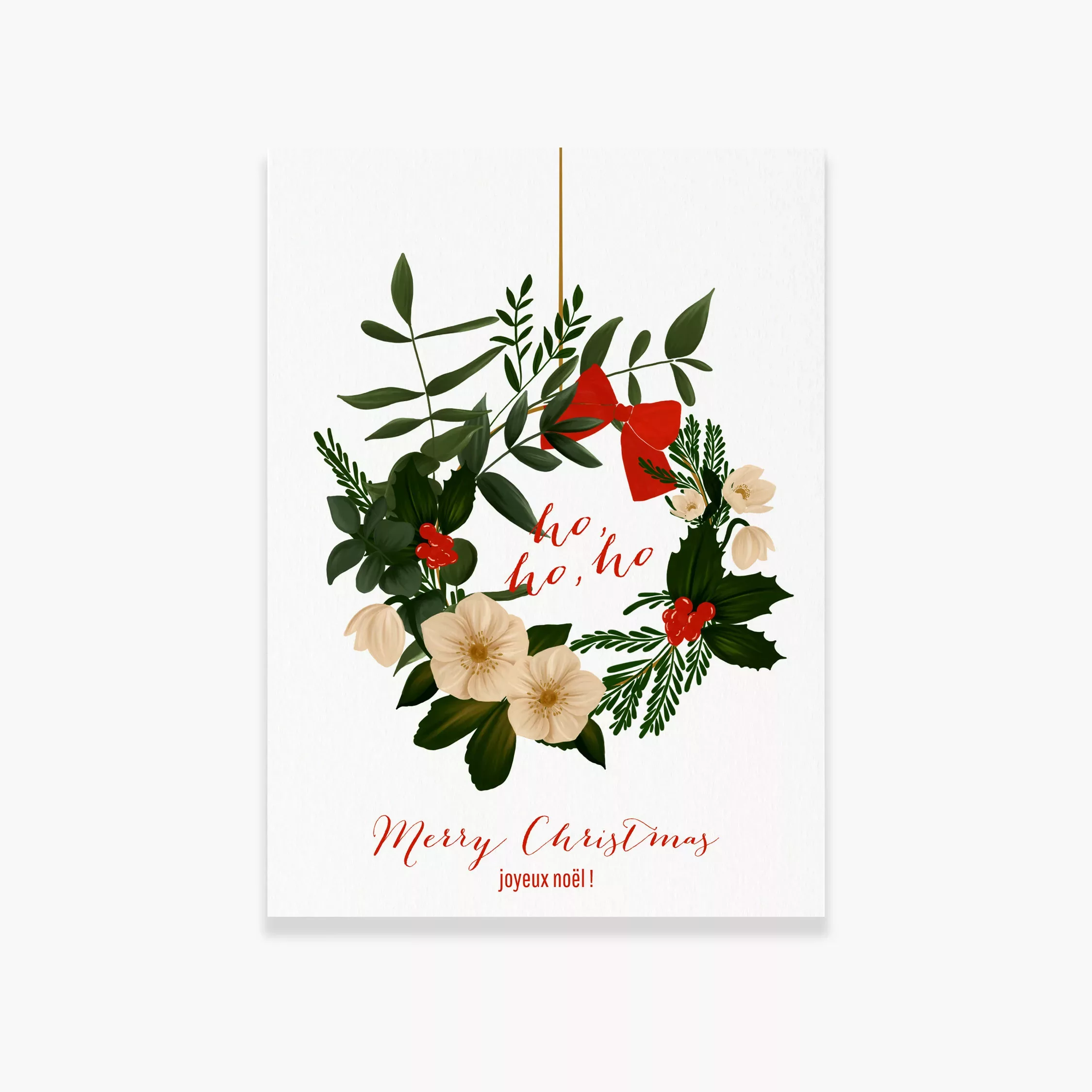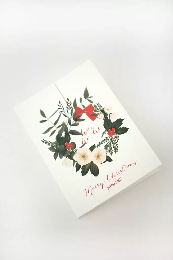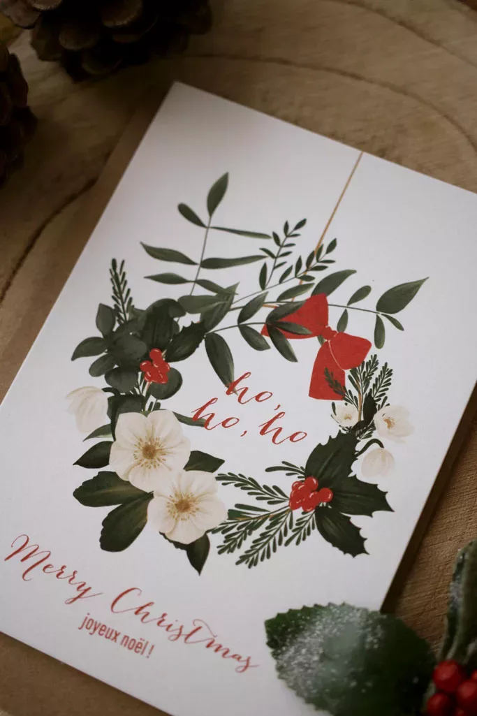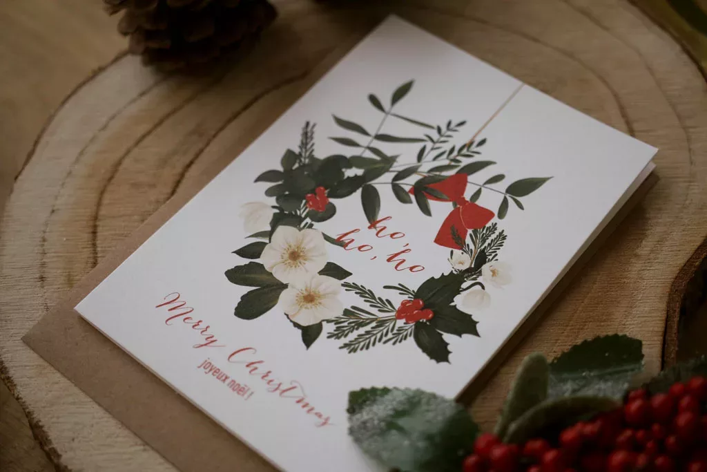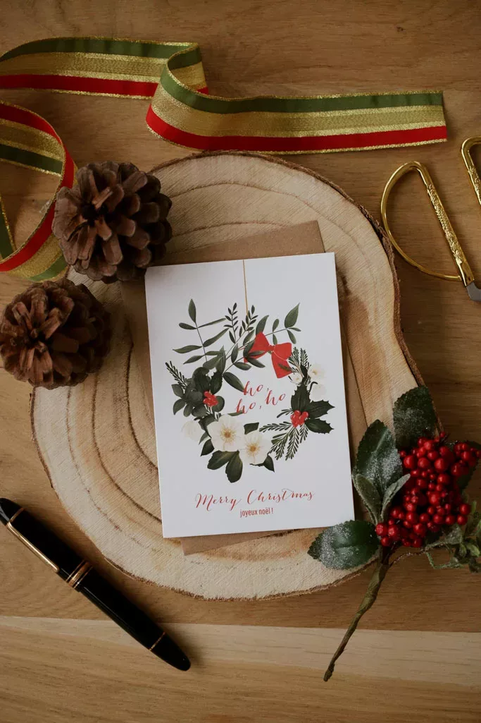 Envoyez des voeux chaleureux à votre famille, amis et proches avec nos cartes de fêtes festives et colorées. Ici notre modèle Couronne de Noël représentant une jolie couronne de fêtes avec notre touche botanique. Cette carte pliée a un intérieur vierge afin que vous puissiez y inscrire votre message.