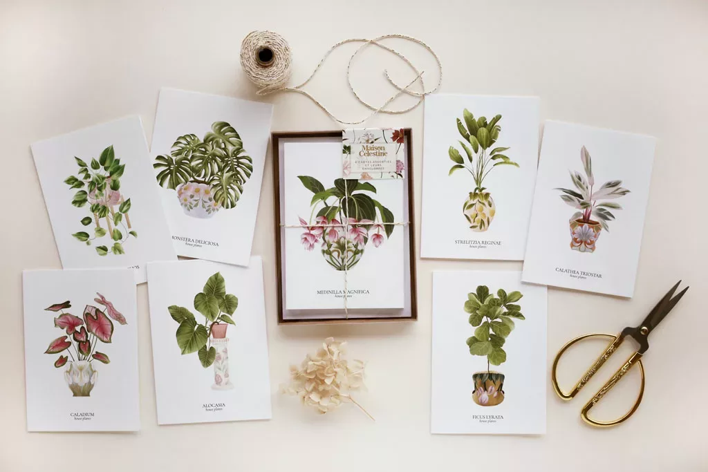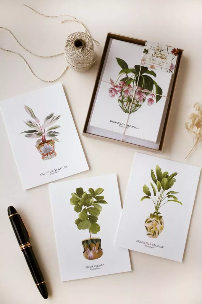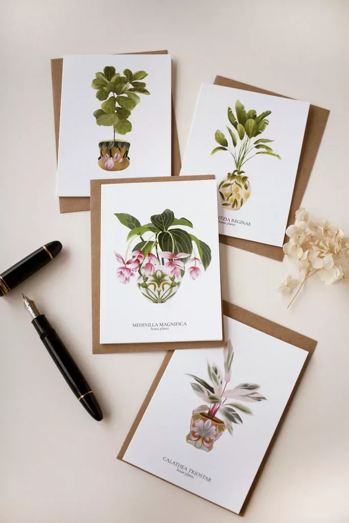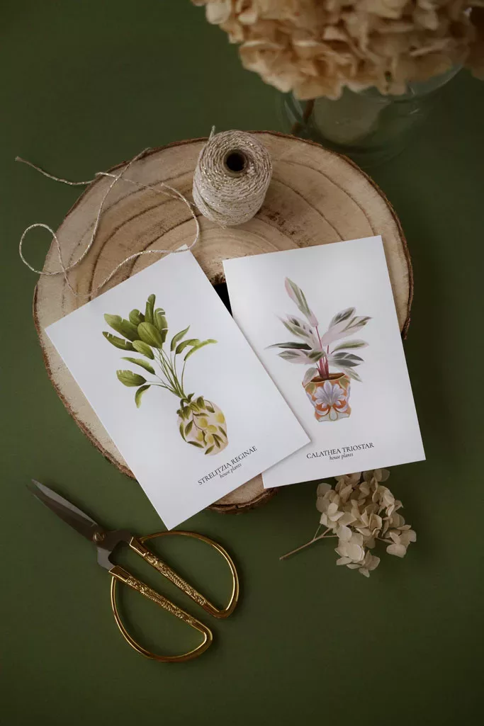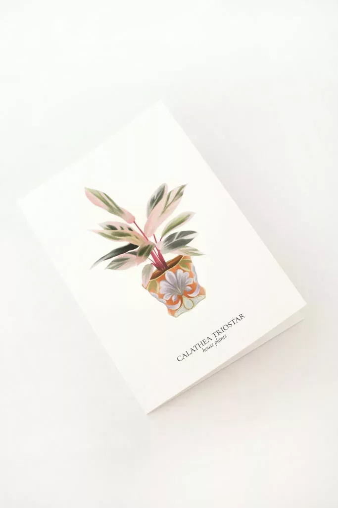 Envoyez un petit mot à vos proches avec nos cartes de voeux botaniques et colorées. Elles s’adaptent à toute occasion: remerciements, pensée, message spécial… et rendront la journée de votre destinataire plus joyeuse ! Ici notre modèle Calathea Triostar de notre série “House Plants”dédiée aux plantes. Cette carte pliée a un intérieur vierge afin que vous puissiez y inscrire votre message.