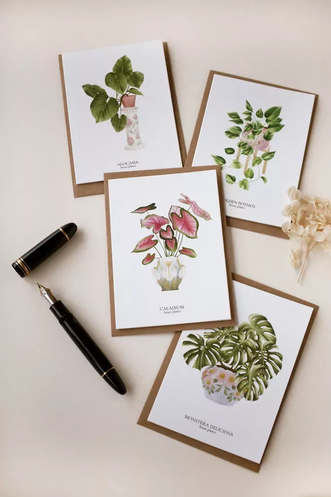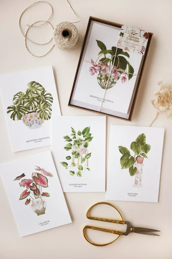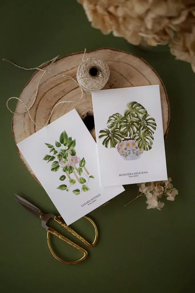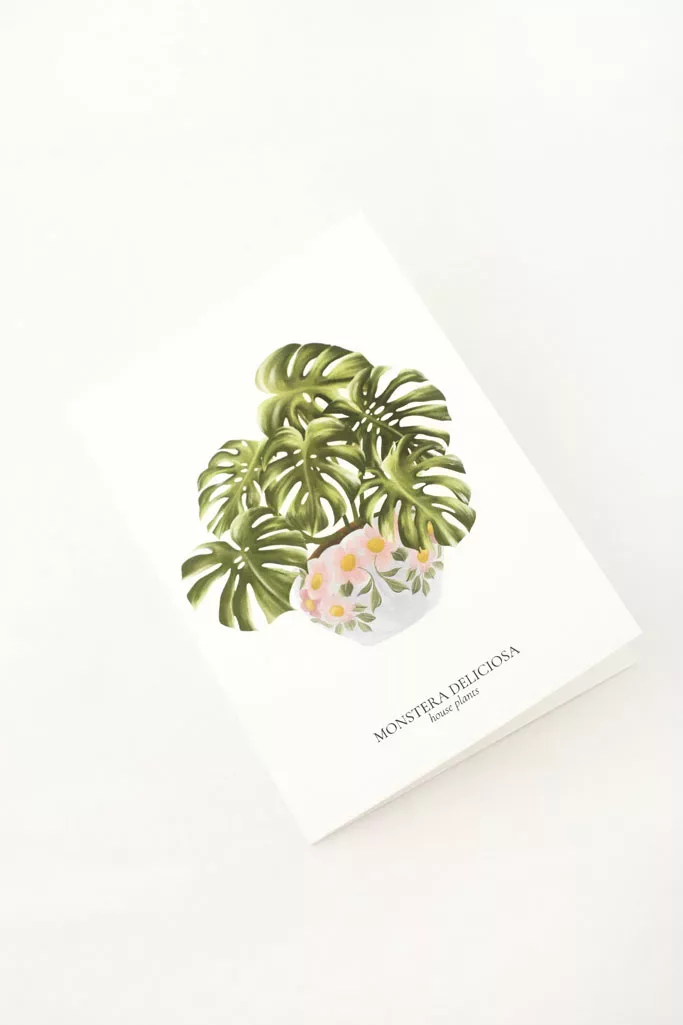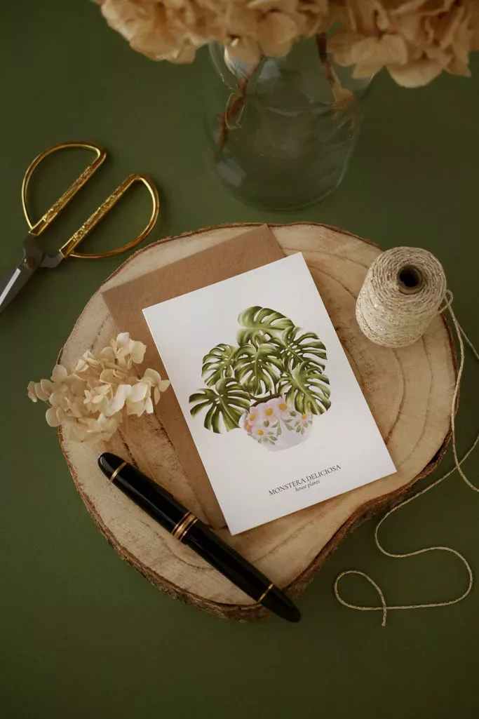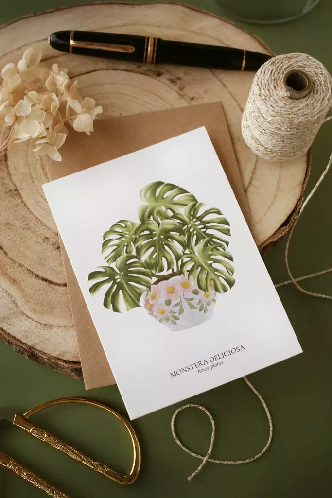 Envoyez un petit mot à vos proches avec nos cartes de voeux botaniques et colorées. Elles s’adaptent à toute occasion: remerciements, pensée, message spécial… et rendront la journée de votre destinataire plus joyeuse ! Ici notre modèle Monstera de notre série “House Plants”dédiée aux plantes. Cette carte pliée a un intérieur vierge afin que vous puissiez y inscrire votre message.