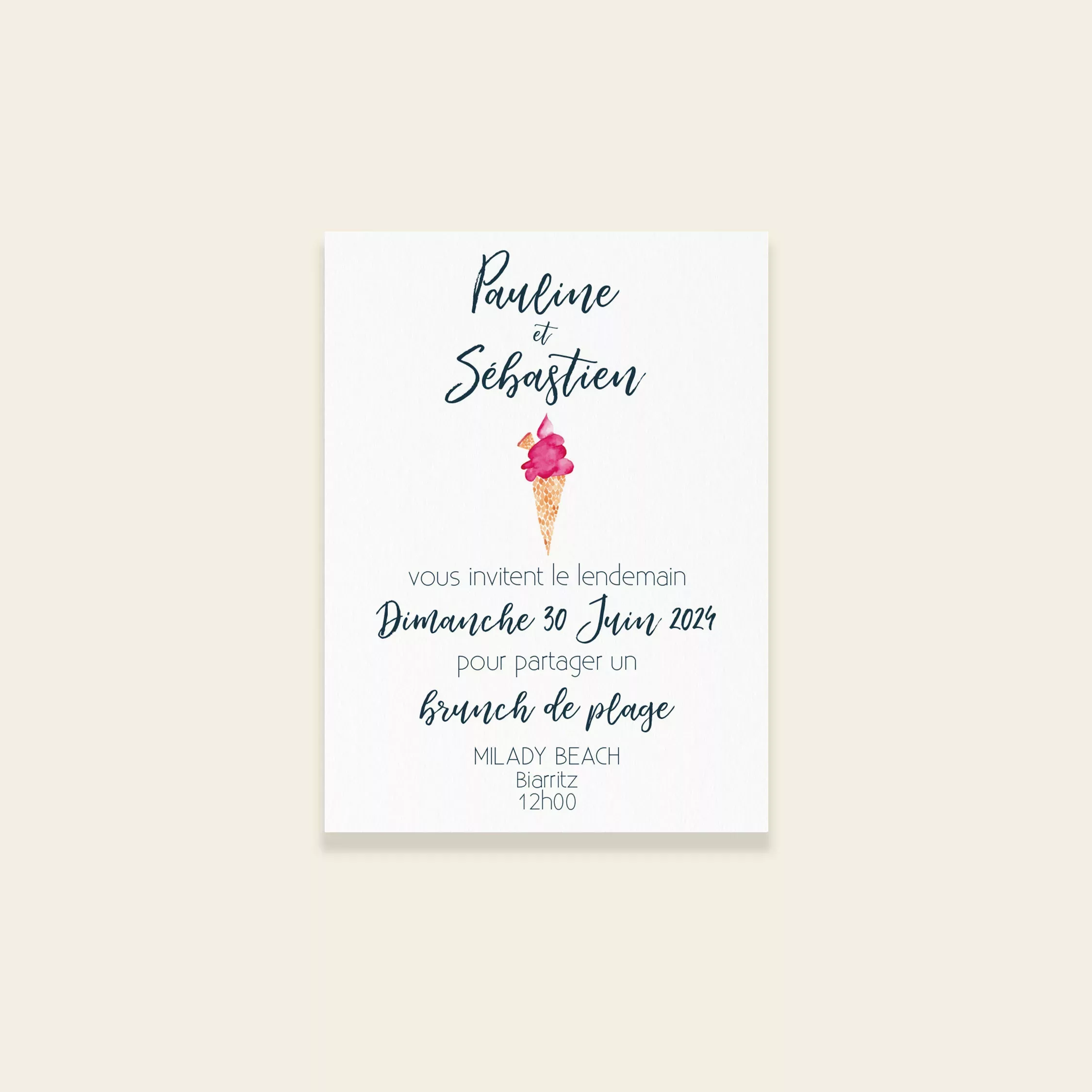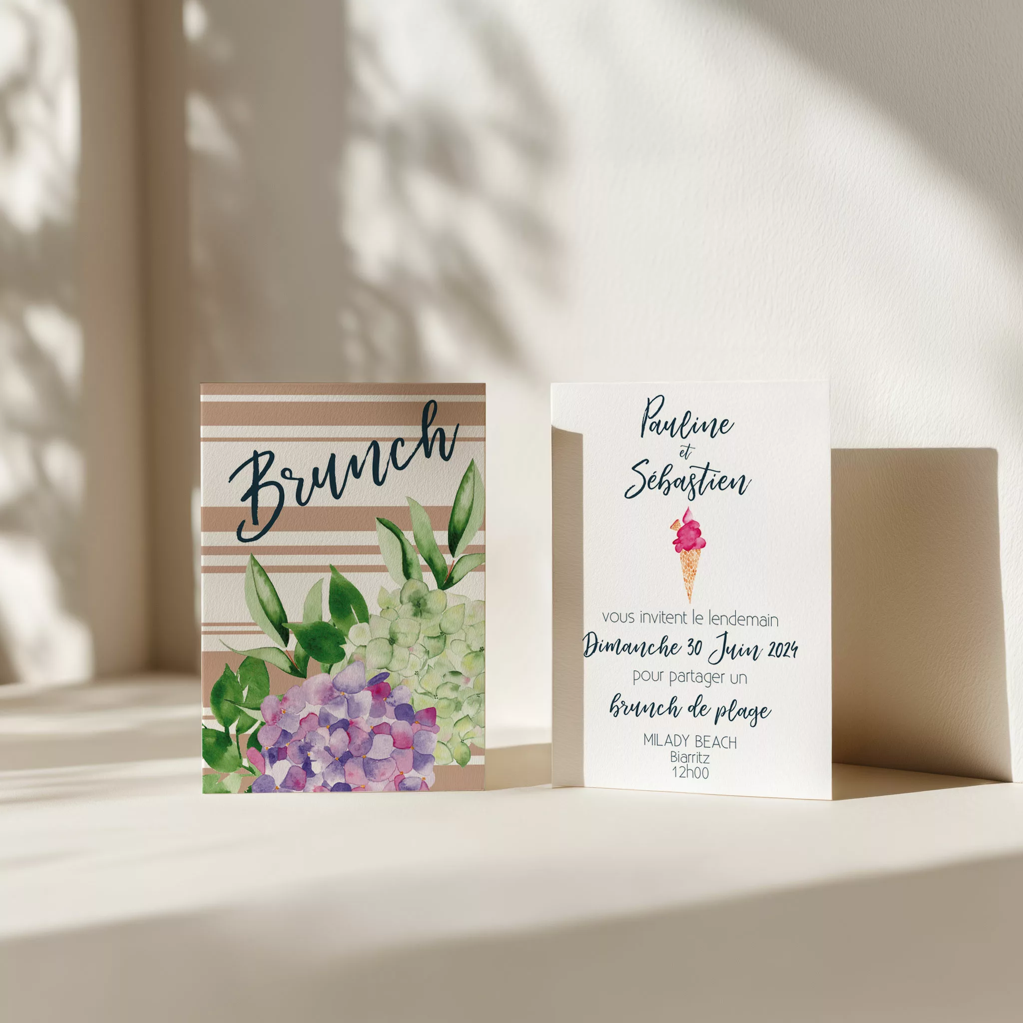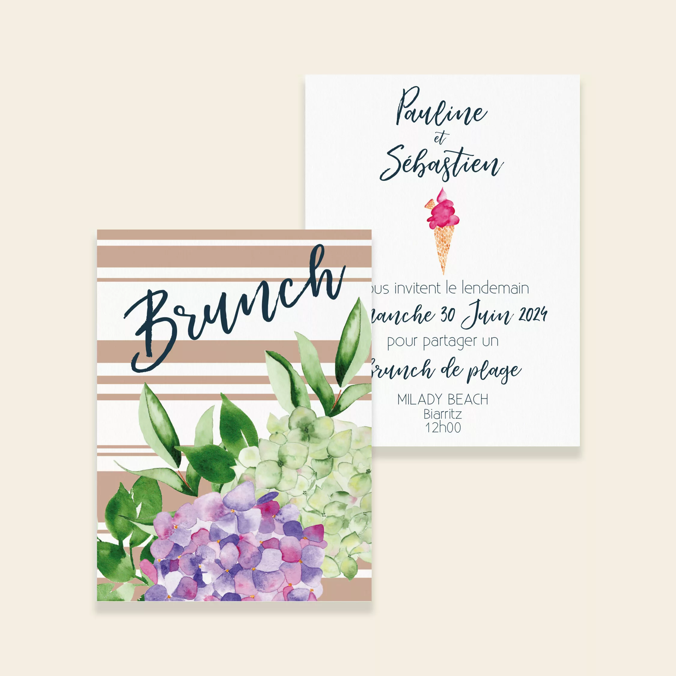 Prolongez la magie du week-end en conviant vos proches à un brunch le lendemain. Ce carton accompagne vos invitations et indique avec clarté les informations pratiques de la réception. La collection « Biarritz » de Maison Célestine célèbre la ville natale de la créatrice. Elle reflète l’ambiance unique de cette station balnéaire. Chaque création met en avant ses emblèmes : les tentes de la Grande Plage, les hortensias, une baleine, des planches de surf ou encore les palmiers. Pour compléter ces illustrations, un imprimé à rayures s’inspire du linge basque traditionnel. Cette touche apporte couleur et raffinement à vos faire-parts.