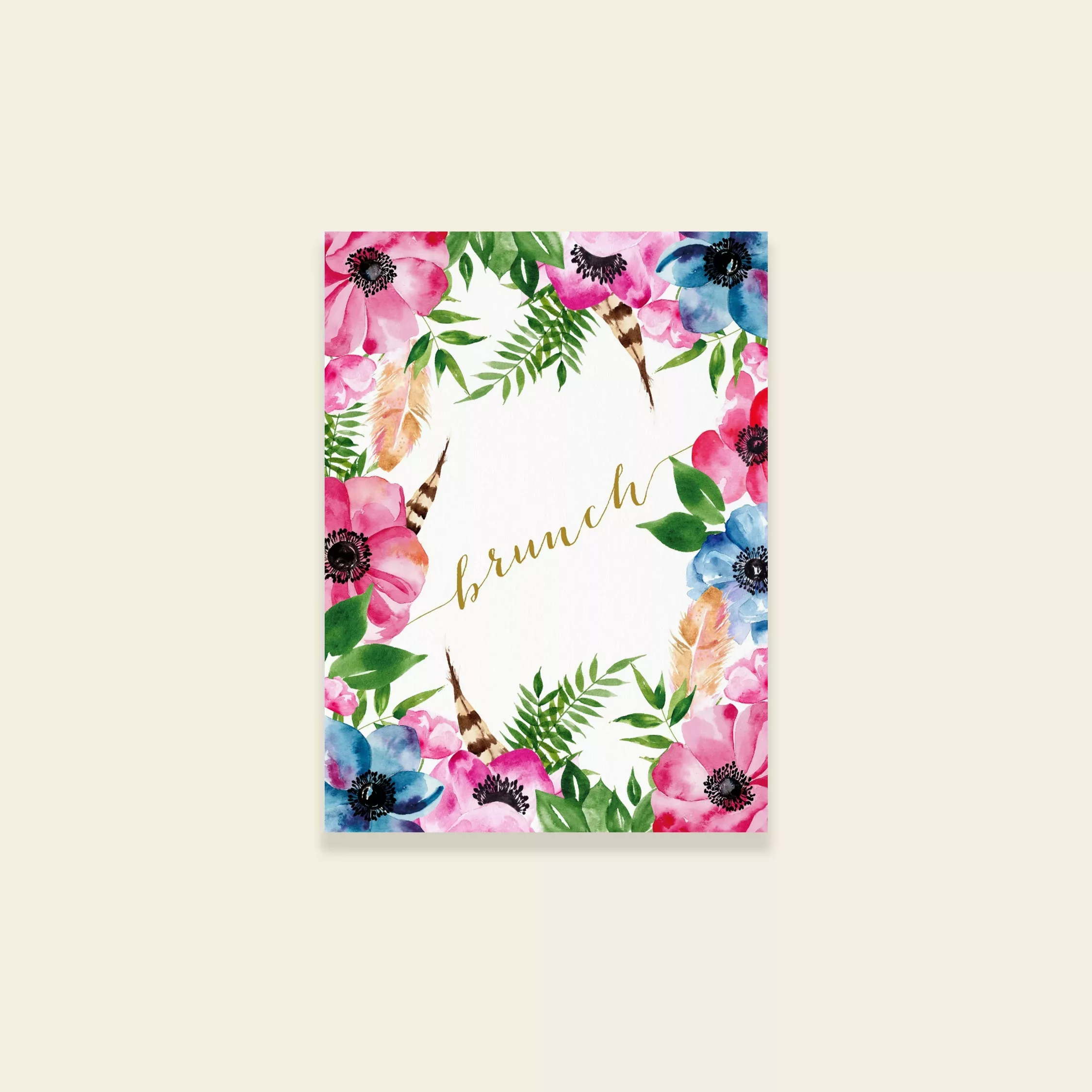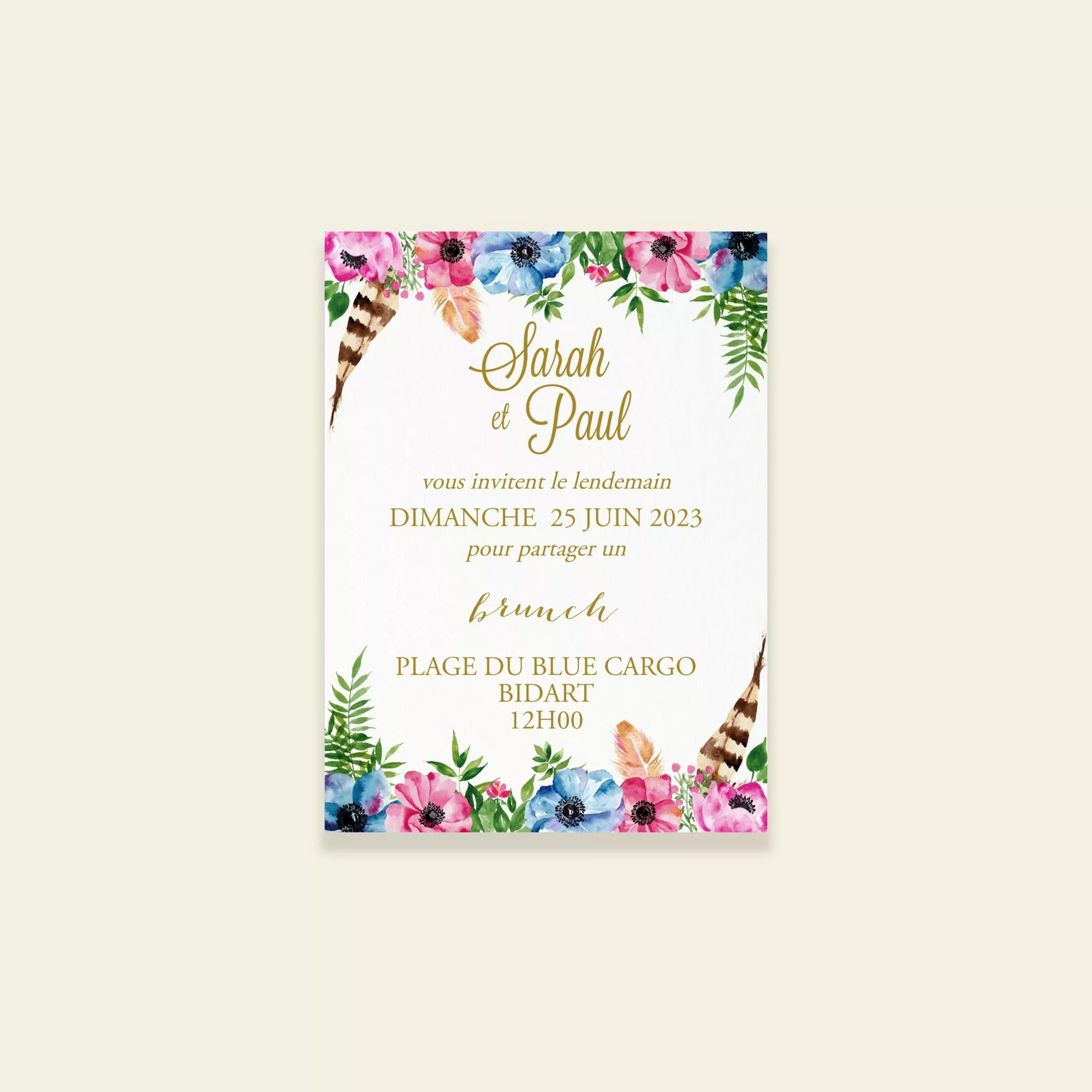 Prolongez la magie du week-end en conviant vos proches à un brunch le lendemain. Ce carton accompagne vos invitations et indique avec clarté les informations pratiques de la réception. La collection Bohowild de Maison Célestine célèbre l’esprit libre et naturel des mariages bohèmes. Entièrement peinte à la main à l’aquarelle dans notre studio, elle mêle avec finesse fleurs sauvages, feuillages délicats, plumes et bois de cerf. Chaque élément a été pensé pour créer une ambiance douce, poétique et un brin sauvage, fidèle à l’esprit bohème.