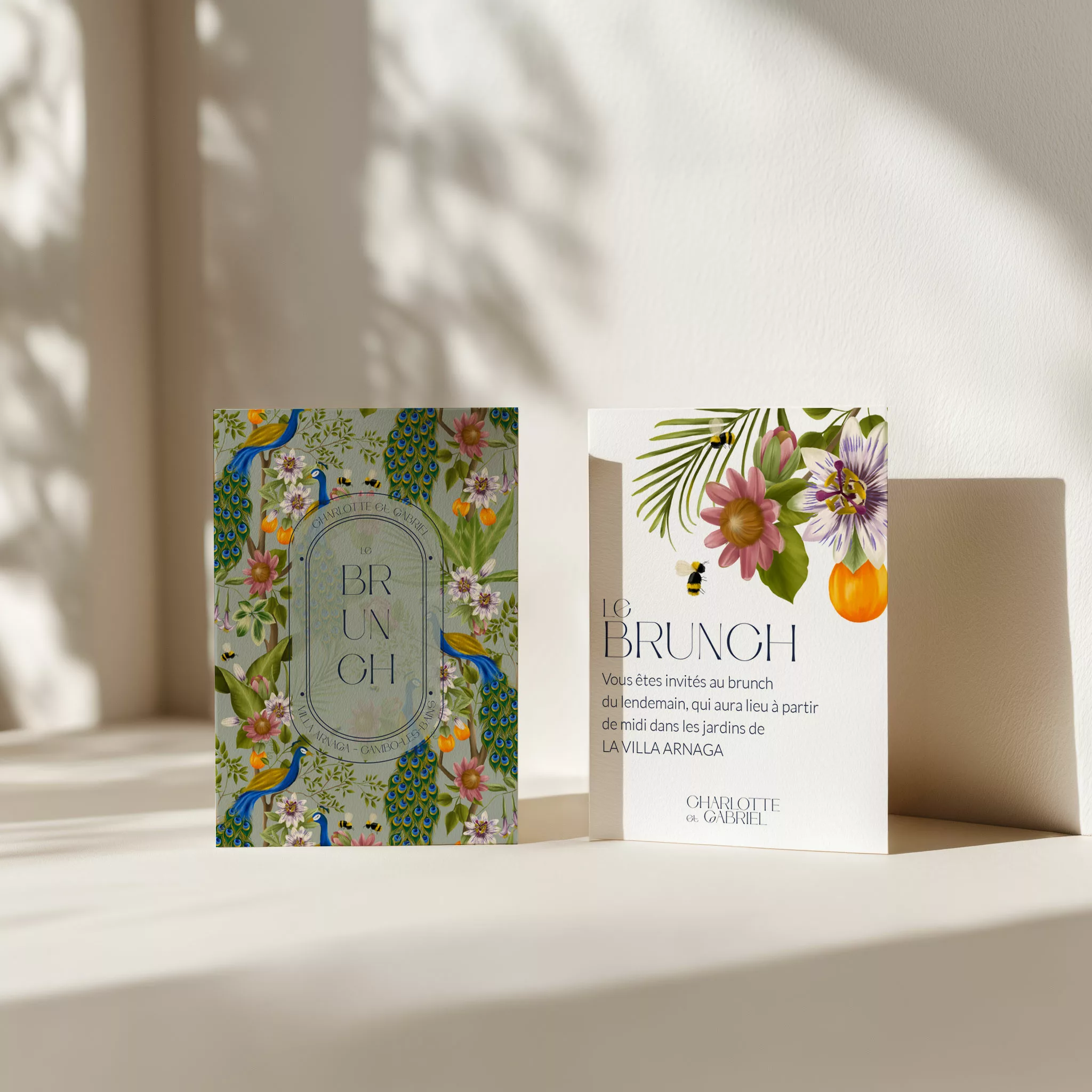 Prolongez la magie du week-end en conviant vos proches à un brunch le lendemain. Ce carton accompagne vos invitations et indique avec clarté les informations pratiques de la réception. La collection « Peacock Garden » de Maison Célestine vous plonge dans un univers où l’exotisme rencontre l’élégance. Inspirée par la beauté vibrante des plumes de paon et des jardins luxuriants, cette papeterie de mariage crée une atmosphère colorée et raffinée. Ainsi, chaque invitation capture la magie d’un événement unique et inoubliable. Chaque création est réalisée à la main dans notre atelier, avec un soin particulier pour les détails et les harmonies de couleurs. De plus, les motifs de paon et les fleurs tropicales s’entrelacent pour offrir une touche originale et sophistiquée. Par conséquent, vos faire-part, menus et cartes de remerciement reflètent votre personnalité tout en racontant votre histoire.
