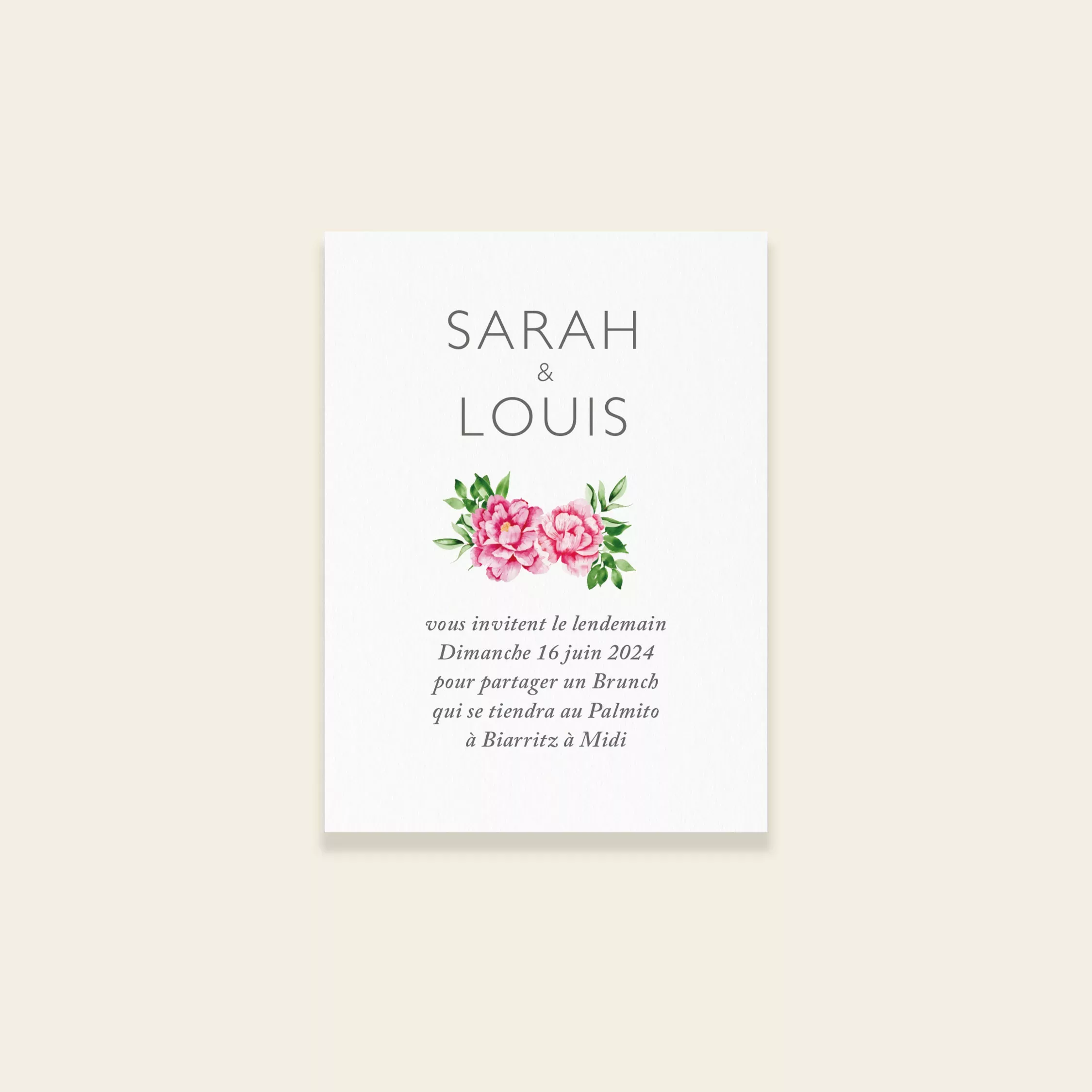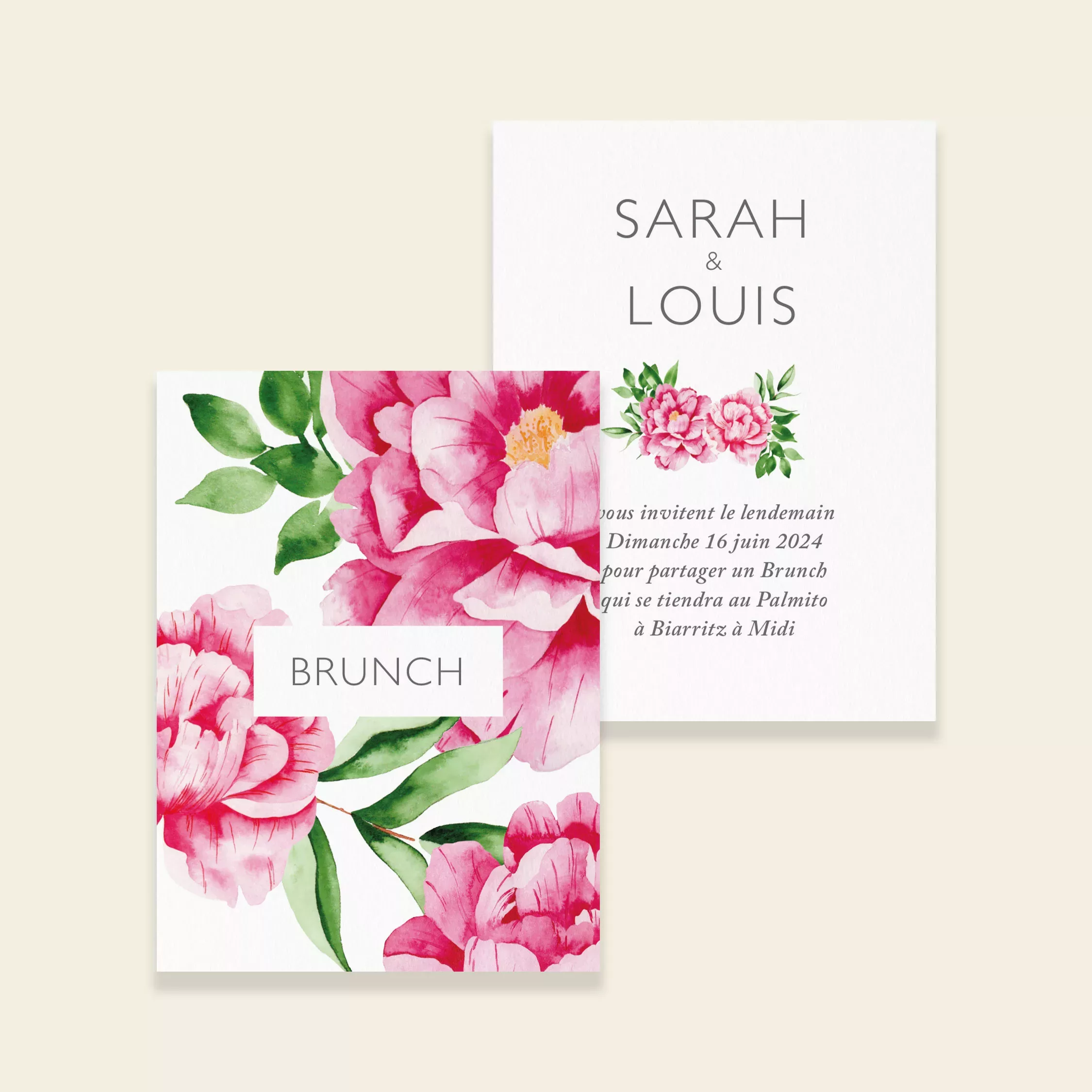 Prolongez la magie du week-end en conviant vos proches à un brunch le lendemain. Ce carton accompagne vos invitations et indique avec clarté les informations pratiques de la réception. La collection « Pivoines Romantiques » de Maison Célestine célèbre la délicatesse et la poésie des fleurs. Inspirée d’un jardin de pivoines, symbole de romance et de légendes anciennes, elle apporte une touche florale et raffinée à votre mariage. Ainsi, chaque invitation évoque la douceur d’un événement intime et élégant. Toutes les créations sont peintes à la main par la créatrice, avec un souci minutieux du détail. De plus, la typographie simple et sobre met en valeur les illustrations sans les alourdir. Par conséquent, la papeterie de mariage reste à la fois poétique et lisible, idéale pour vos invités.