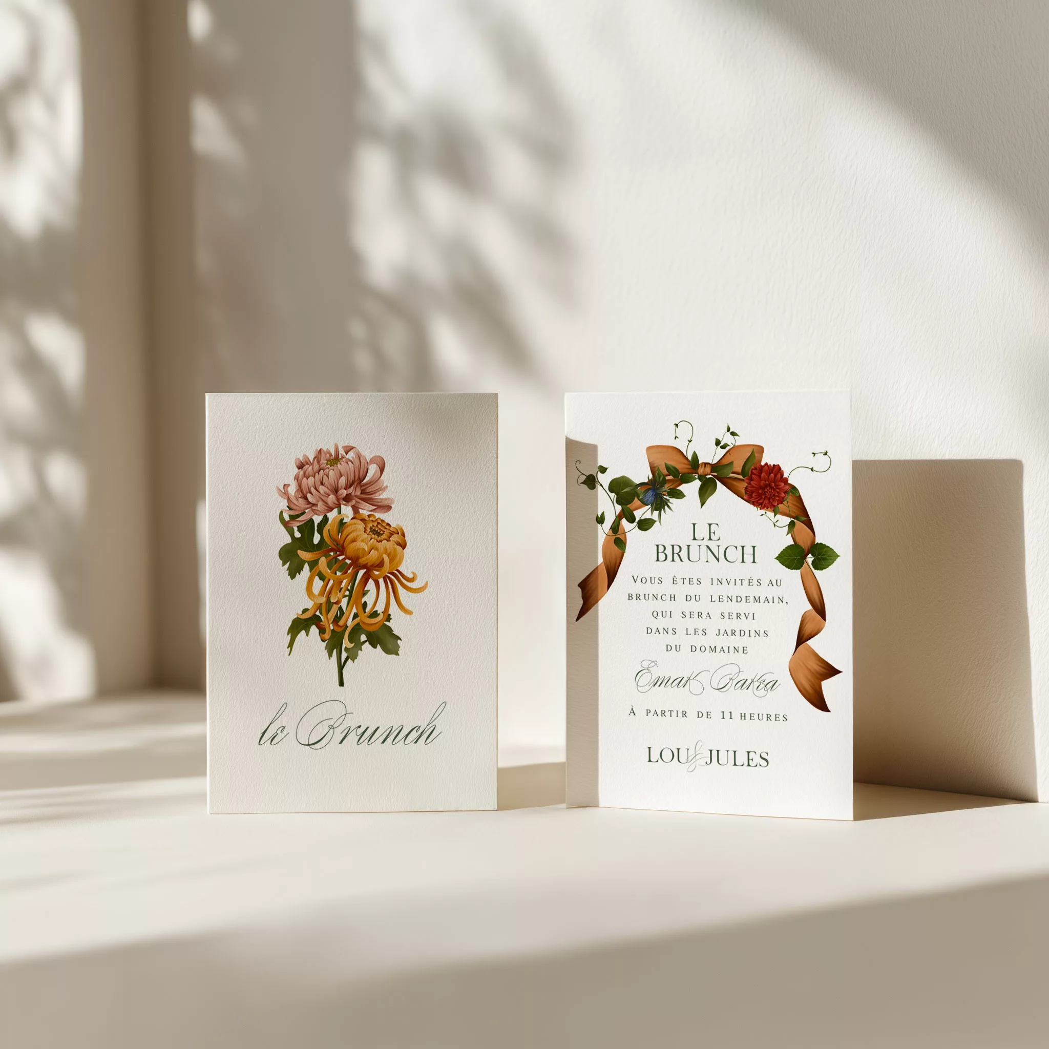 Prolongez la magie du week-end en conviant vos proches à un brunch le lendemain. Ce carton accompagne vos invitations et indique avec clarté les informations pratiques de la réception. Ce modèle rend hommage à la beauté de la saison à travers des illustrations de fruits et de fleurs d’automne, peintes à la main. Ses teintes chaudes et son style raffiné créent une ambiance poétique et harmonieuse, parfaite pour un mariage d’automne. Pour une papeterie cohérente et pleine de charme, associez-le aux autres éléments de la collection complète Songes d’Automne.