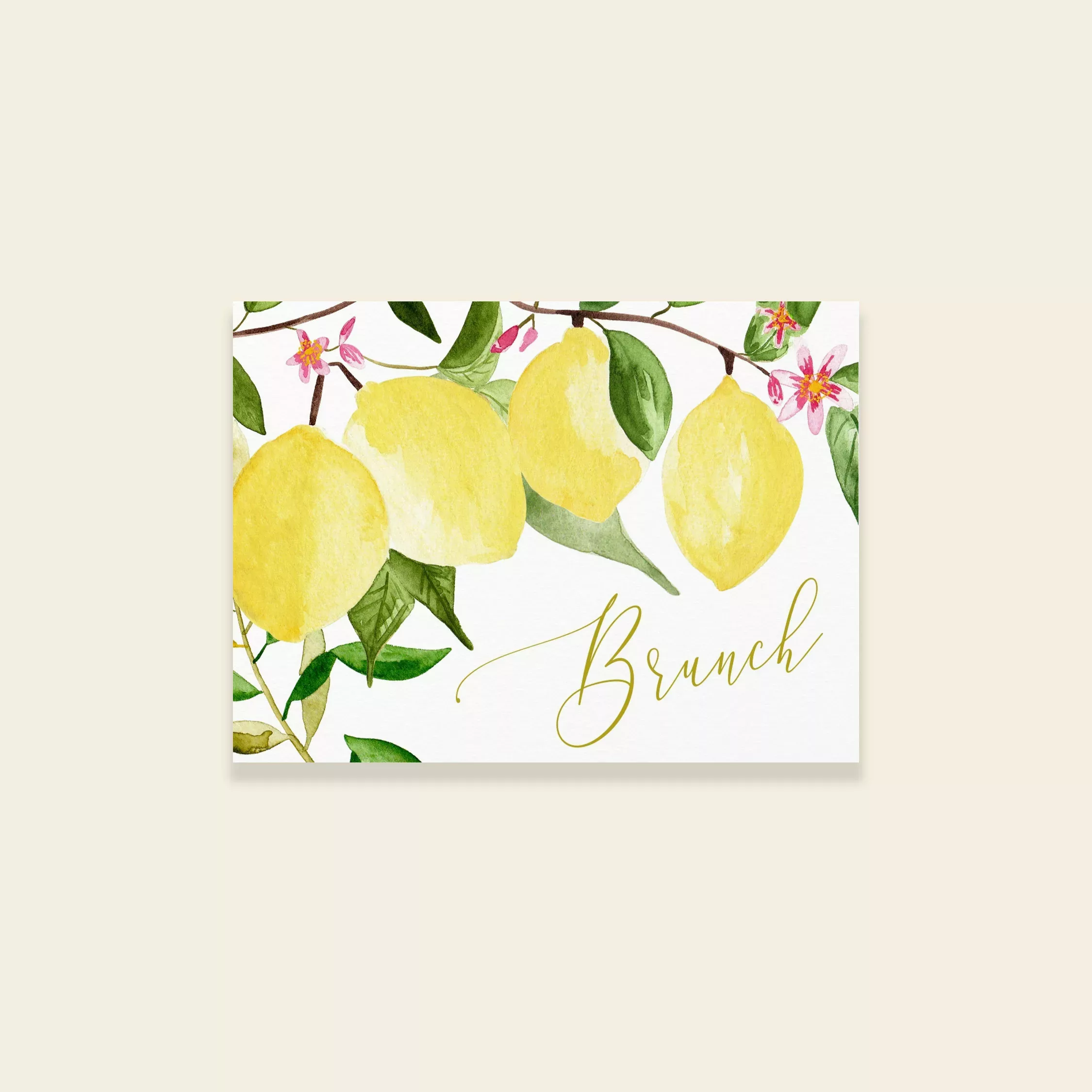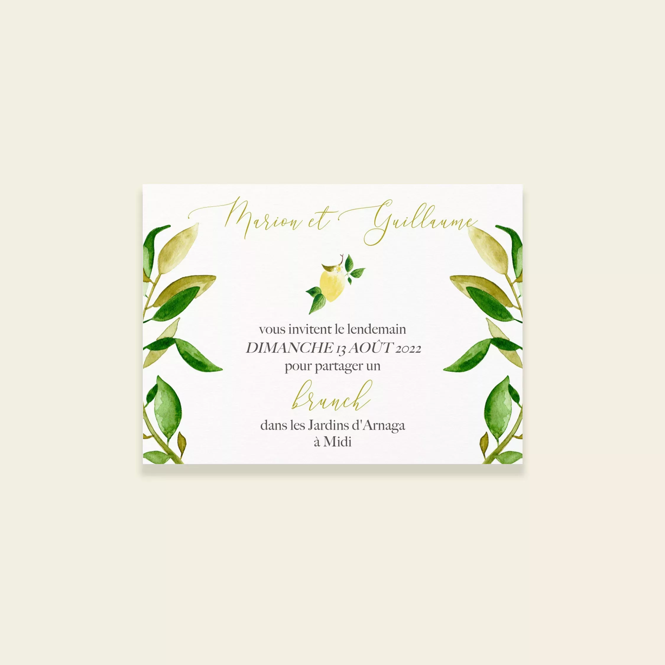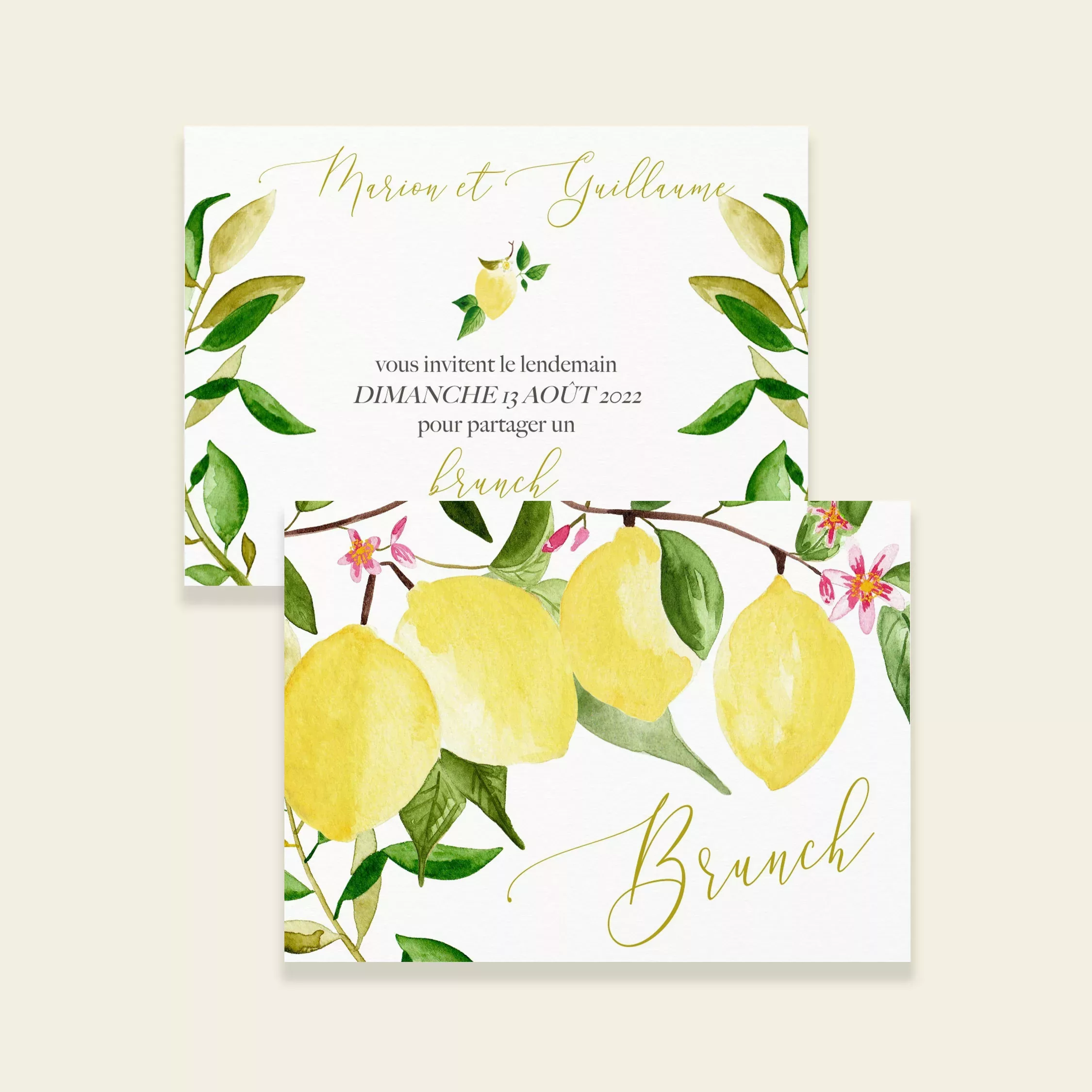 Prolongez la magie du week-end en conviant vos proches à un brunch le lendemain. Ce carton accompagne vos invitations et indique avec clarté les informations pratiques de la réception. La collection Un Amour de Citron de Maison Célestine célèbre les mariages lumineux. Peinte à la main à l’aquarelle, elle met en scène citrons et branchages. Ainsi, les tons jaune et vert évoquent le printemps et l’été. Chaque illustration apporte fraîcheur, poésie et ambiance botanique. Par ailleurs, cette collection convient parfaitement aux mariages bohèmes, naturels ou colorés.
