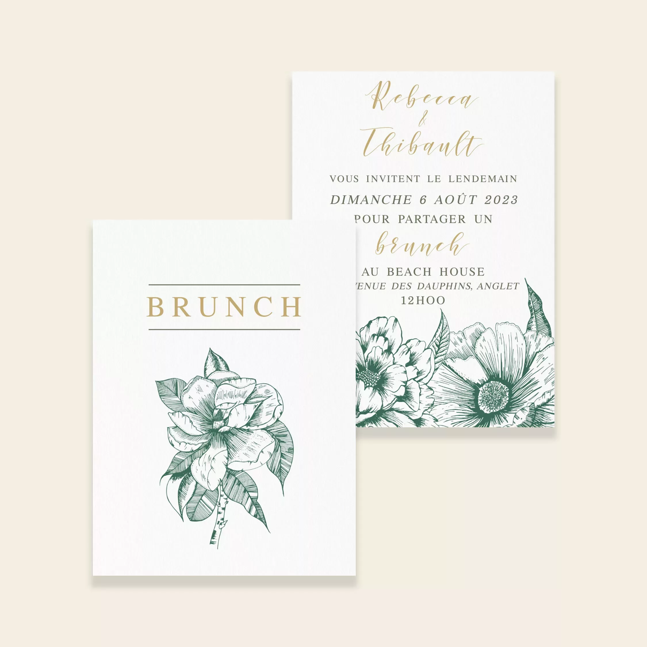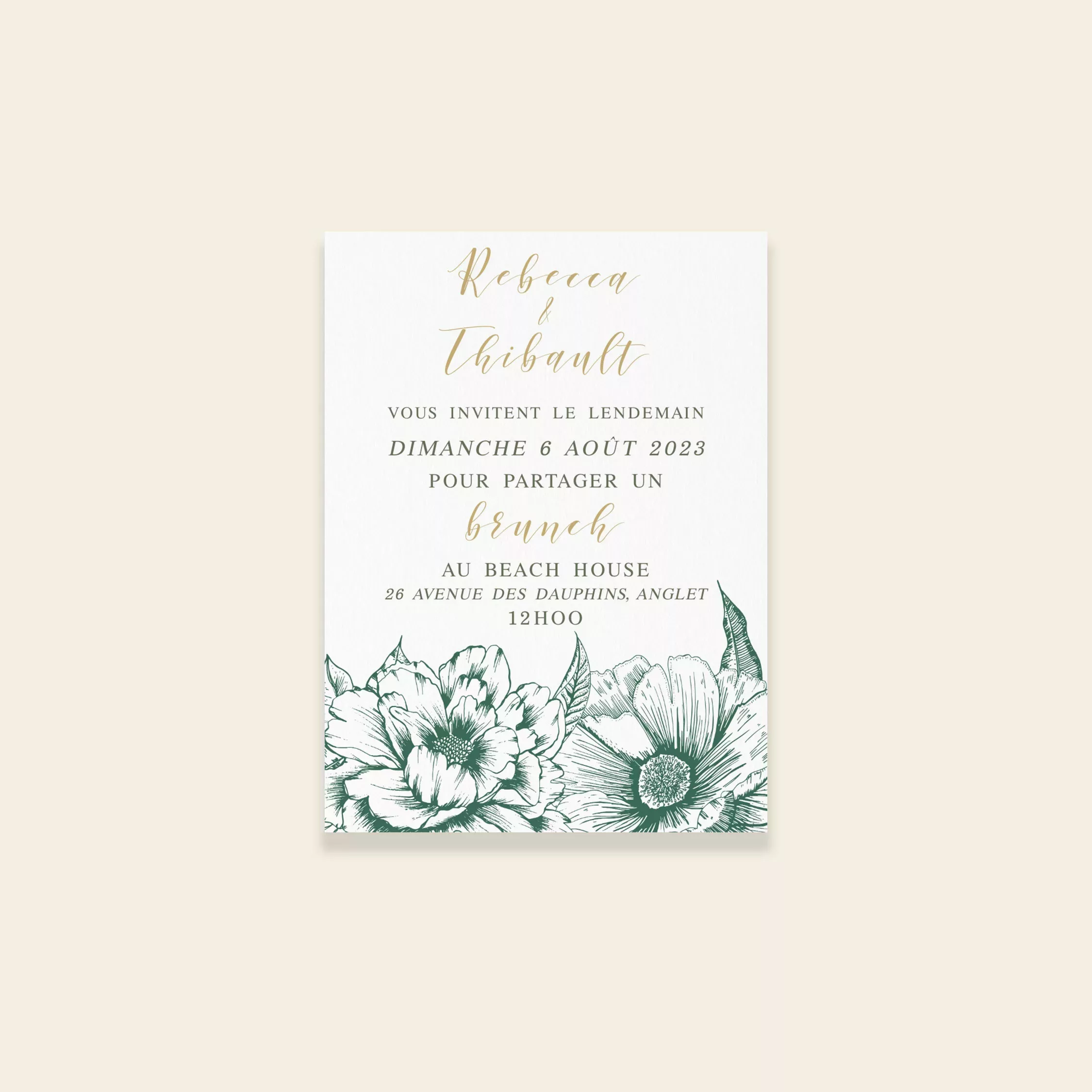Prolongez la magie du week-end en conviant vos proches à un brunch le lendemain. Ce carton accompagne vos invitations et indique avec clarté les informations pratiques de la réception. La collection Vintage Bloom, issue de la gamme mariage de Maison Célestine, s’inspire du charme du passé. Dessinée à l’encre par la créatrice, elle évoque les anciennes gravures botaniques. Les larges fleurs semblent prendre vie sur chaque pièce de papeterie. Romantique et élégante, cette collection joue avec la sophistication des détails. Sa touche de vert, subtile et moderne, apporte fraîcheur et contemporanéité. Ainsi, ancien et moderne se rencontrent pour créer une papeterie unique.