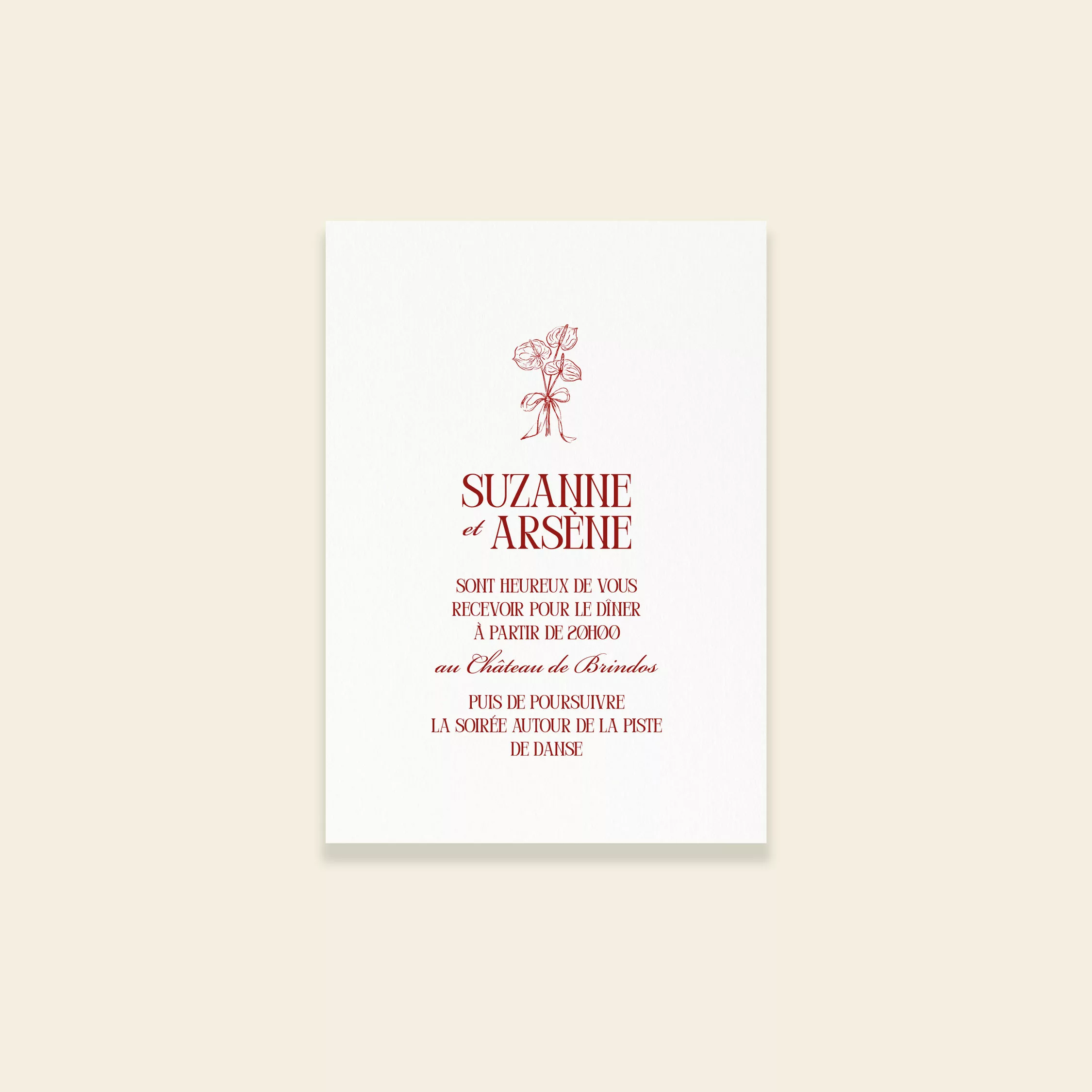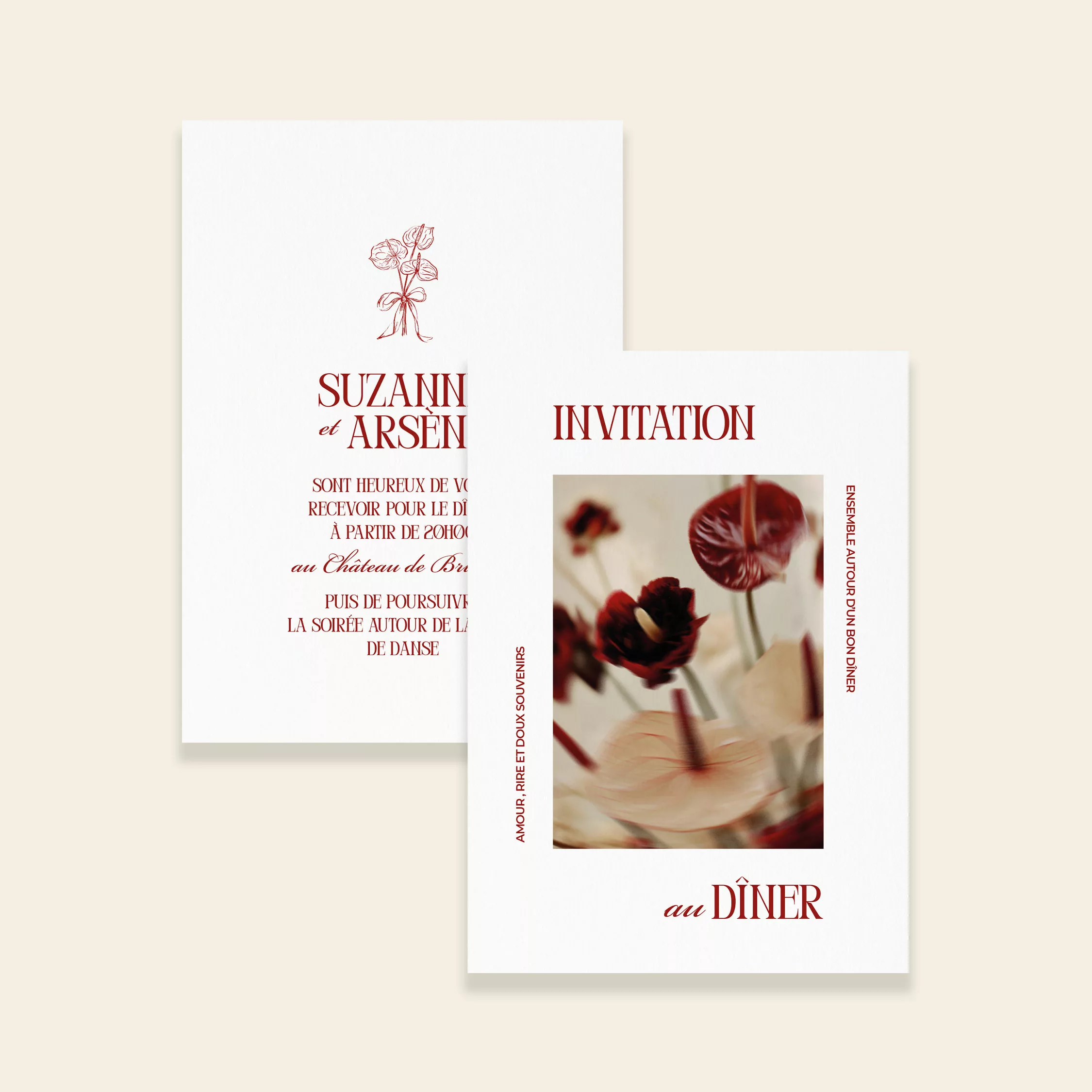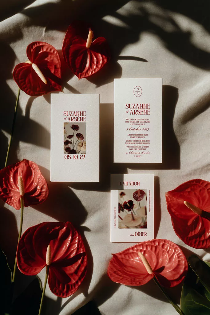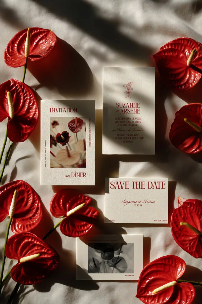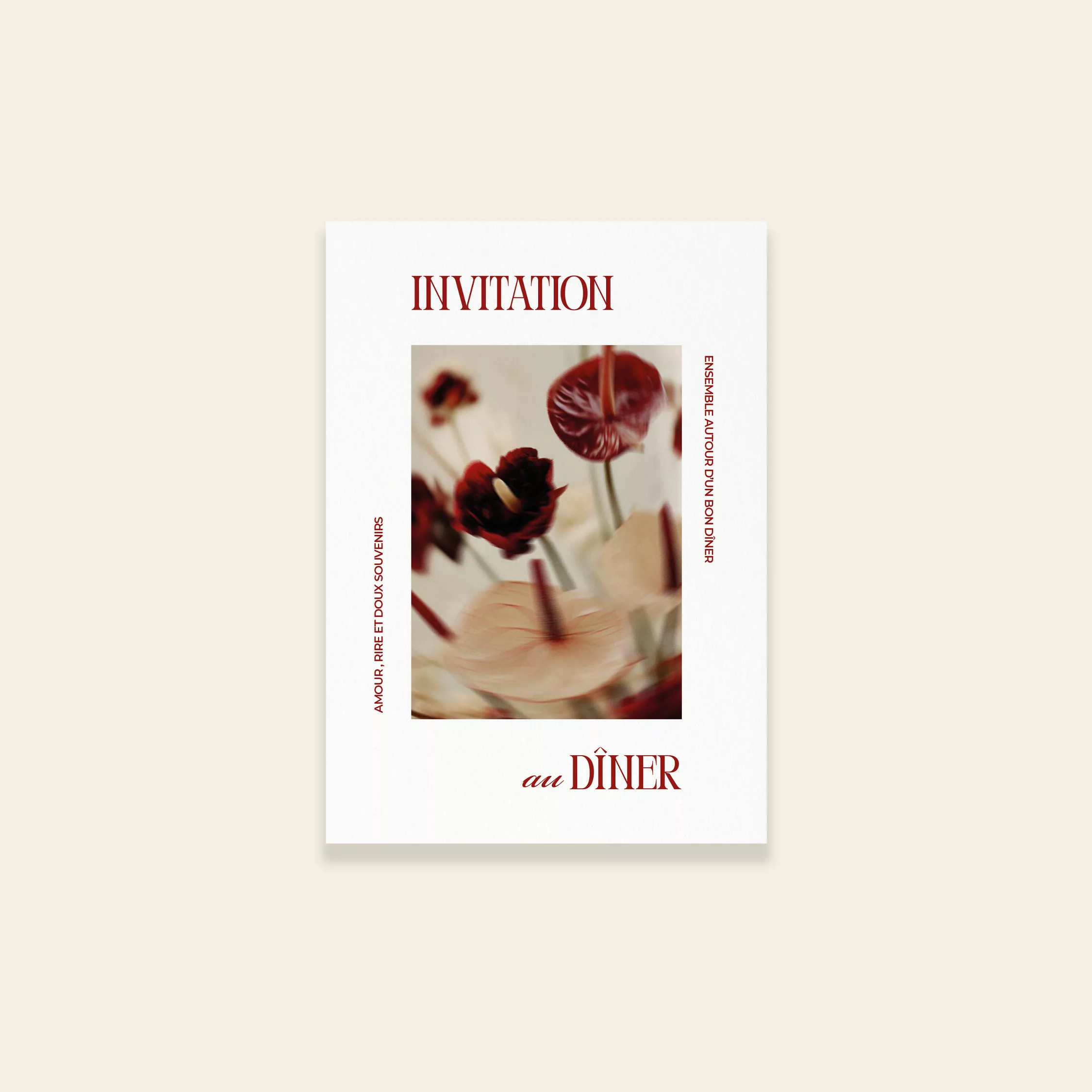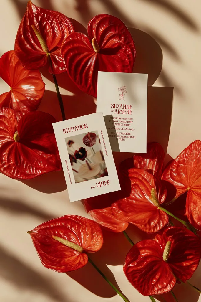 Conviez famille et amis à poursuivre la fête autour d’un dîner. Ce carton d’invitation complète votre papeterie et indique les détails pratiques du repas. La collection Anthurium s’inspire d’une atmosphère très cinématographique, entre opulence classique et modernité graphique. Elle explore un univers à la fois esthétique et émotionnel, où chaque image raconte une histoire. Ainsi, la photographie devient le nouveau langage de Maison Célestine, offrant une manière différente d’exprimer la beauté et la profondeur des émotions.