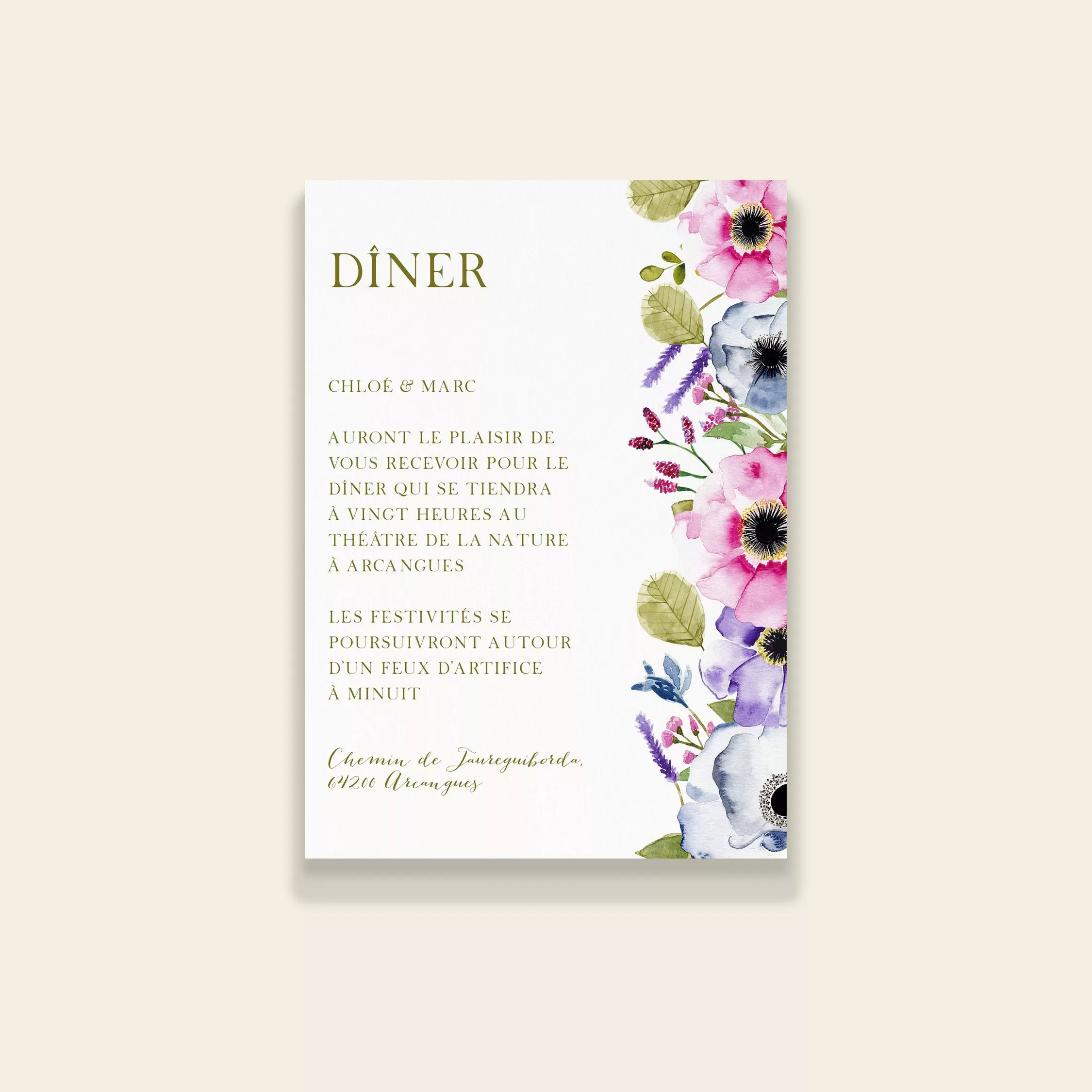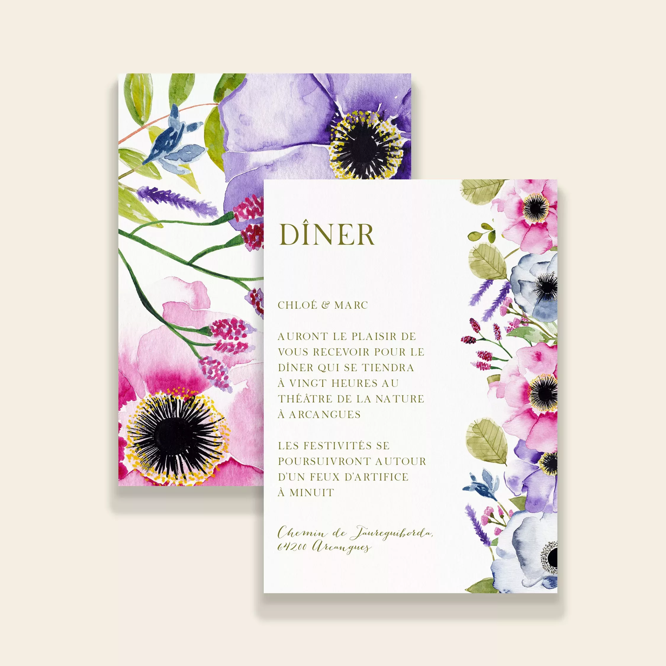 Conviez famille et amis à poursuivre la fête autour d’un dîner. Ce carton d’invitation complète votre papeterie et indique les détails pratiques du repas. La collection Balade Champêtre de Maison Célestine célèbre les mariages floraux et champêtres. Inspirée par la nature, elle met en scène fleurs des champs et feuillages sauvages. Chaque motif est peint à la main à l’aquarelle dans notre studio.
