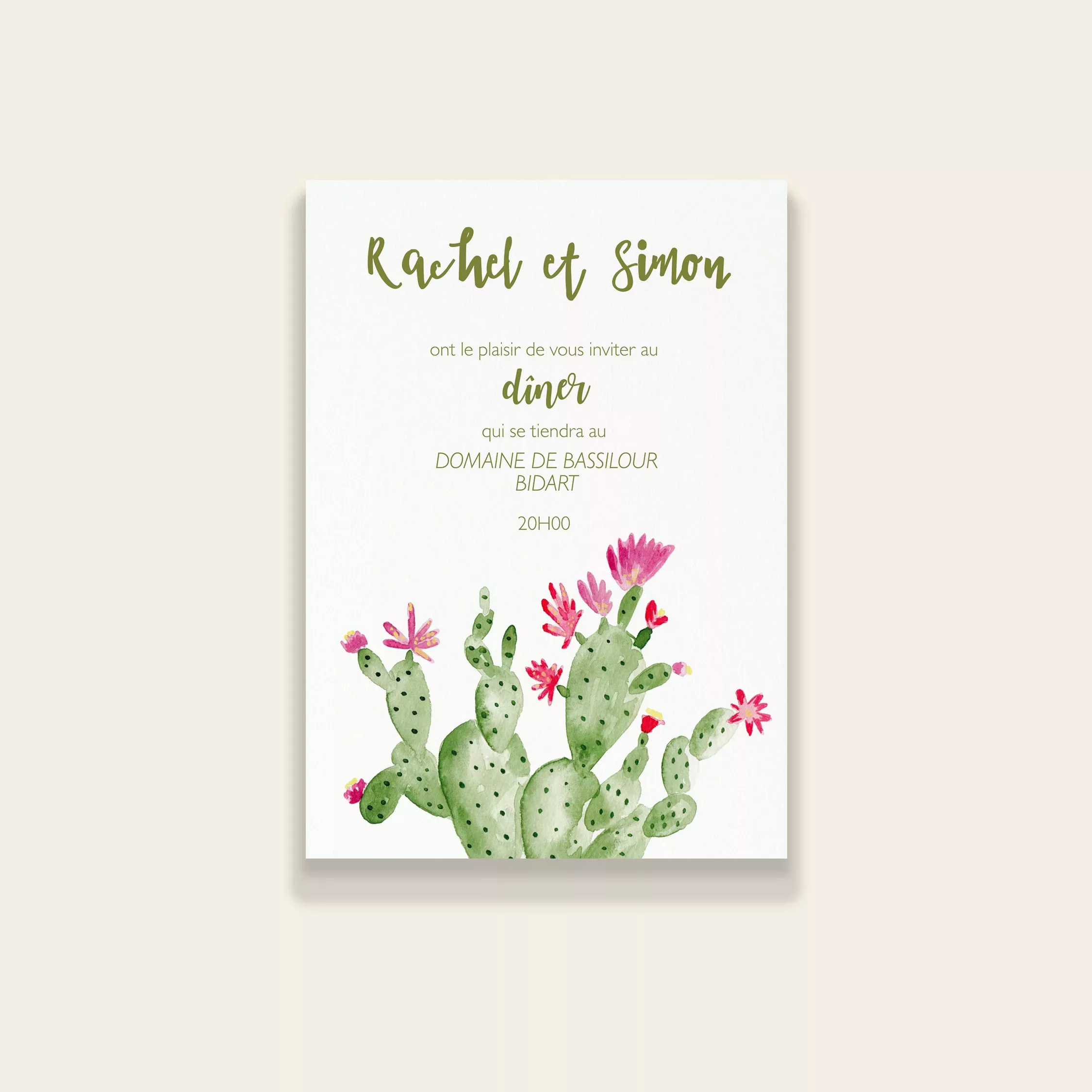 Conviez famille et amis à poursuivre la fête autour d’un dîner. Ce carton d’invitation complète votre papeterie et indique les détails pratiques du repas. La collection Cactus Garden, issue de la gamme mariage de Maison Célestine, célèbre la beauté des plantes du désert. Entièrement peinte à la main à l’aquarelle dans mon studio, elle mêle douceur, lumière et fraîcheur. Chaque illustration met en scène mes plantes favorites : les cactus. Leurs formes graphiques, associées à des nuances subtiles de vert et de rose, créent une atmosphère vivante et joyeuse. Ainsi, chaque faire-part devient une invitation à la détente et au voyage.