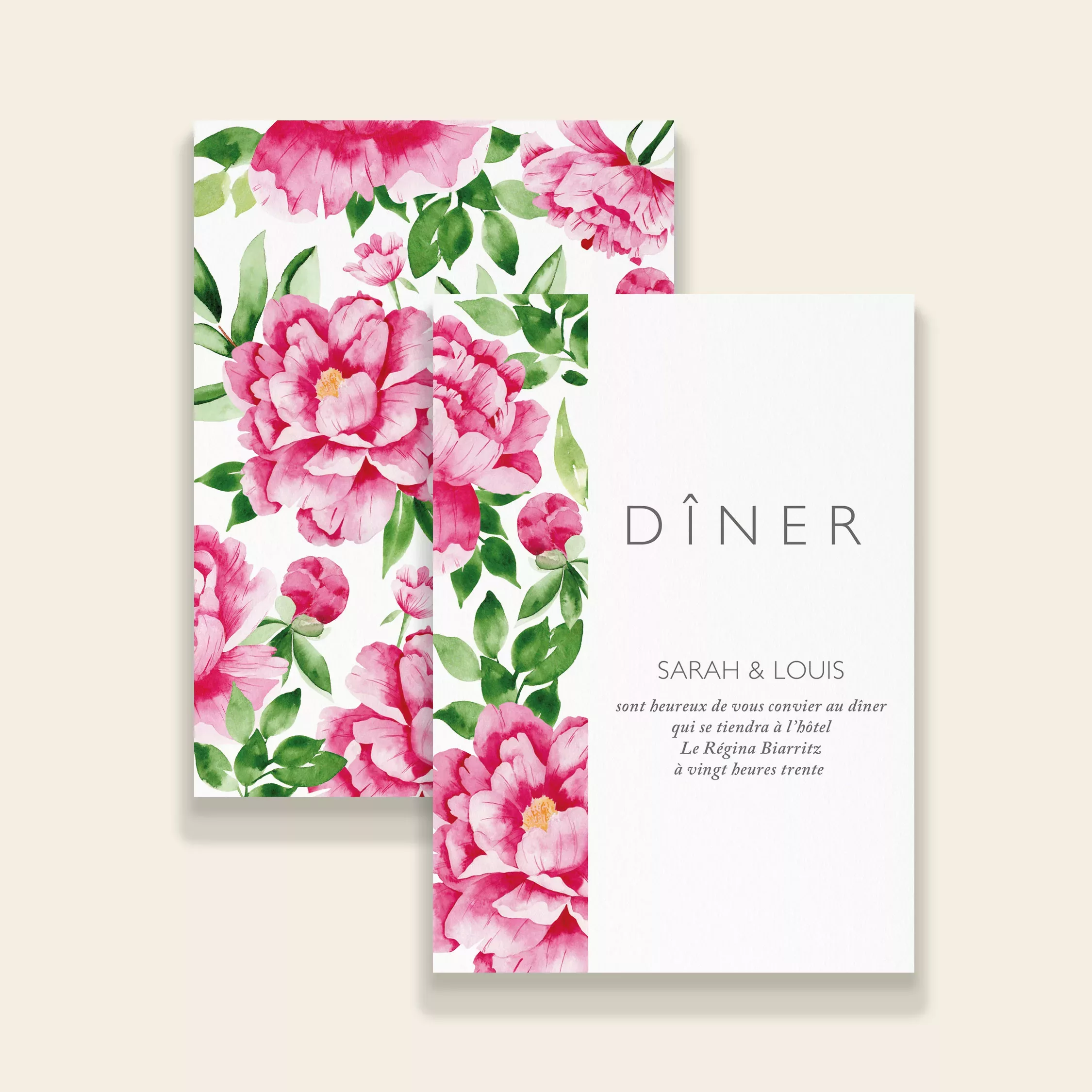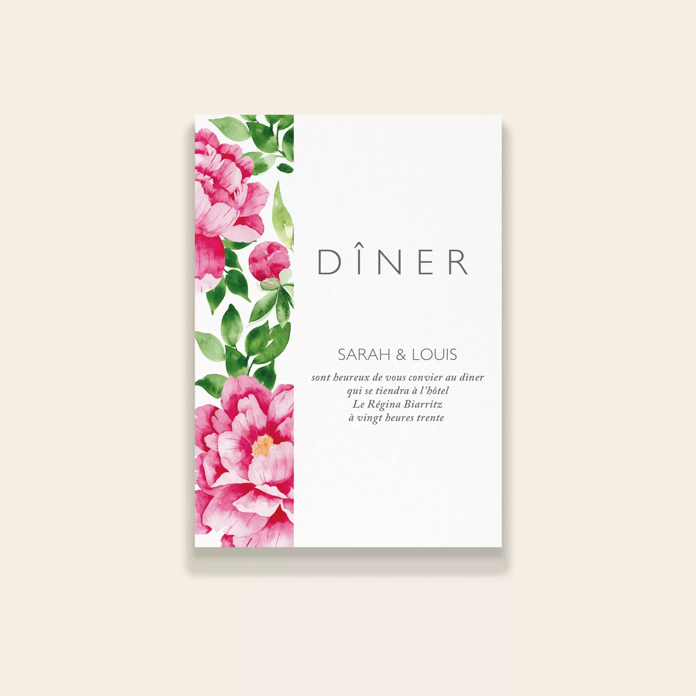 Conviez famille et amis à poursuivre la fête autour d’un dîner. Ce carton d’invitation complète votre papeterie et indique les détails pratiques du repas. La collection « Pivoines Romantiques » de Maison Célestine célèbre la délicatesse et la poésie des fleurs. Inspirée d’un jardin de pivoines, symbole de romance et de légendes anciennes, elle apporte une touche florale et raffinée à votre mariage. Ainsi, chaque invitation évoque la douceur d’un événement intime et élégant. Toutes les créations sont peintes à la main par la créatrice, avec un souci minutieux du détail. De plus, la typographie simple et sobre met en valeur les illustrations sans les alourdir. Par conséquent, la papeterie de mariage reste à la fois poétique et lisible, idéale pour vos invités.