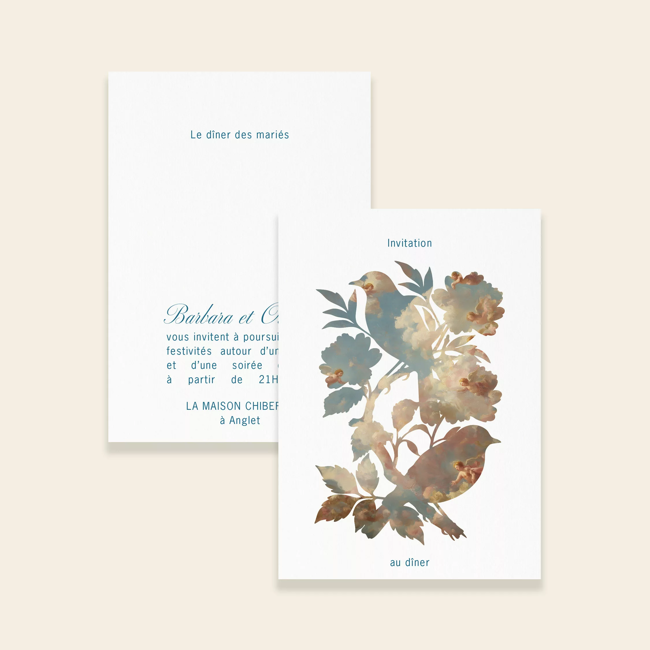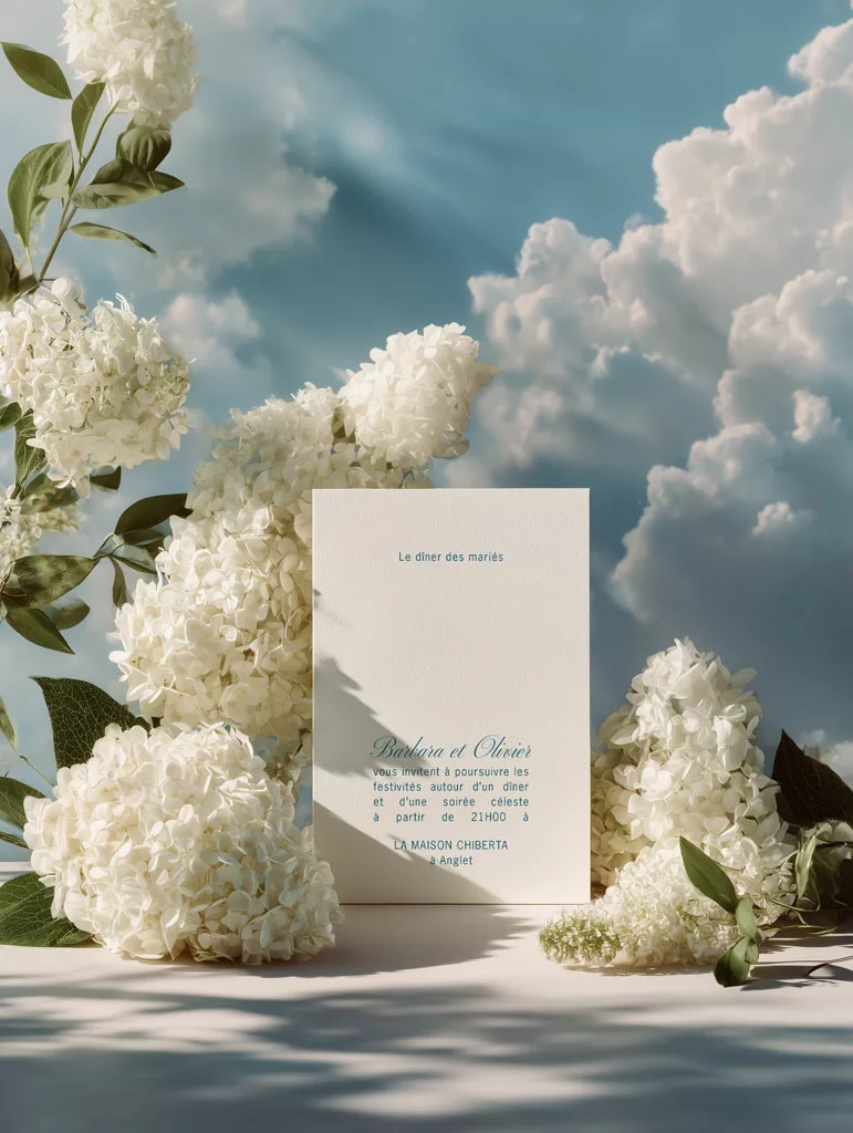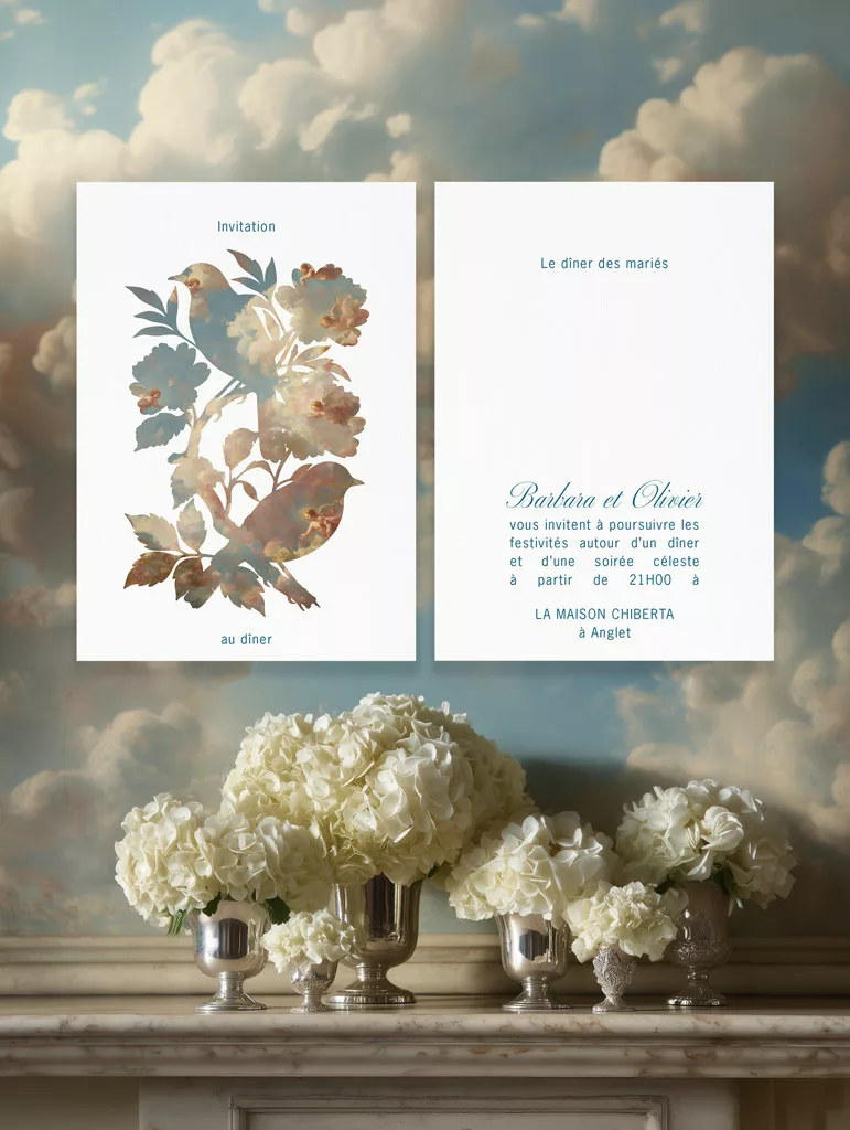 Conviez famille et amis à poursuivre la fête autour d’un dîner. Ce carton d’invitation complète votre papeterie et indique les détails pratiques du repas. La collection Sixtine s’inspire de l’esthétique Renaissance. Elle réunit des ciels peints, des nuages vaporeux et une lumière céleste qui crée une atmosphère douce et onirique. Maison Célestine y explore un univers audacieux, où les fresques anciennes dialoguent avec une vision plus contemporaine. Chaque création ouvre une parenthèse suspendue : une invitation à s’élever, à contempler et à célébrer le mariage comme une scène picturale.