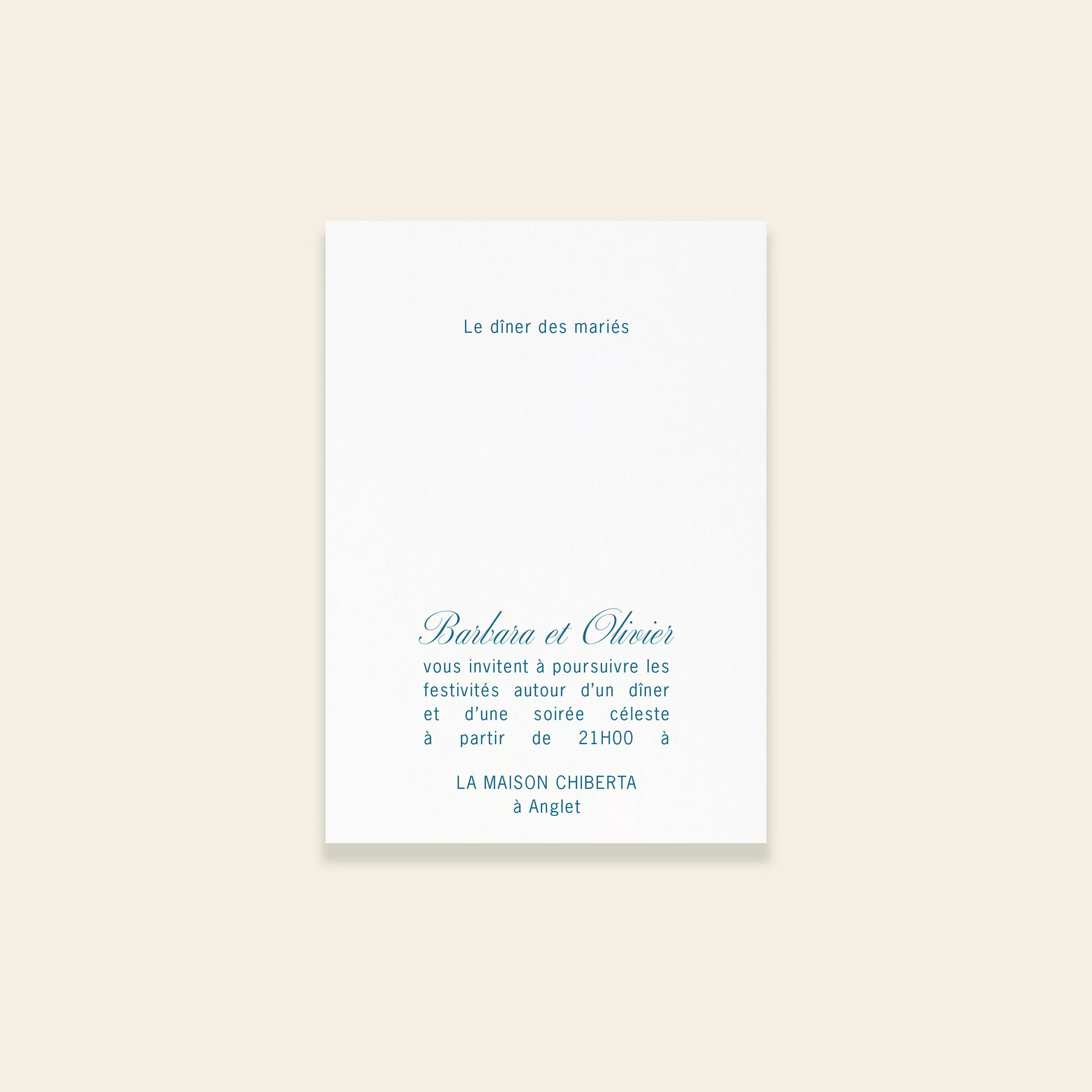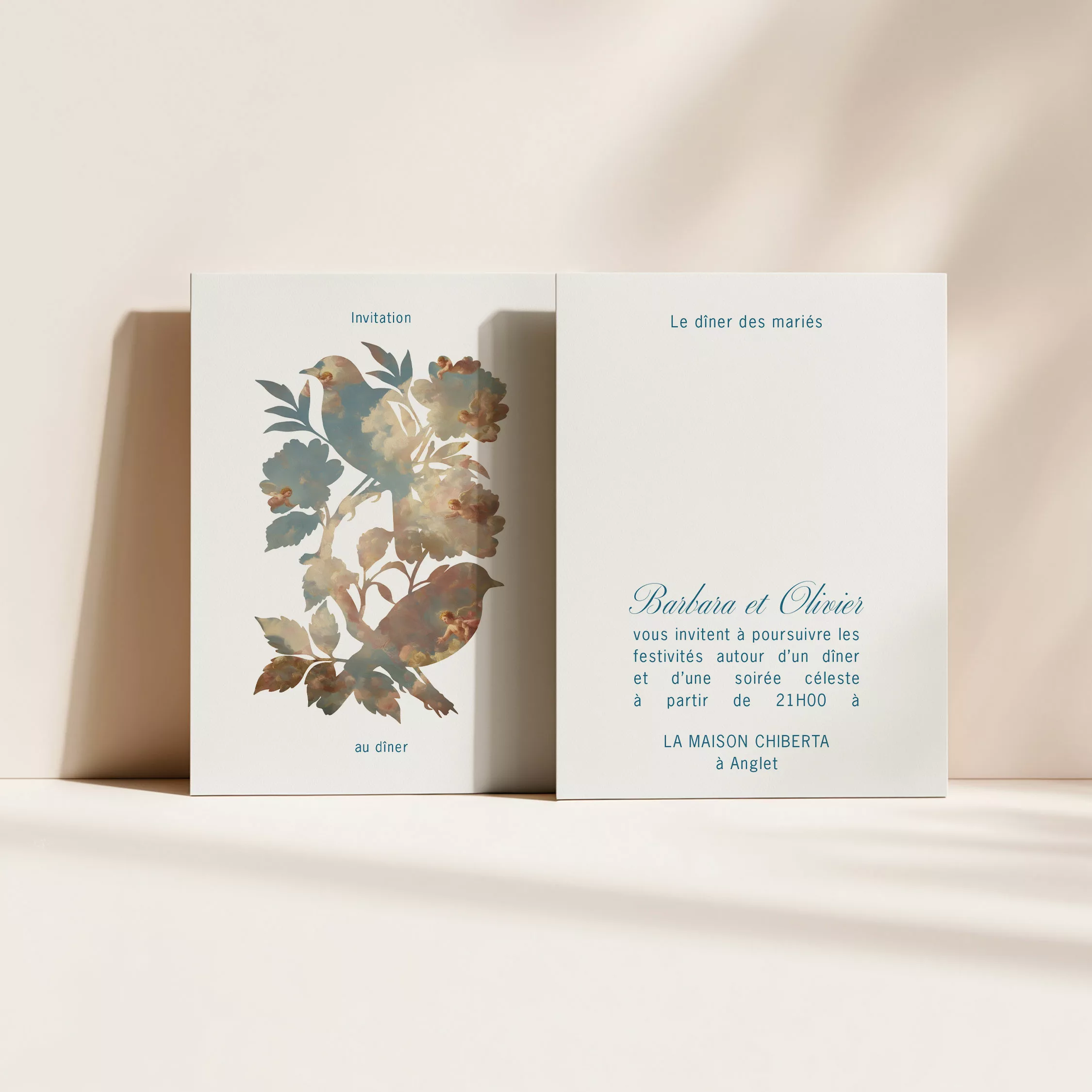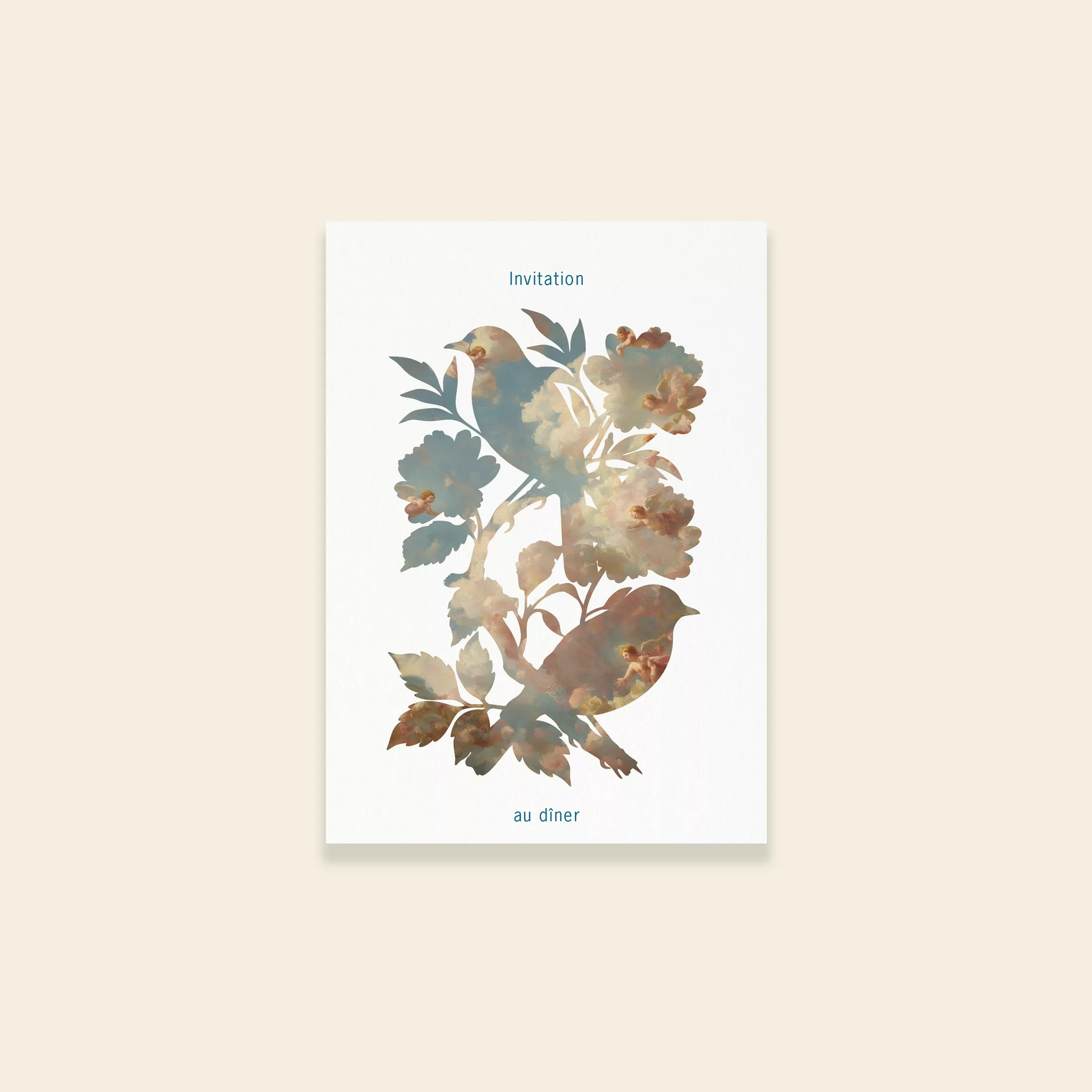 Conviez famille et amis à poursuivre la fête autour d’un dîner. Ce carton d’invitation complète votre papeterie et indique les détails pratiques du repas. La collection Sixtine s’inspire de l’esthétique Renaissance. Elle réunit des ciels peints, des nuages vaporeux et une lumière céleste qui crée une atmosphère douce et onirique. Maison Célestine y explore un univers audacieux, où les fresques anciennes dialoguent avec une vision plus contemporaine. Chaque création ouvre une parenthèse suspendue : une invitation à s’élever, à contempler et à célébrer le mariage comme une scène picturale.