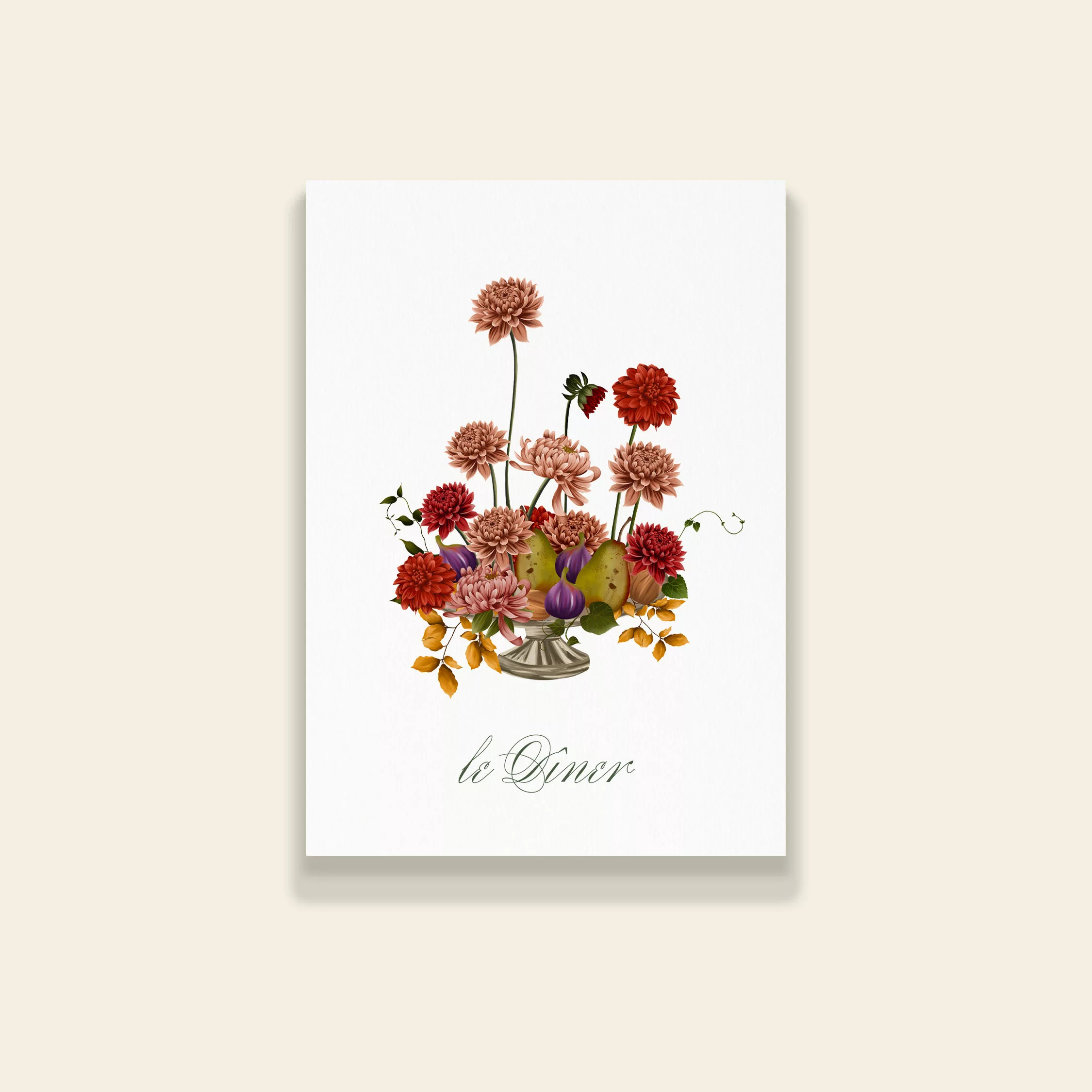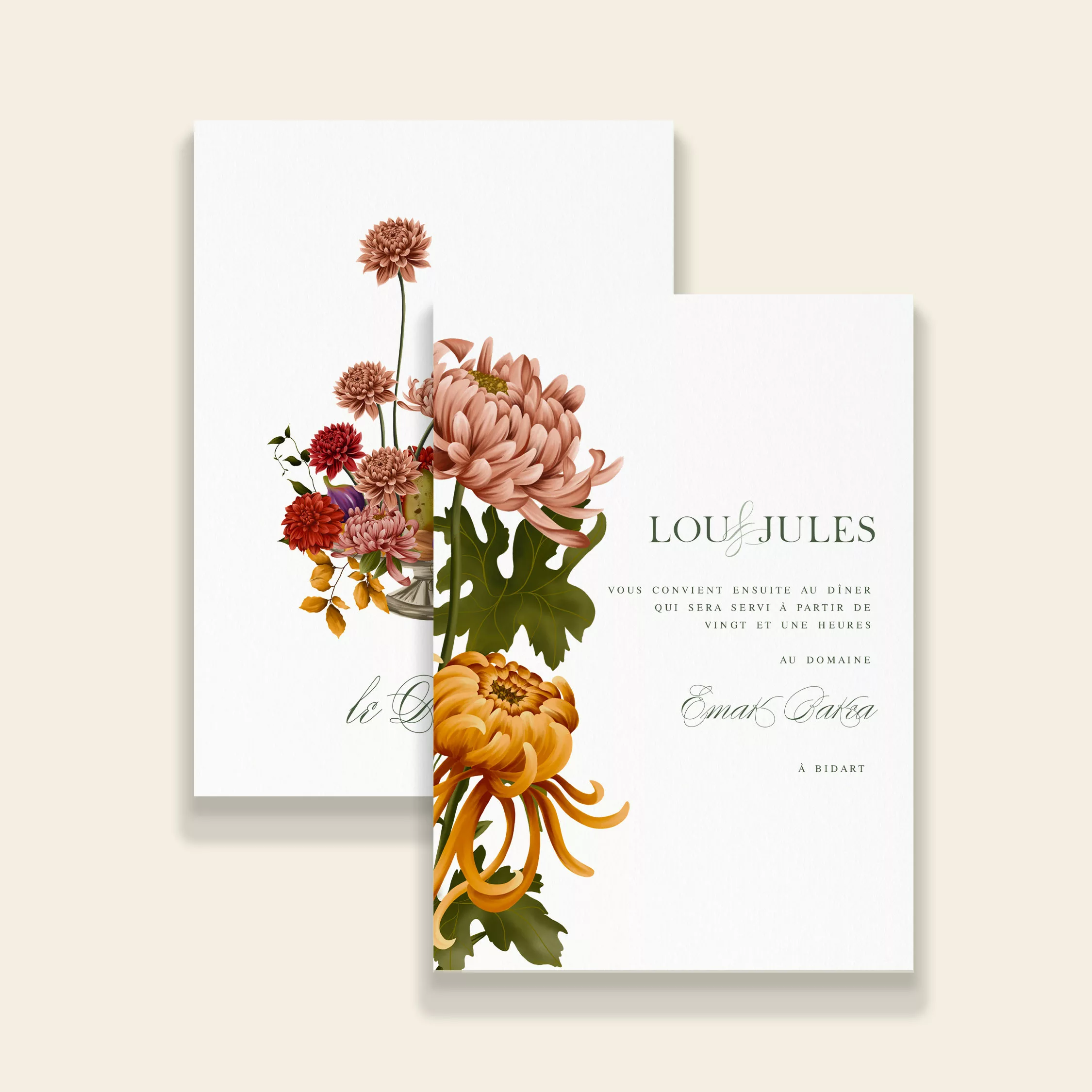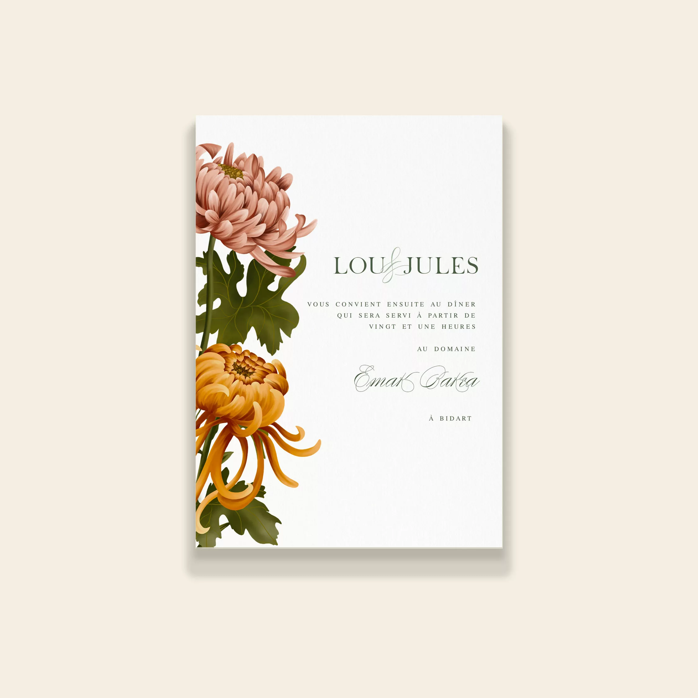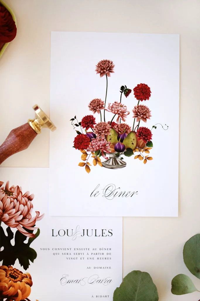 Invitez vos proches à votre dîner de mariage avec raffinement grâce au carton dîner illustré de la collection Songes d’Automne. Ce modèle rend hommage à la richesse visuelle de la saison, mêlant fruits et fleurs dans une composition chaleureuse et poétique. Élégant et harmonieux, ce carton dîner crée une ambiance raffinée, idéale pour une réception de mariage automnale. Il s’accorde parfaitement avec le reste de la papeterie Songes d’Automne, pour une table cohérente et pleine de charme, où chaque détail raconte votre histoire.