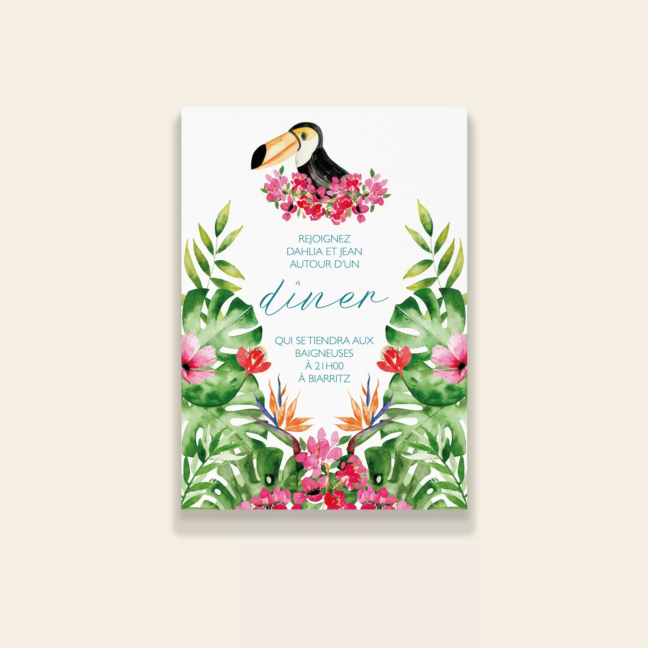 Conviez famille et amis à poursuivre la fête autour d’un dîner. Ce carton d’invitation complète votre papeterie et indique les détails pratiques du repas.La collection Tropical Pop de Maison Célestine propose une papeterie de mariage colorée et exotique. Chaque faire-part, menu ou carte de remerciement est peint à la main pour créer un univers unique. Cette collection s’inspire de la jungle et de la végétation tropicale. Palmiers, fleurs colorées et ananas se mêlent à une typographie moderne et calligraphiée. Le résultat est frais, tendance et facile à personnaliser.