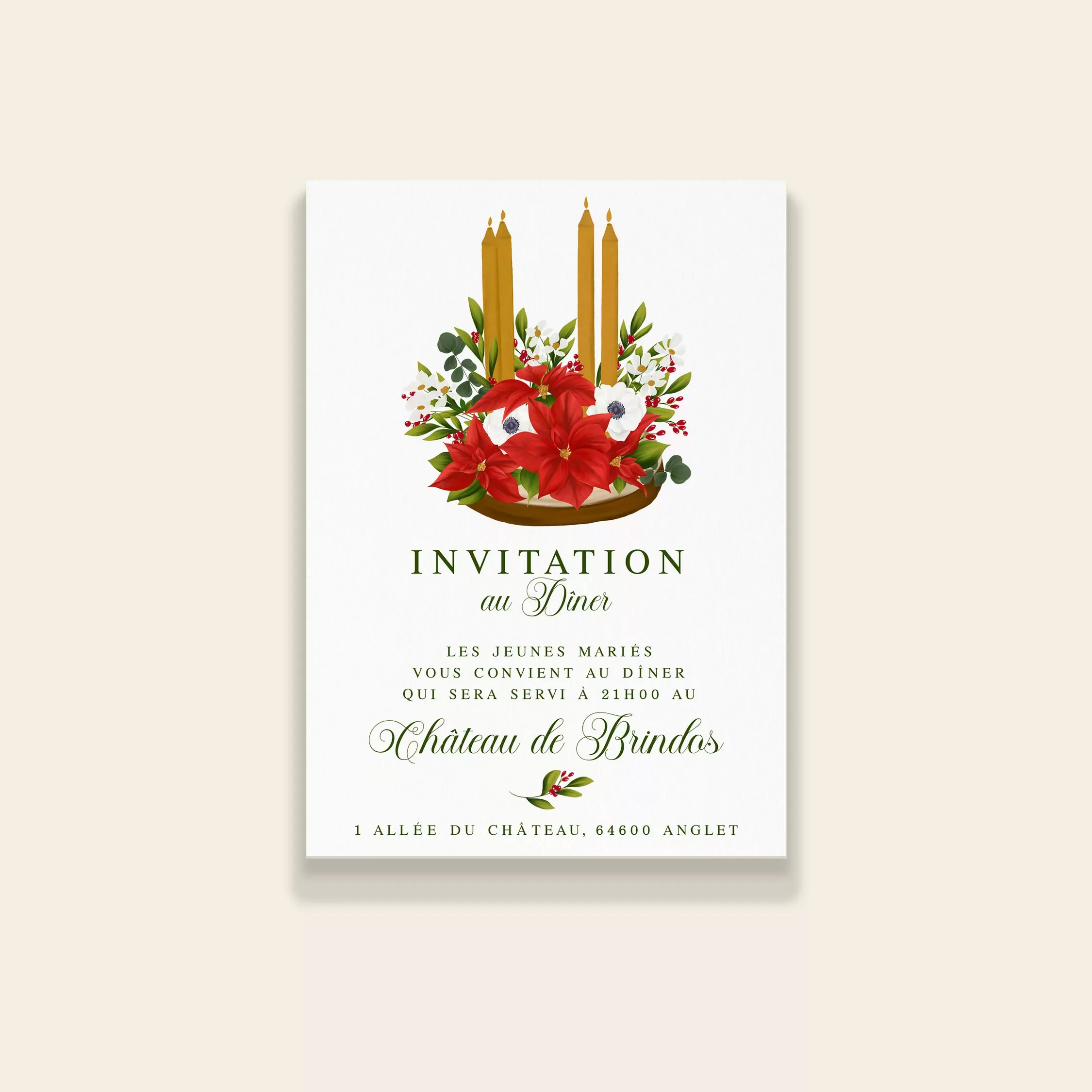Conviez famille et amis à poursuivre la fête autour d’un dîner. Ce carton d’invitation complète votre papeterie et indique les détails pratiques du repas. Découvrez la collection « Un Conte de Noël » de Maison Célestine. Inspirée par l’hiver et les fêtes de fin d’année, cette papeterie mêle tradition et magie. Poinsettias, anges, casse-noisette et imprimés tartan apportent une atmosphère chaleureuse et festive à vos invitations.