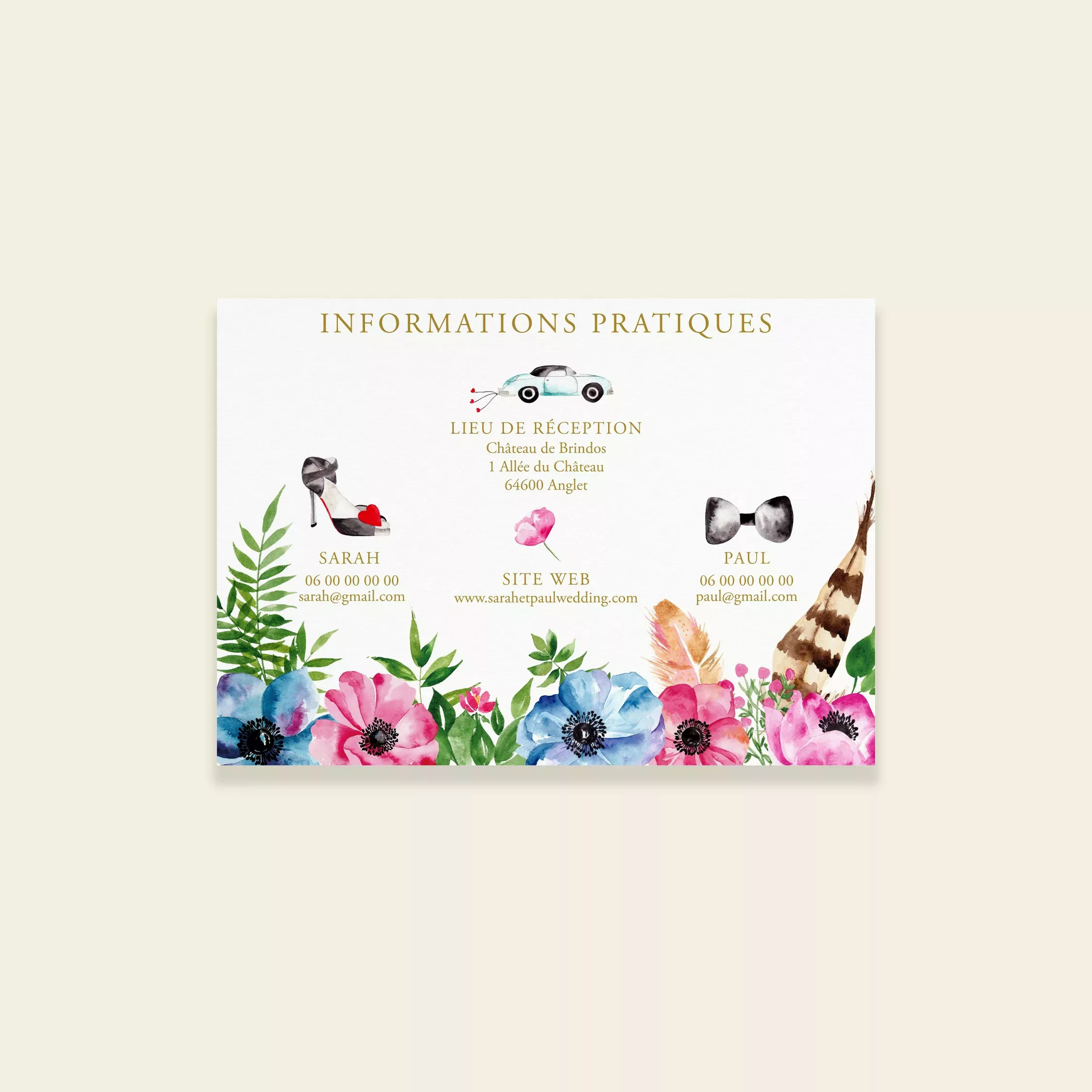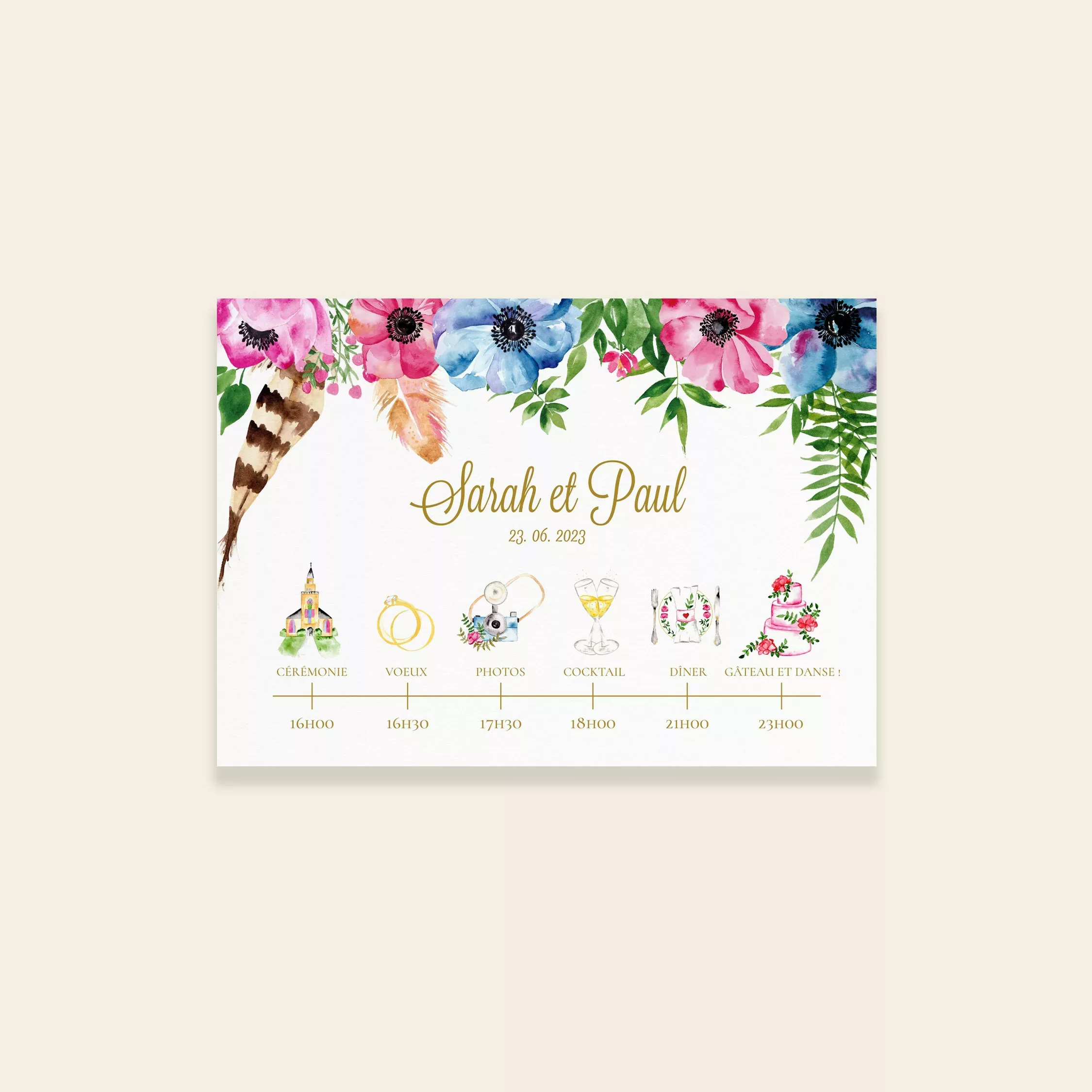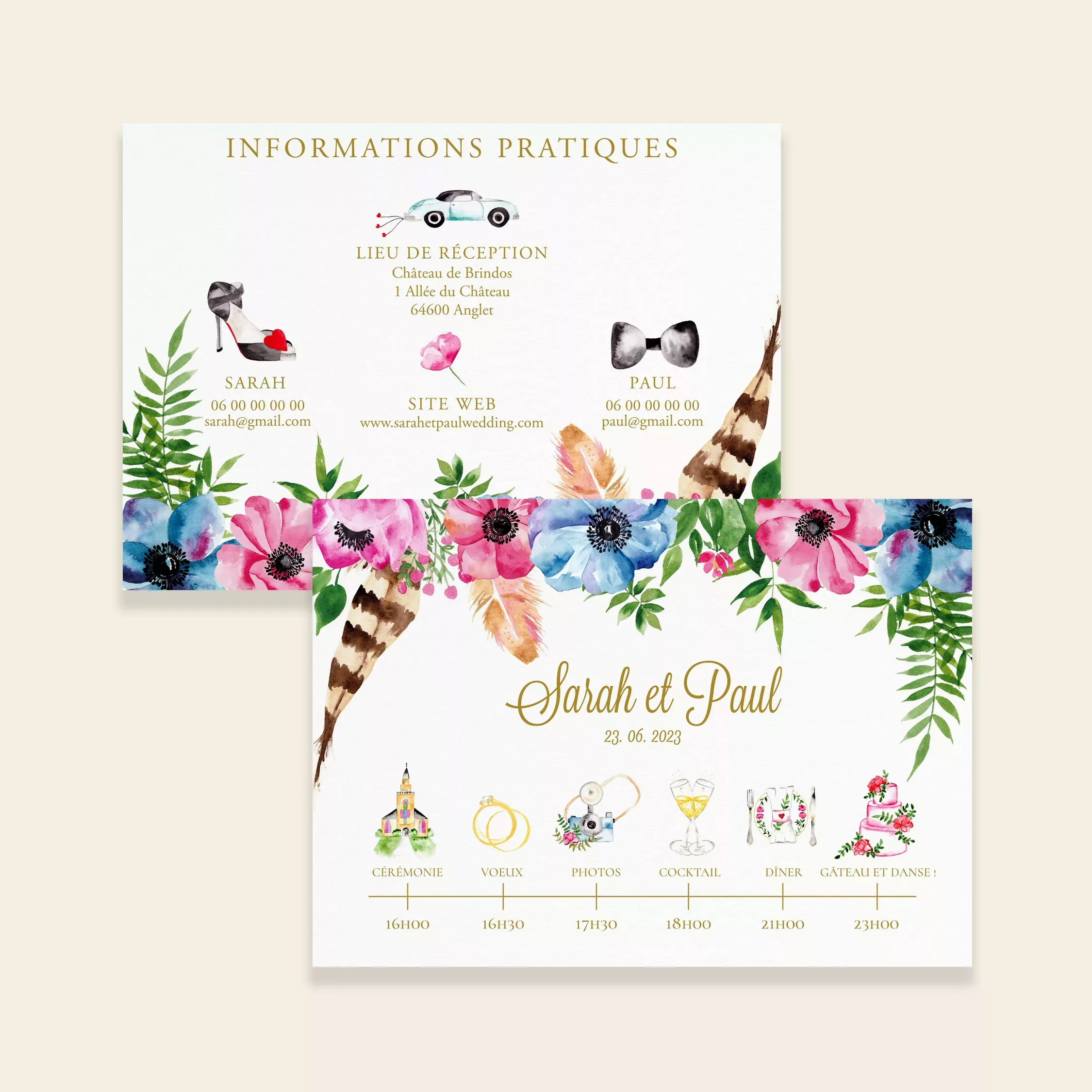 Le carton programme est à joindre au faire-part. Il donne plus de détails sur le déroulement de la journée, sur les horaires grâce à sa timeline. Il est à personnaliser avec différents pictogrammes illustrés. Vous pouvez y rajouter les adresses des différents lieux. Mais aussi des informations pratiques comme vos numéros de téléphone et adresses mails. La collection Bohowild de Maison Célestine célèbre l’esprit libre et naturel des mariages bohèmes. Entièrement peinte à la main à l’aquarelle dans notre studio, elle mêle avec finesse fleurs sauvages, feuillages délicats, plumes et bois de cerf. Chaque élément a été pensé pour créer une ambiance douce, poétique et un brin sauvage, fidèle à l’esprit bohème.