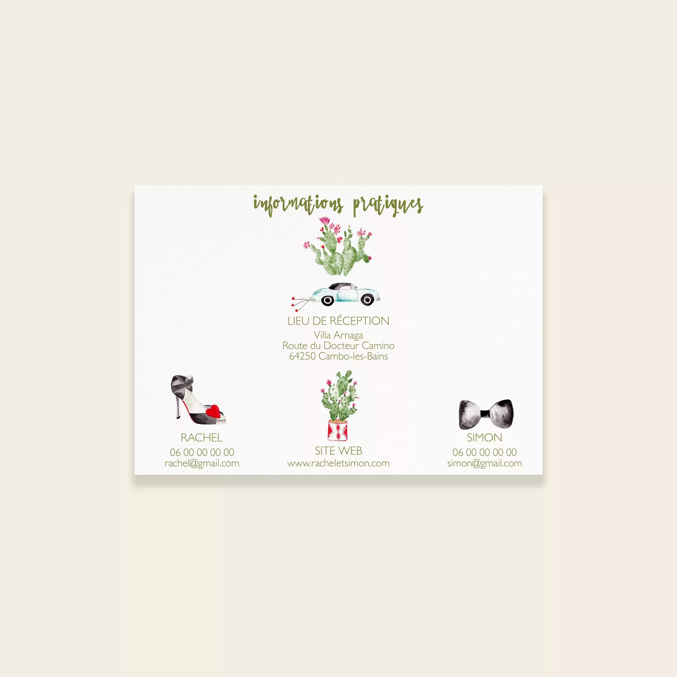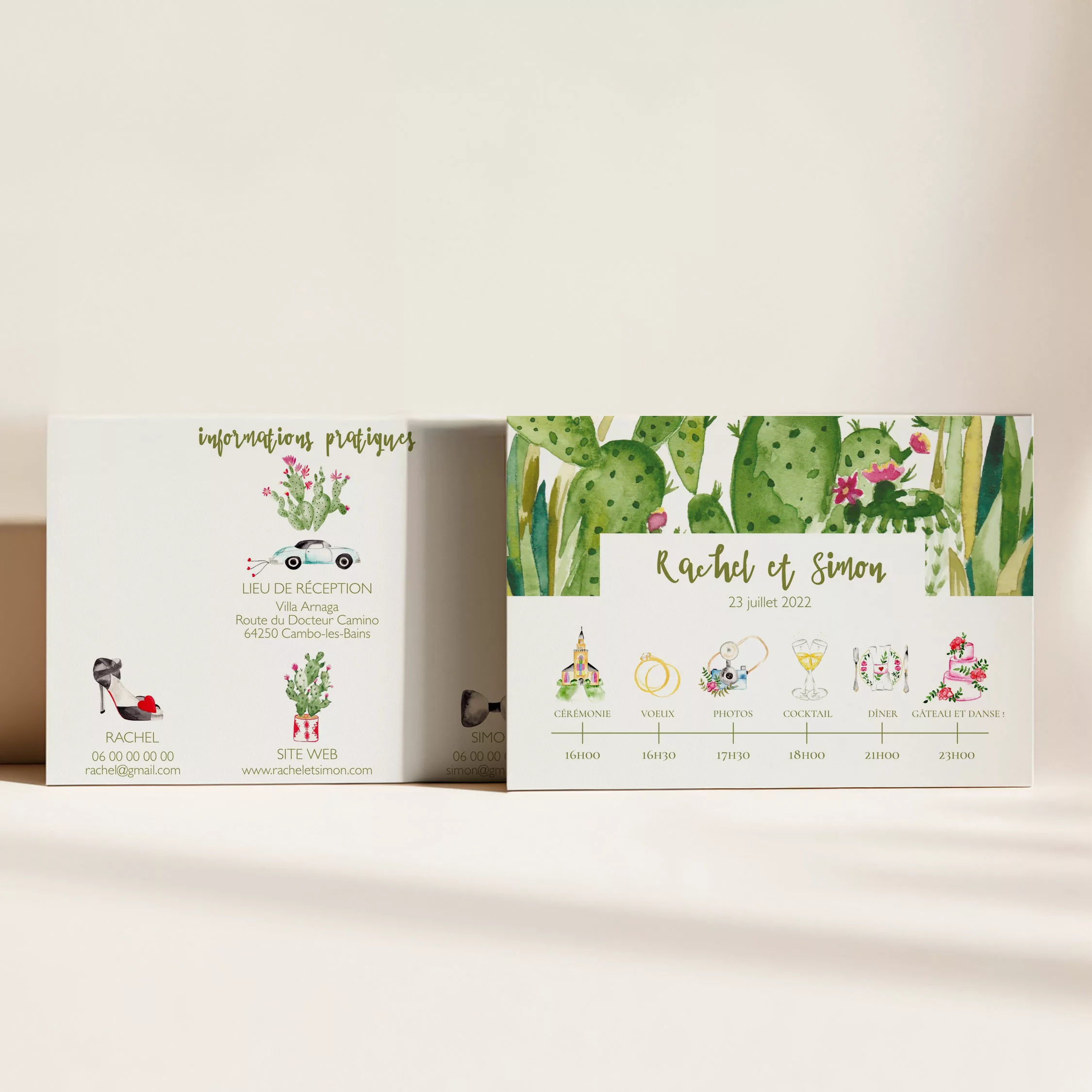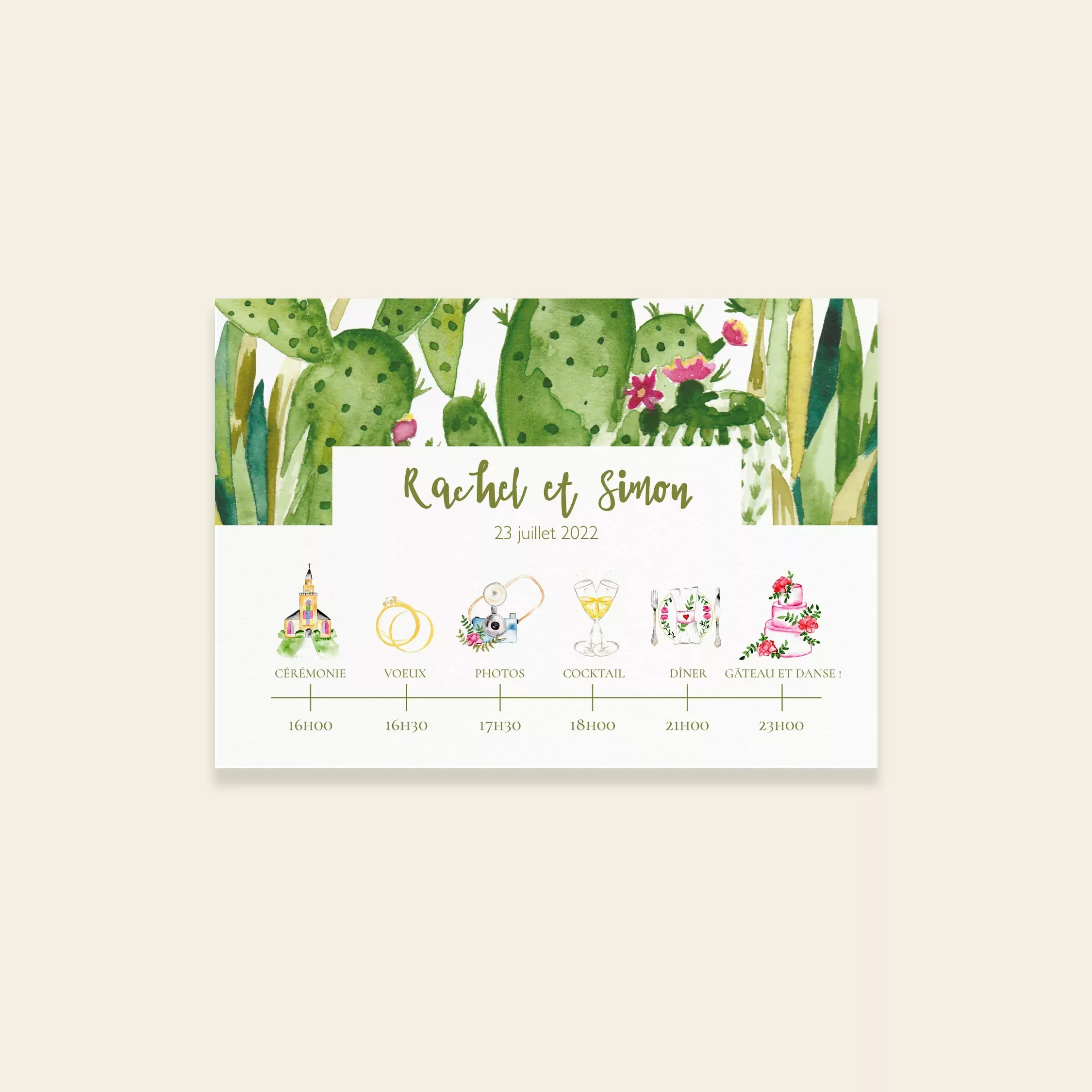 Le carton programme est à joindre au faire-part. Il donne plus de détails sur le déroulement de la journée, sur les horaires grâce à sa timeline. Il est à personnaliser avec différents pictogrammes illustrés. Vous pouvez y rajouter les adresses des différents lieux. Mais aussi des informations pratiques comme vos numéros de téléphone et adresses mails. La collection Cactus Garden, issue de la gamme mariage de Maison Célestine, célèbre la beauté des plantes du désert. Entièrement peinte à la main à l’aquarelle dans mon studio, elle mêle douceur, lumière et fraîcheur. Chaque illustration met en scène mes plantes favorites : les cactus. Leurs formes graphiques, associées à des nuances subtiles de vert et de rose, créent une atmosphère vivante et joyeuse. Ainsi, chaque faire-part devient une invitation à la détente et au voyage.