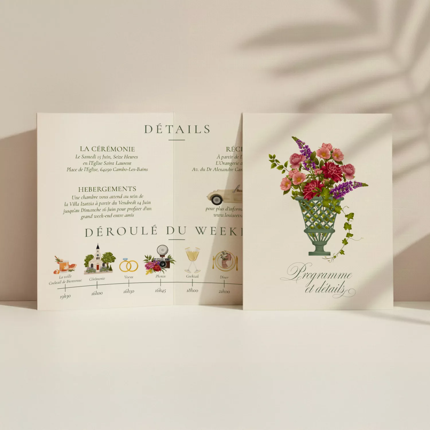 Orchestrez votre mariage avec élégance grâce au carton programme de la collection Sérénade Botanique. Ce modèle, inspiré par la beauté des jardins et le charme des treillis entrelacés, accompagne vos invités tout au long de votre journée ou week-end de célébration. Grâce à ses pictogrammes illustrés et ses couleurs lumineuses, il présente avec clarté et raffinement le déroulé des festivités ainsi que les informations essentielles. Un détail pratique et esthétique qui apporte une touche poétique à votre papeterie de mariage et guide vos convives avec douceur et harmonie.