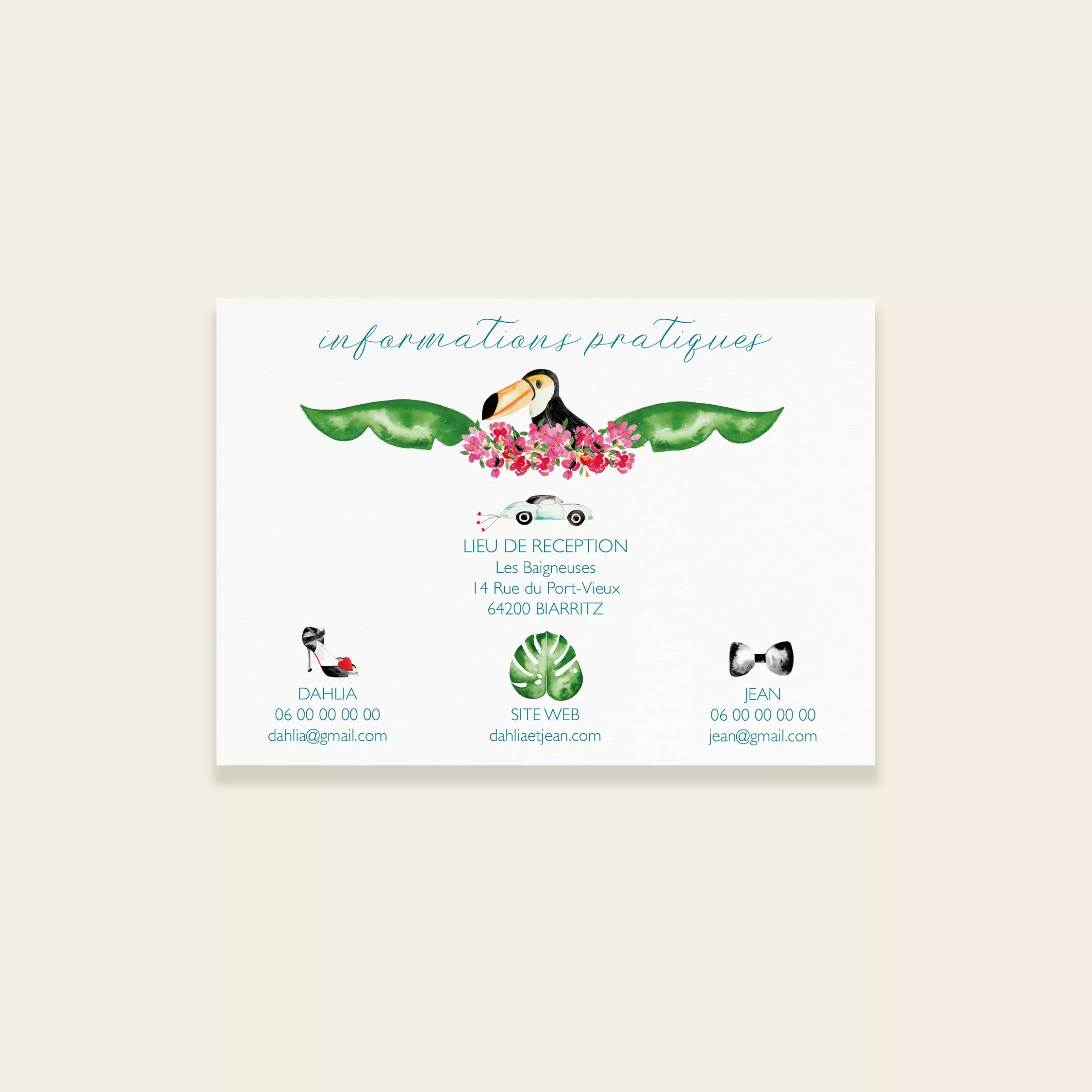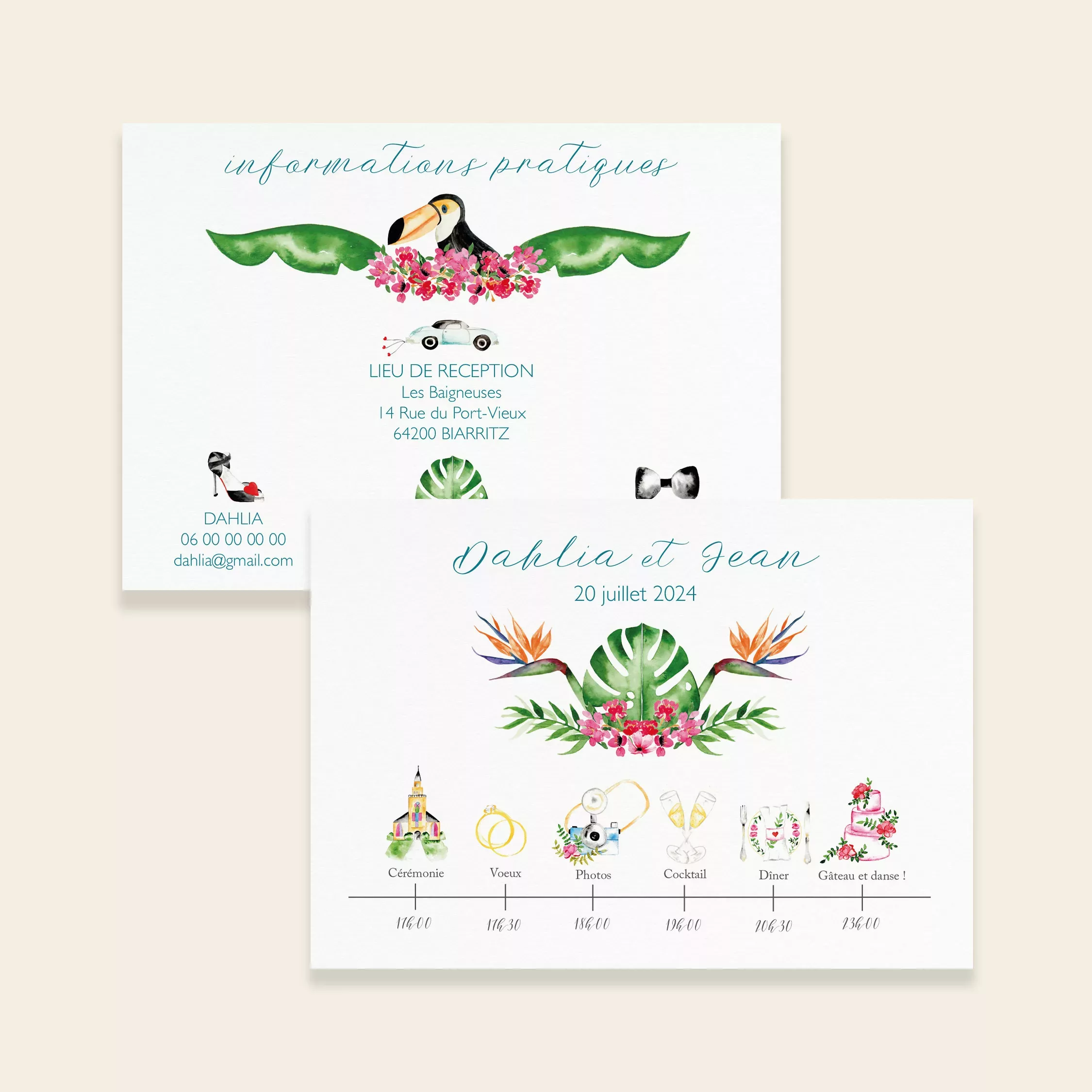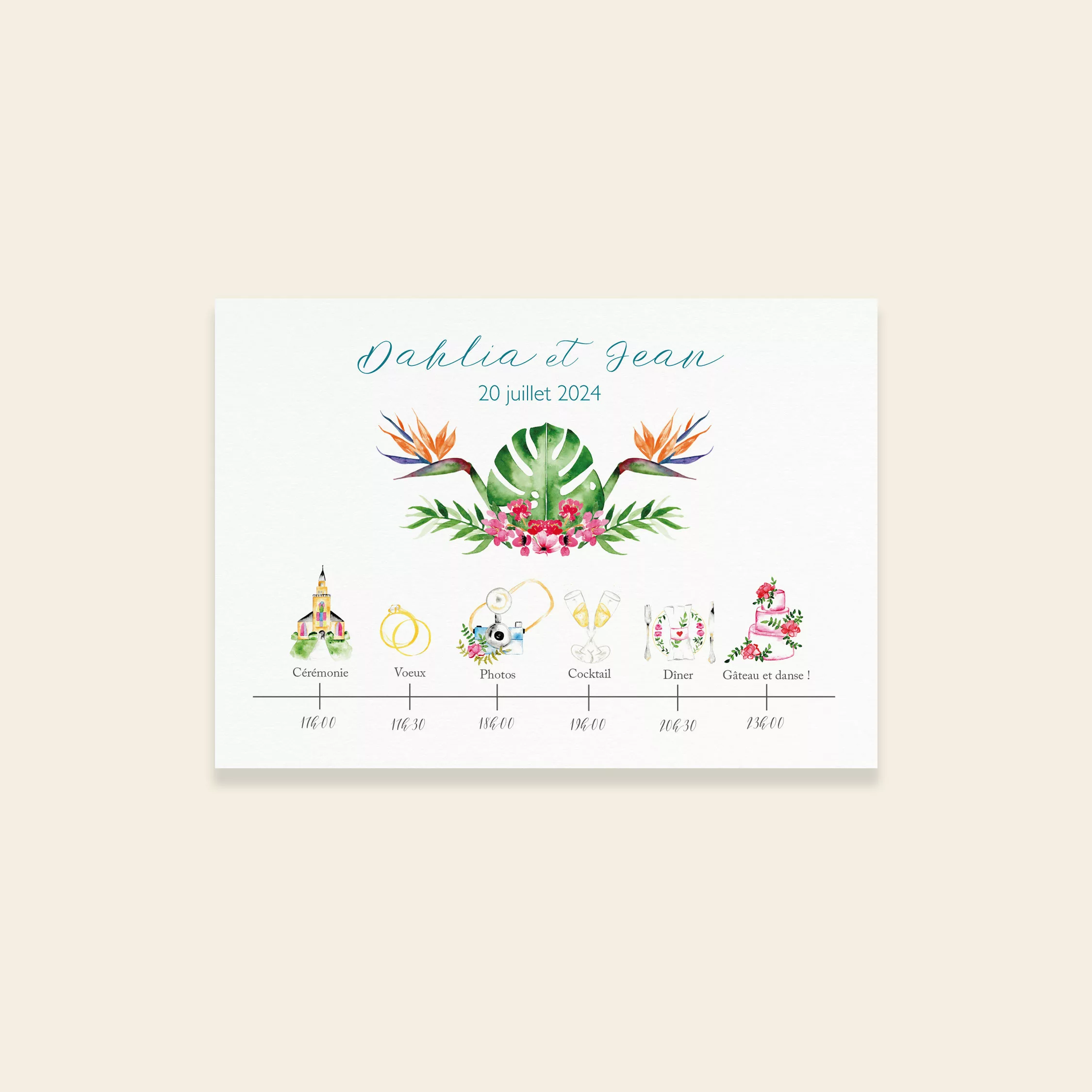Le carton programme est à joindre au faire-part. Il donne plus de détails sur le déroulement de la journée, sur les horaires grâce à sa timeline. Il est à personnaliser avec différents pictogrammes illustrés. Vous pouvez y rajouter les adresses des différents lieux. Mais aussi des informations pratiques comme vos numéros de téléphone et adresses mails. La collection Tropical Pop de Maison Célestine propose une papeterie de mariage colorée et exotique. Chaque faire-part, menu ou carte de remerciement est peint à la main pour créer un univers unique. Cette collection s’inspire de la jungle et de la végétation tropicale. Palmiers, fleurs colorées et ananas se mêlent à une typographie moderne et calligraphiée. Le résultat est frais, tendance et facile à personnaliser.
