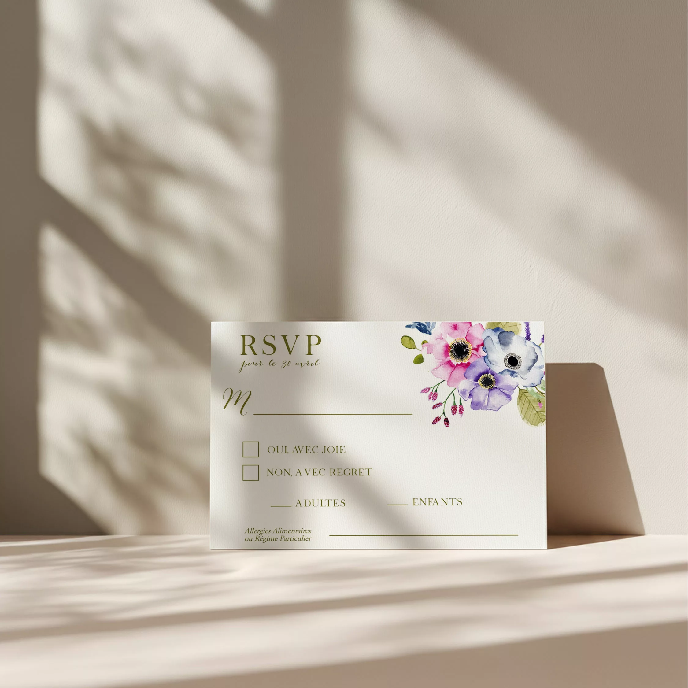 Le carton réponse permet à vos invités de confirmer facilement leur présence à votre mariage. Le studio se charge de la personnalisation pour qu’il s’accorde parfaitement au design et à l’esprit de votre collection. La collection Balade Champêtre de Maison Célestine célèbre les mariages floraux et champêtres. Inspirée par la nature, elle met en scène fleurs des champs et feuillages sauvages. Chaque motif est peint à la main à l’aquarelle dans notre studio.