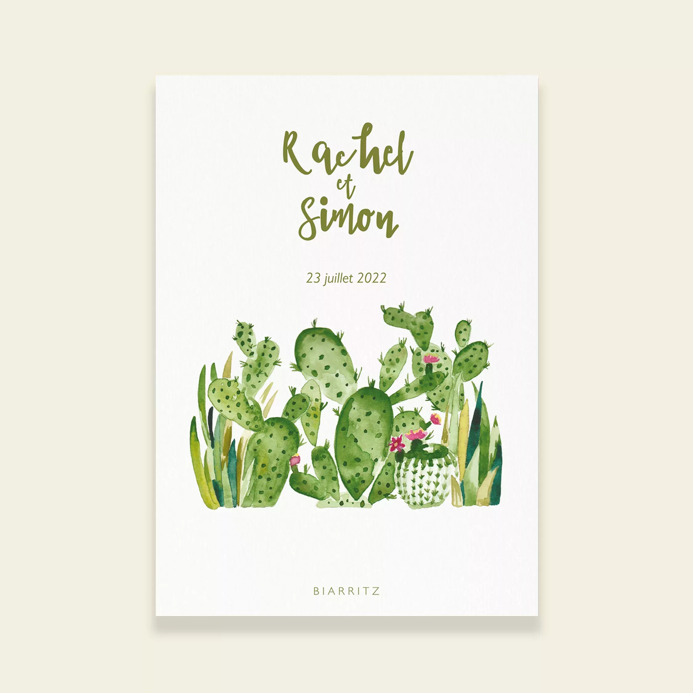 Couverture pour livret de cérémonie de mariage de la collection CACTUS GARDEN issue de la gamme mariage de Maison Célestine. “Cactus Garden” est un joli design, entièrement peint à la main à l’aquarelle au studio. Une papeterie mettant en scène des plantes que j’adore: les cactus. Une papeterie colorée, idéale pour les mariages à l’esprit bohème, nature et éclectique. Cette collection est portée par une ambiance très Palm Springs !