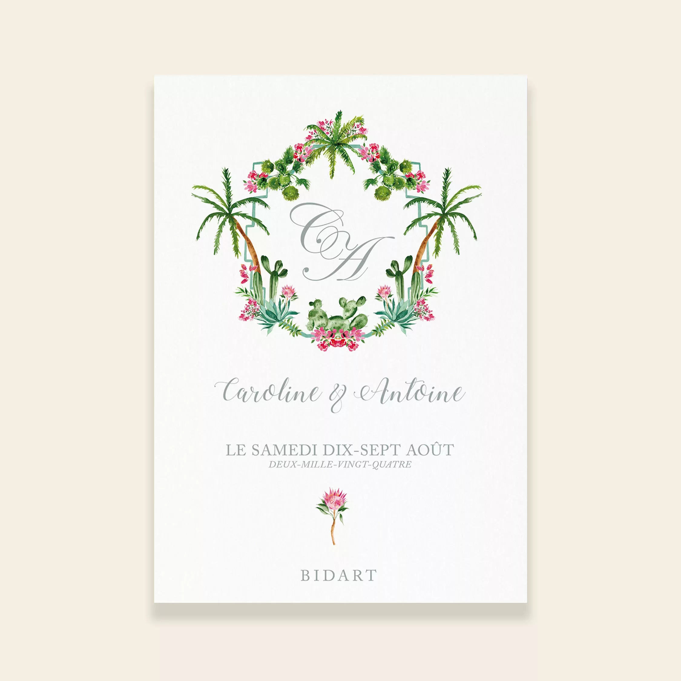 « Palm Springs » est une collection à l’univers bohème et coloré. Plongez dans une ambiance californienne avec ses mythiques palmiers et cactus. Une collection qui invite au voyage et au dépaysement et vous plongera dans cet univers qui oscille entre désert et végétation presque tropicale. Donnez le ton avec cette papeterie de mariage bohème pour une célébration à la fois chic et authentique. Palm Springs se caractérise également par son logo mêlant plantes, fleurs et initiales et qui restera le symbole de votre union. Cette collection, entièrement peinte à la main par la créatrice est idéale pour les mariages à l’esprit bohème, éclectique et vintage.