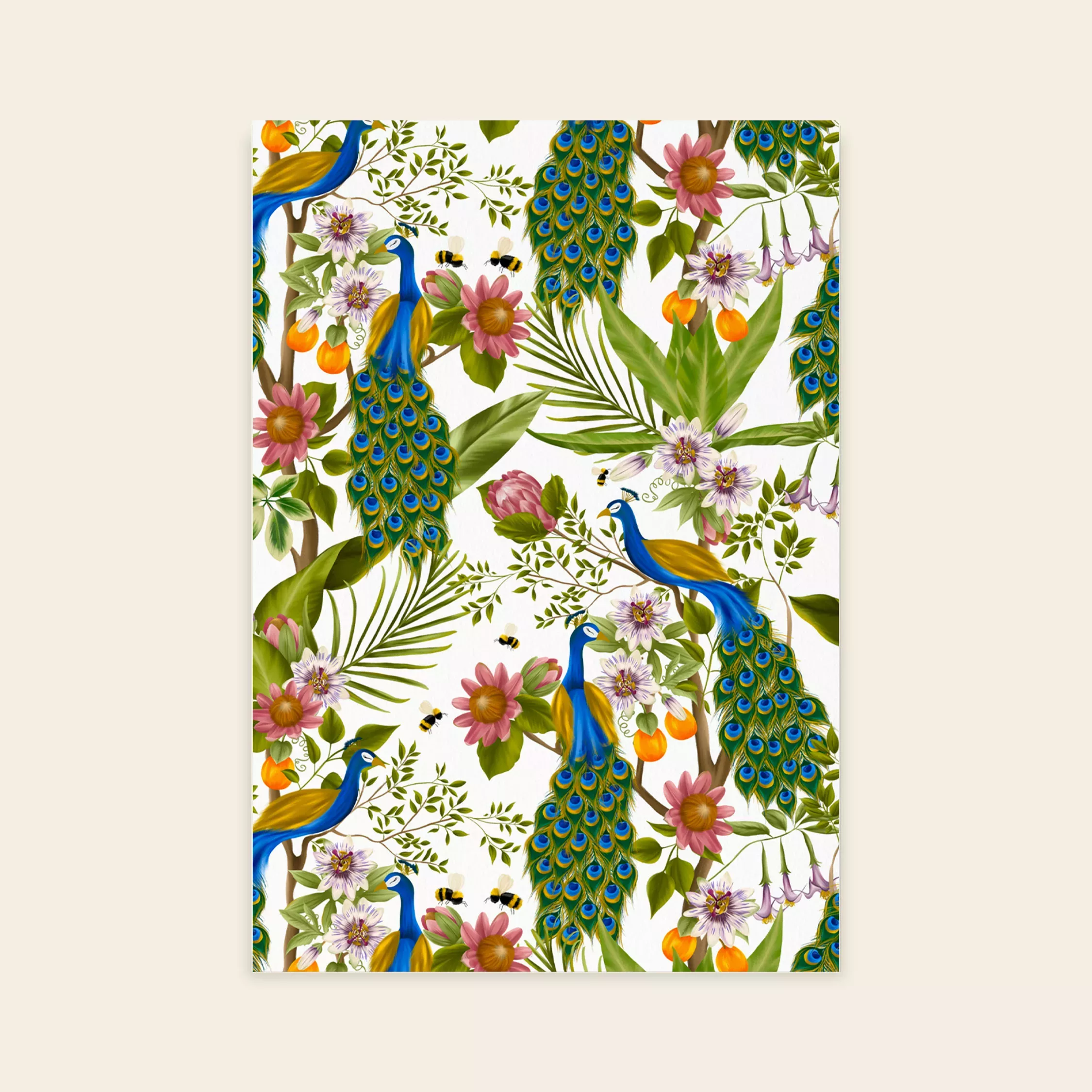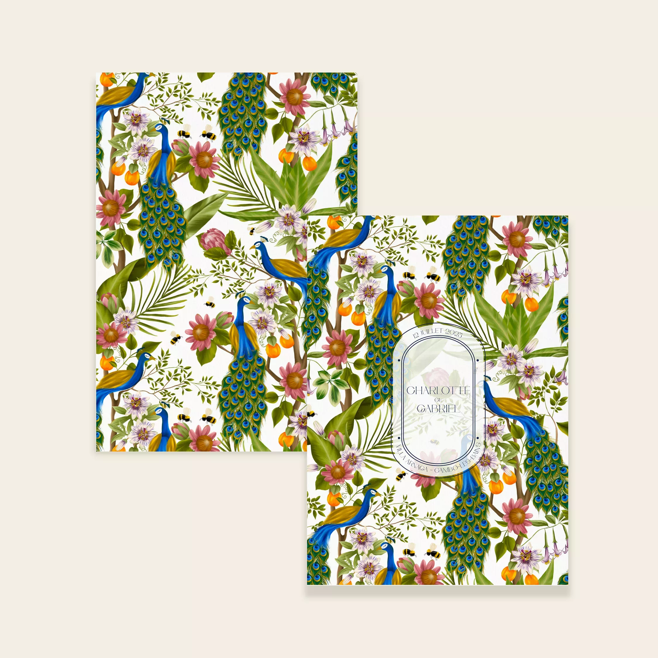 Couverture pour livret de cérémonie de mariage de la collection PEACOCK GARDEN issue de la gamme mariage du studio. « Peacock Garden » est une collection inspirée de paysages anciens. Cette invitation au voyage au coeur du jardin des paons, cet animal majestueux aux plumes bleues originaire de l’Inde, est l’occasion de se plonger dans un univers exotique et élégant. Donnez le ton avec cette papeterie de mariage ou faune et flore se mélangent pour une célébration à la fois chic et intemporelle. Peacock Garden est un véritable voyage illustré qui transportera vos invités et qui restera un beau symbole de votre union. Cette collection, entièrement peinte à la main par la créatrice est idéale pour les mariages à l’esprit nature, moderne et élégant.