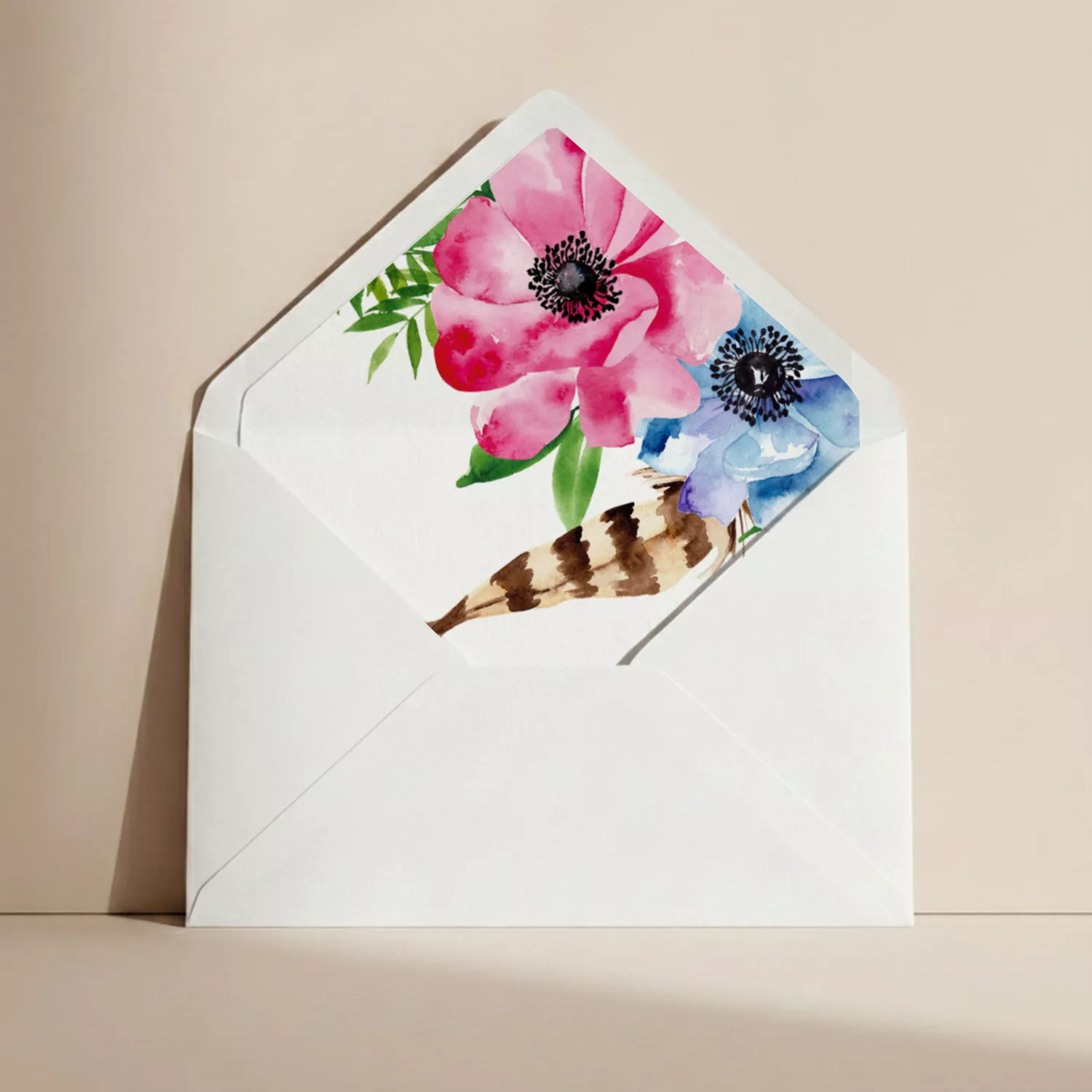 La doublure d’enveloppe permet de décorer l’intérieur de vos enveloppes pour assortir le tout à votre faire-part. En effet, ce papier illustré apporte une touche colorée et originale à vos envois. Le studio décline les motifs de chaque gamme pour créer un ensemble parfaitement harmonieux. Ainsi, vos invités découvrent votre univers créatif dès l’ouverture du courrier. La collection Bohowild de Maison Célestine célèbre l’esprit libre et naturel des mariages bohèmes. Entièrement peinte à la main à l’aquarelle dans notre studio, elle mêle avec finesse fleurs sauvages, feuillages délicats, plumes et bois de cerf. Chaque élément a été pensé pour créer une ambiance douce, poétique et un brin sauvage, fidèle à l’esprit bohème.