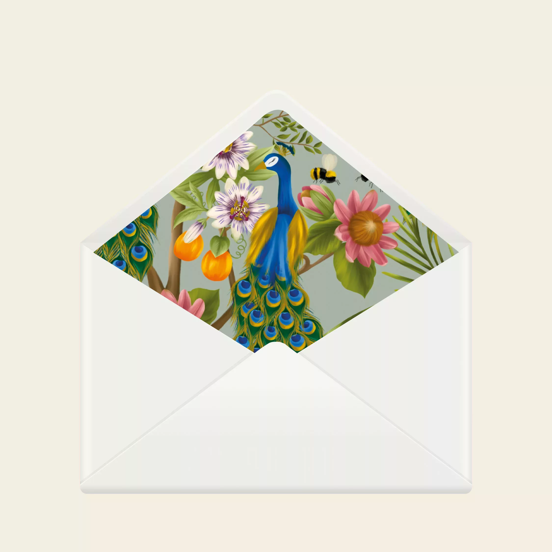 Vous pouvez retrouver le faire-part assorti à ces doublures enveloppes de la collection Peacock Garden juste ici.