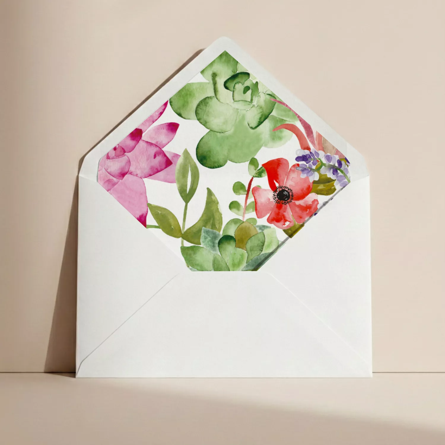 La doublure d’enveloppe permet de décorer l’intérieur de vos enveloppes pour assortir le tout à votre faire-part. En effet, ce papier illustré apporte une touche colorée et originale à vos envois. Le studio décline les motifs de chaque gamme pour créer un ensemble parfaitement harmonieux. Ainsi, vos invités découvrent votre univers créatif dès l’ouverture du courrier. La collection Succulentes, issue de la gamme mariage de Maison Célestine, célèbre la beauté des plantes grasses et des feuillages colorés. Peinte à la main à l’aquarelle au studio, elle reflète toute la richesse et la diversité du monde végétal. Chaque illustration met en scène des succulentes, des feuillages délicats et des fleurs aux nuances subtiles.