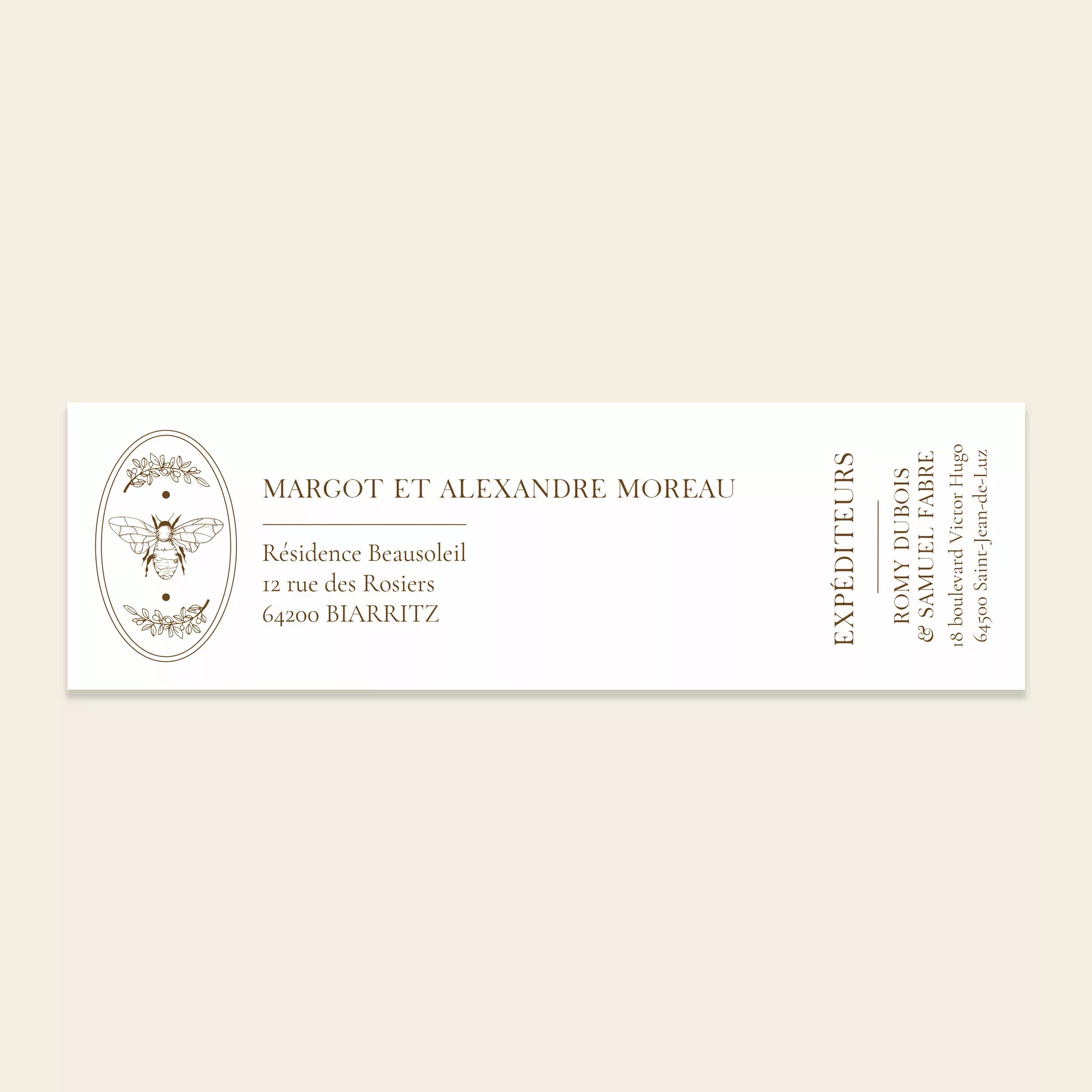 Gardez votre thème jusqu’au bout en habillant vos enveloppes avec les étiquettes adresses assorties. Chaque étiquette comporte l’adresse de vos convives ainsi que votre adresse d’expédition sur le côté droit afin de se retrouver au dos de l’enveloppe. C’est le détail en plus qui donnera la touche finale élégante à votre faire-part.