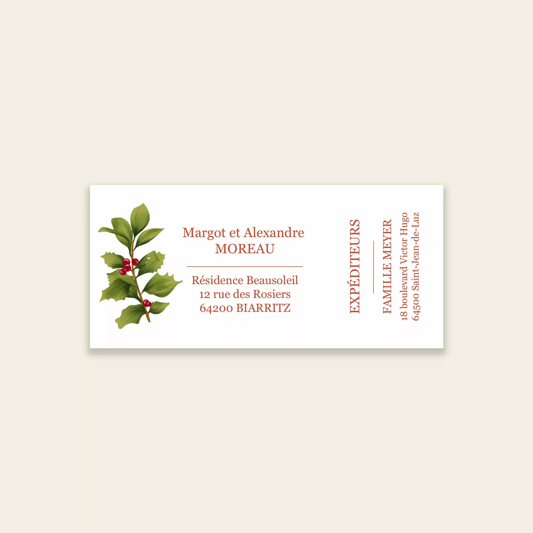 Gardez votre thème jusqu’au bout en habillant vos enveloppes avec les étiquettes adresses assorties. Chaque étiquette comporte l’adresse de vos proches ainsi que votre adresse d’expédition sur le côté droit afin de se retrouver au dos de l’enveloppe. C’est le détail en plus qui donnera la touche finale élégante à votre faire-part.