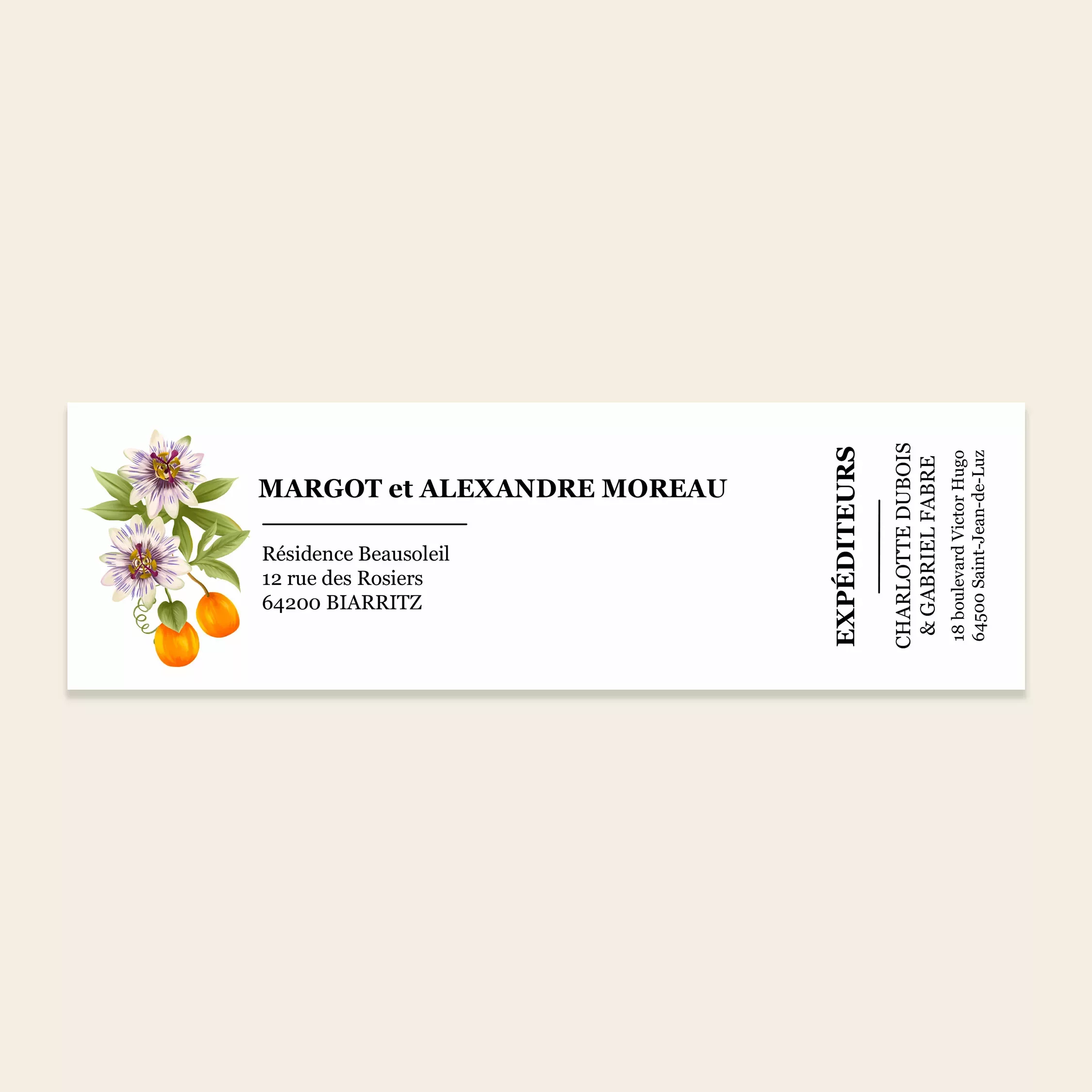 Gardez votre thème jusqu’au bout en habillant vos enveloppes avec les étiquettes adresses assorties. Chaque étiquette comporte l’adresse de vos convives ainsi que votre adresse d’expédition sur le côté droit afin de se retrouver au dos de l’enveloppe. C’est le détail en plus qui donnera la touche finale élégante à votre faire-part.