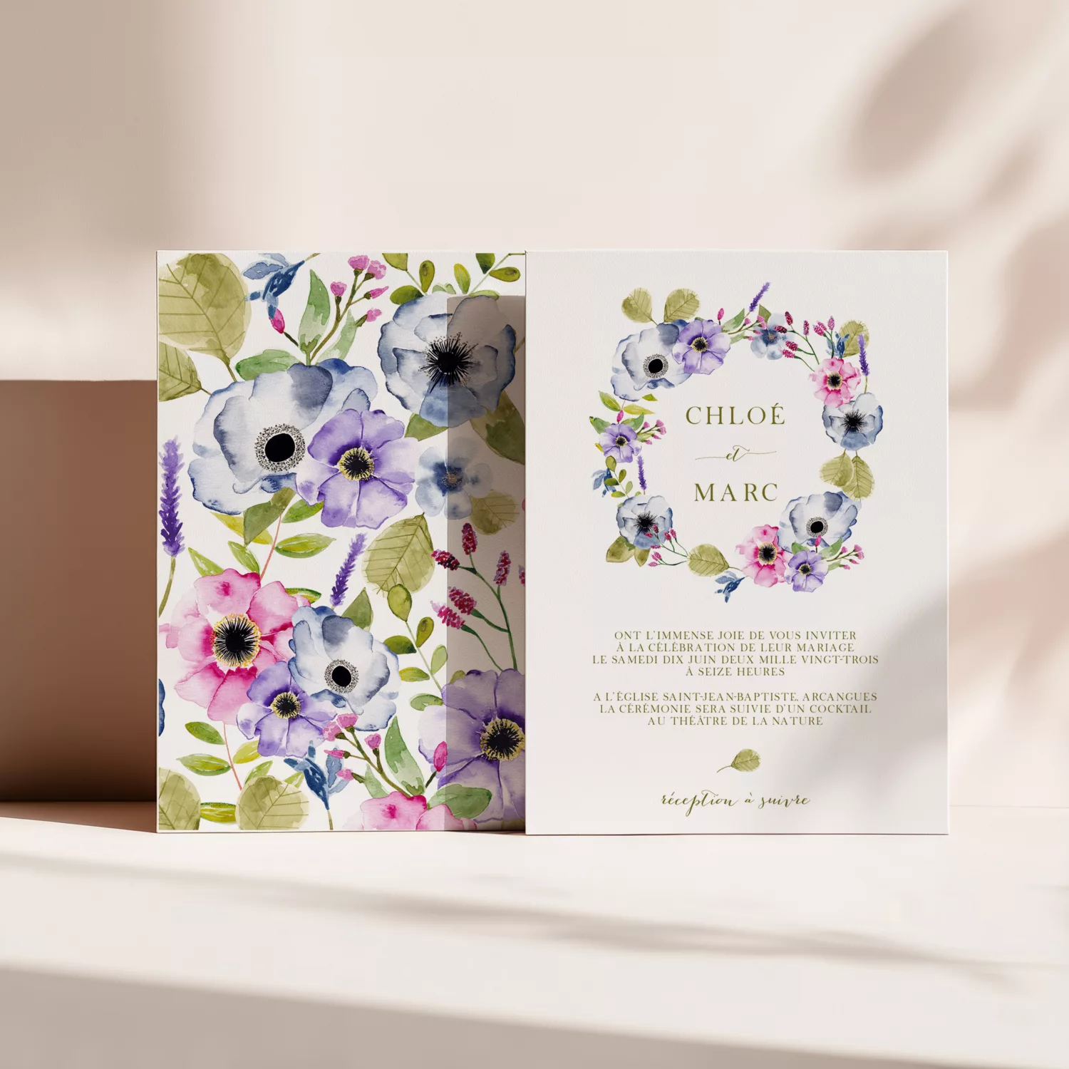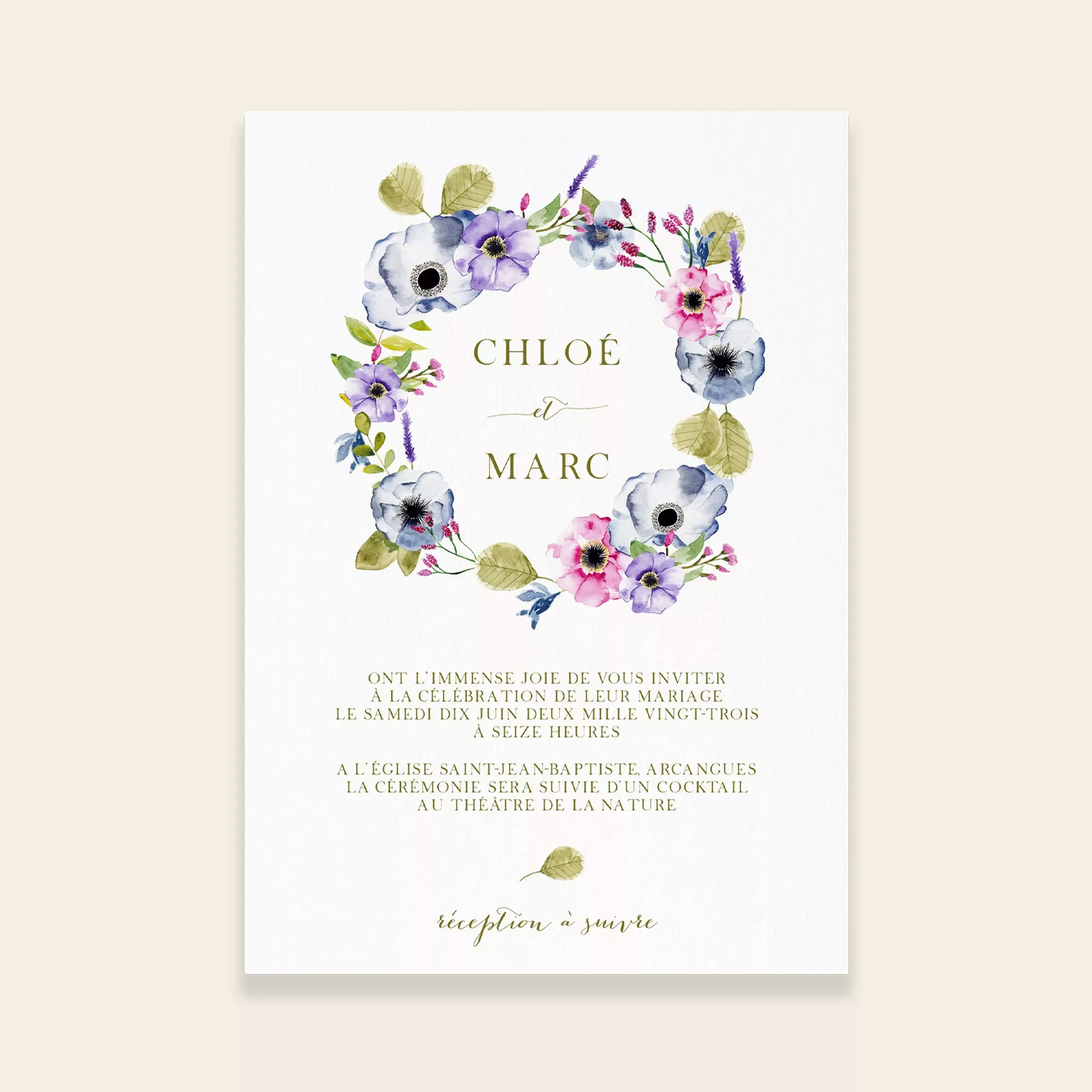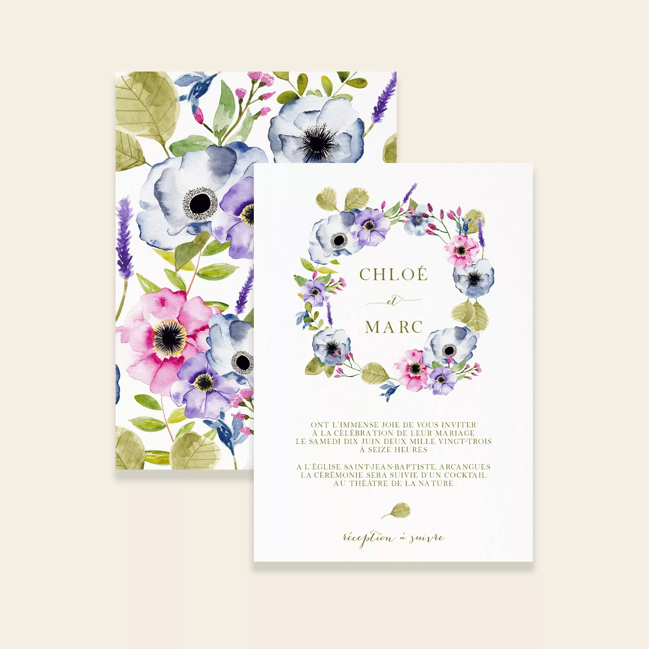 Ainsi, les fleurs semblent pousser librement, pour un rendu naturel et poétique. De plus, la collection offre un style romantique et bucolique, parfait pour les mariages champêtres, floraux, bohèmes ou rustiques. Du faire-part aux menus, et même jusqu’aux cartes de remerciement ou à la papeterie du jour J, chaque élément s’harmonise avec soin. Ainsi, votre papeterie raconte votre histoire tout en créant une ambiance florale unique.