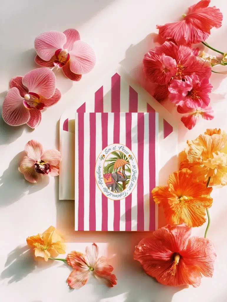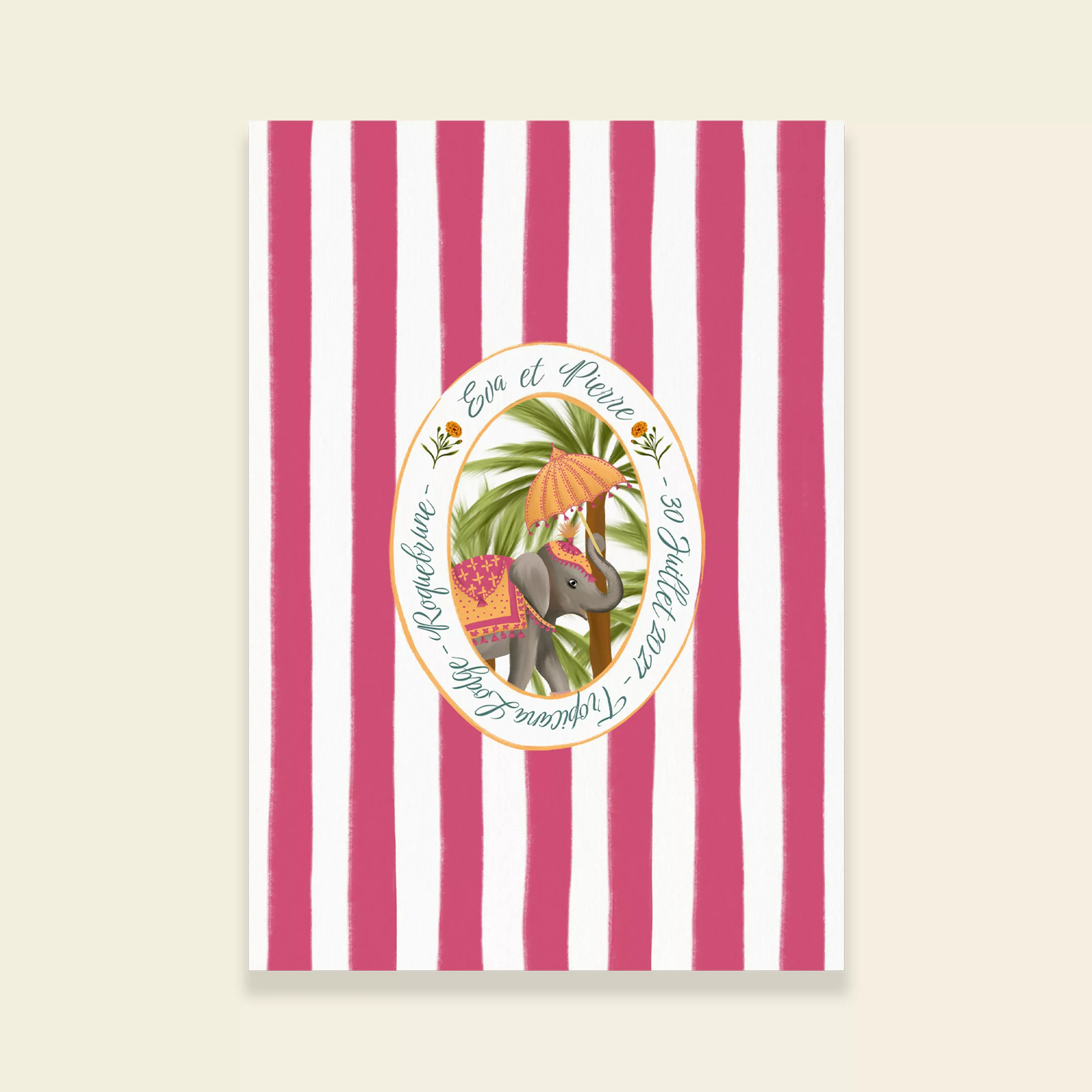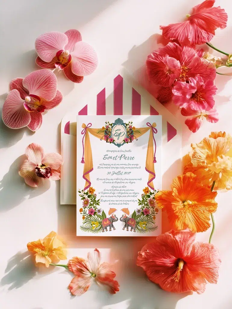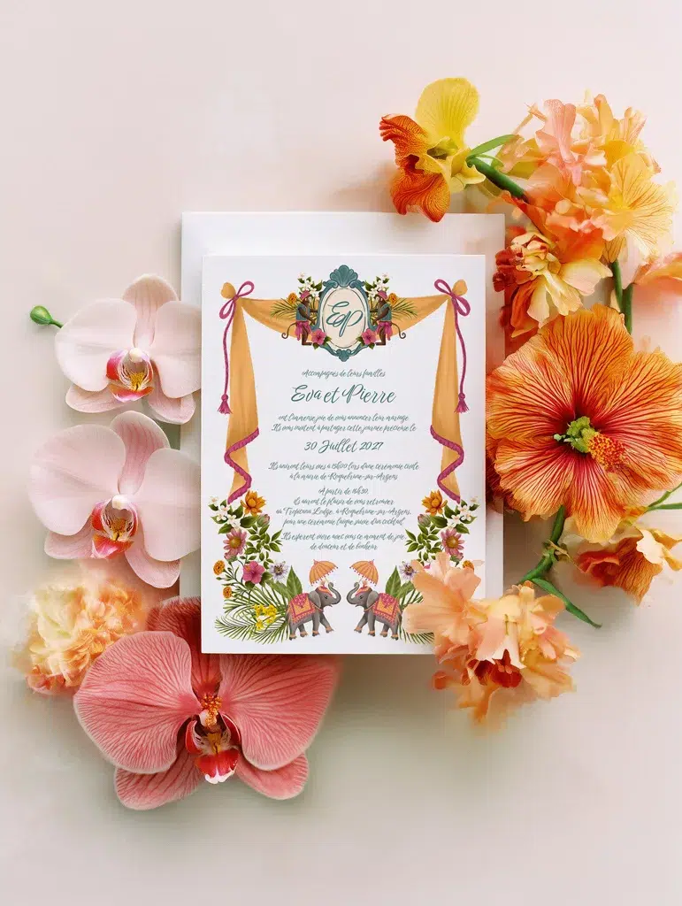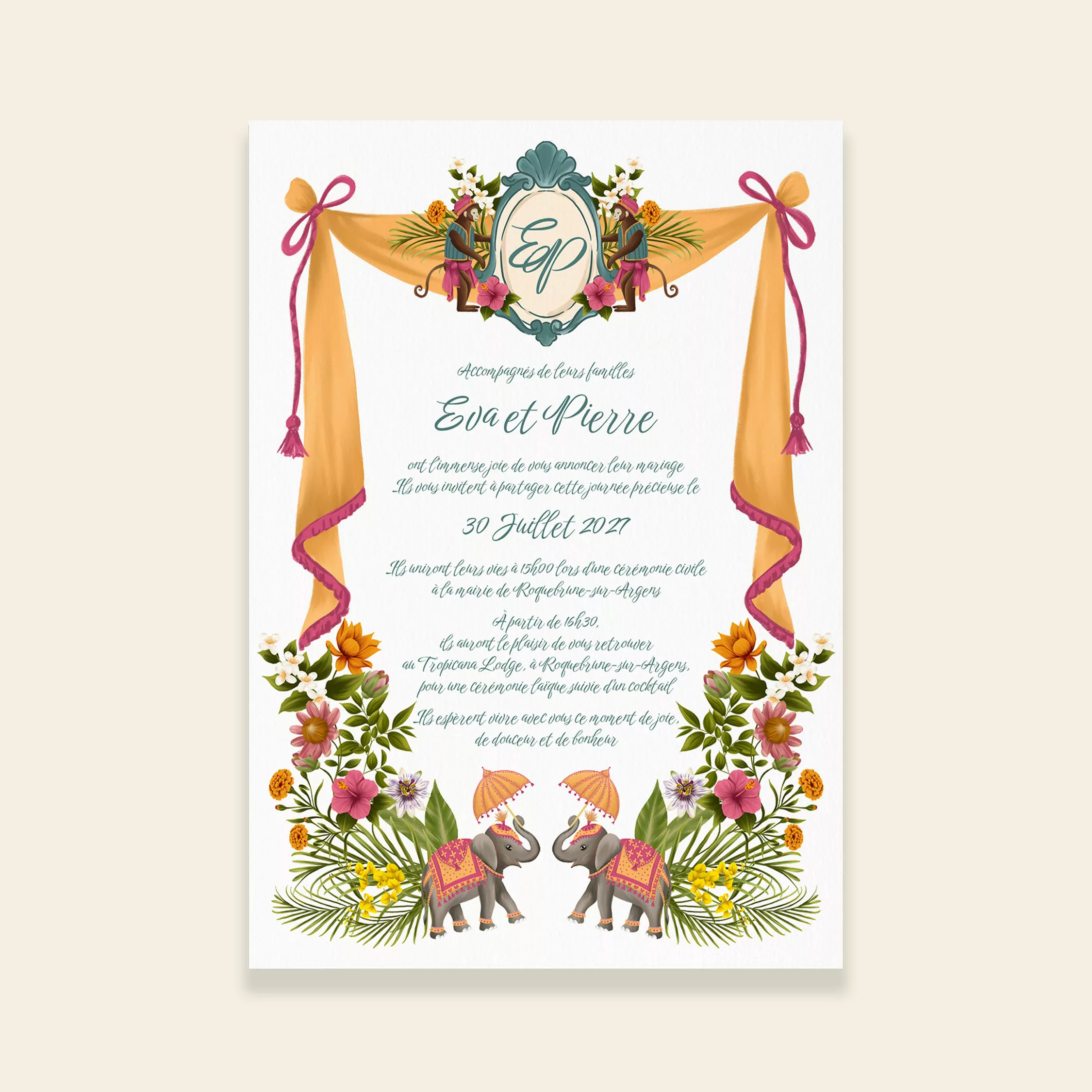 Annoncez votre union avec éclat grâce au faire-part de la collection Jaipur. Ce modèle s’inspire de la richesse des jardins orientaux et de la joie des fêtes traditionnelles. Il combine ainsi des fleurs luxuriantes, des éléphants de parade et des détails fantaisistes. Les nuances de rose, de jaune safran et de vert émeraude apportent une énergie solaire à votre annonce. Ainsi, votre papeterie de mariage devient une véritable invitation au voyage.