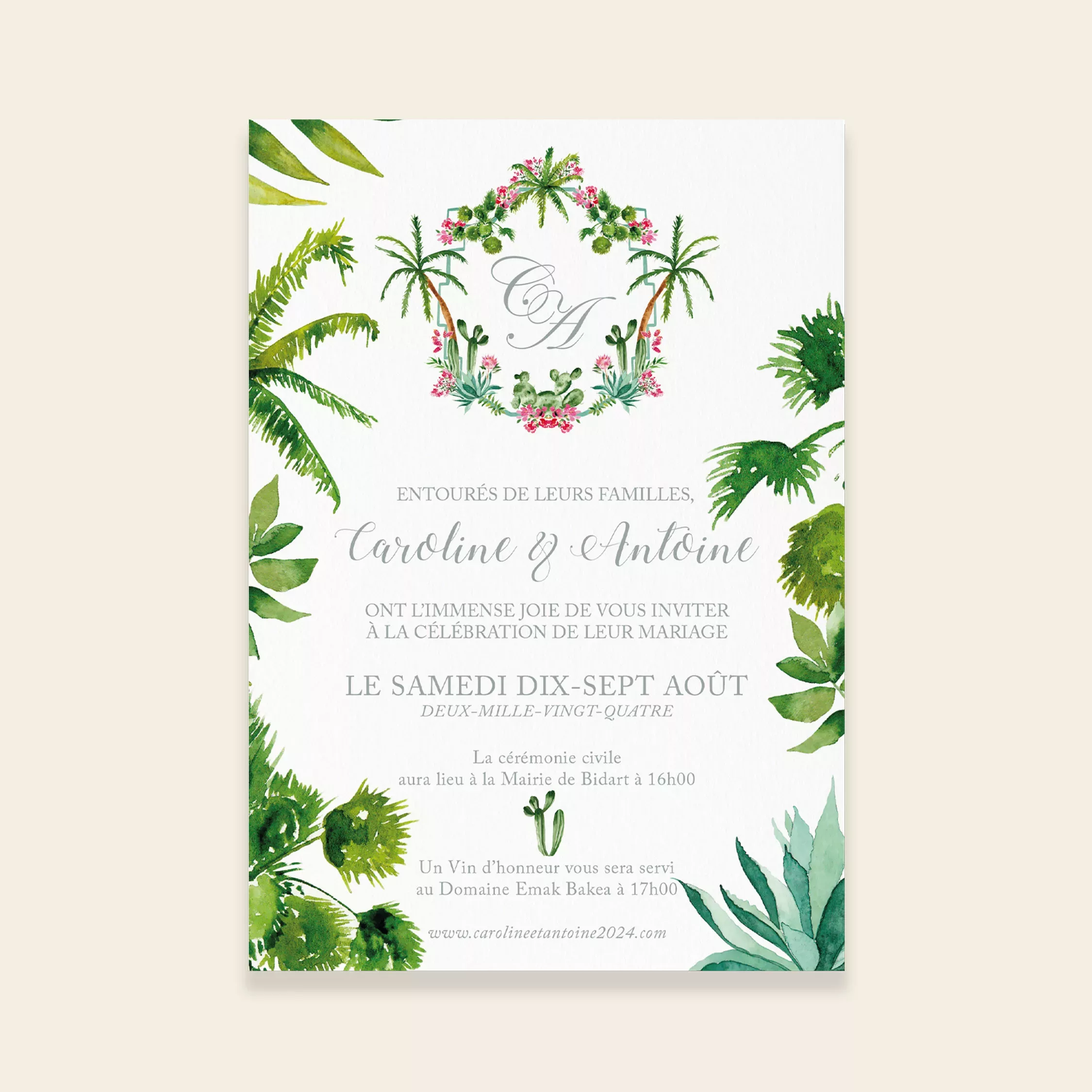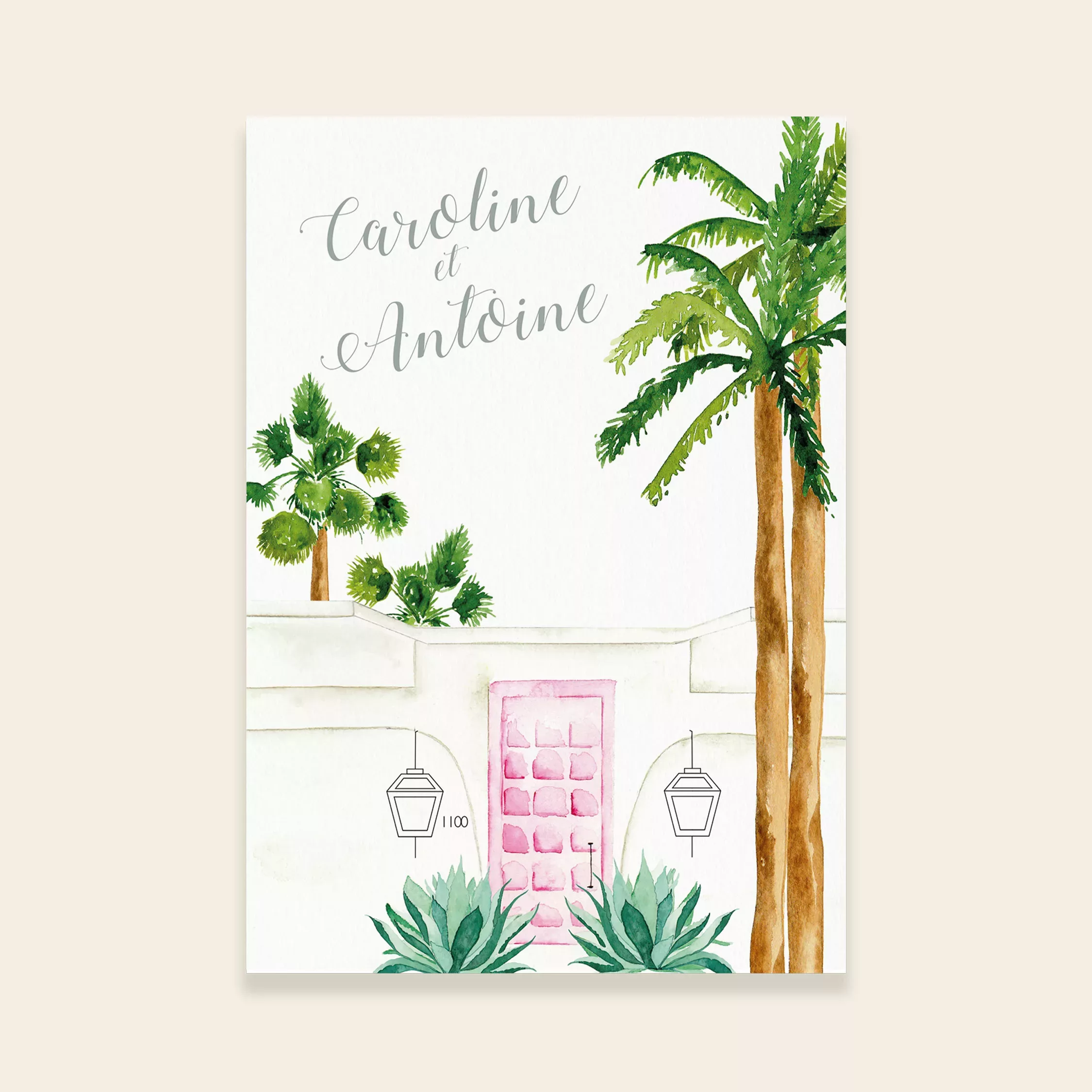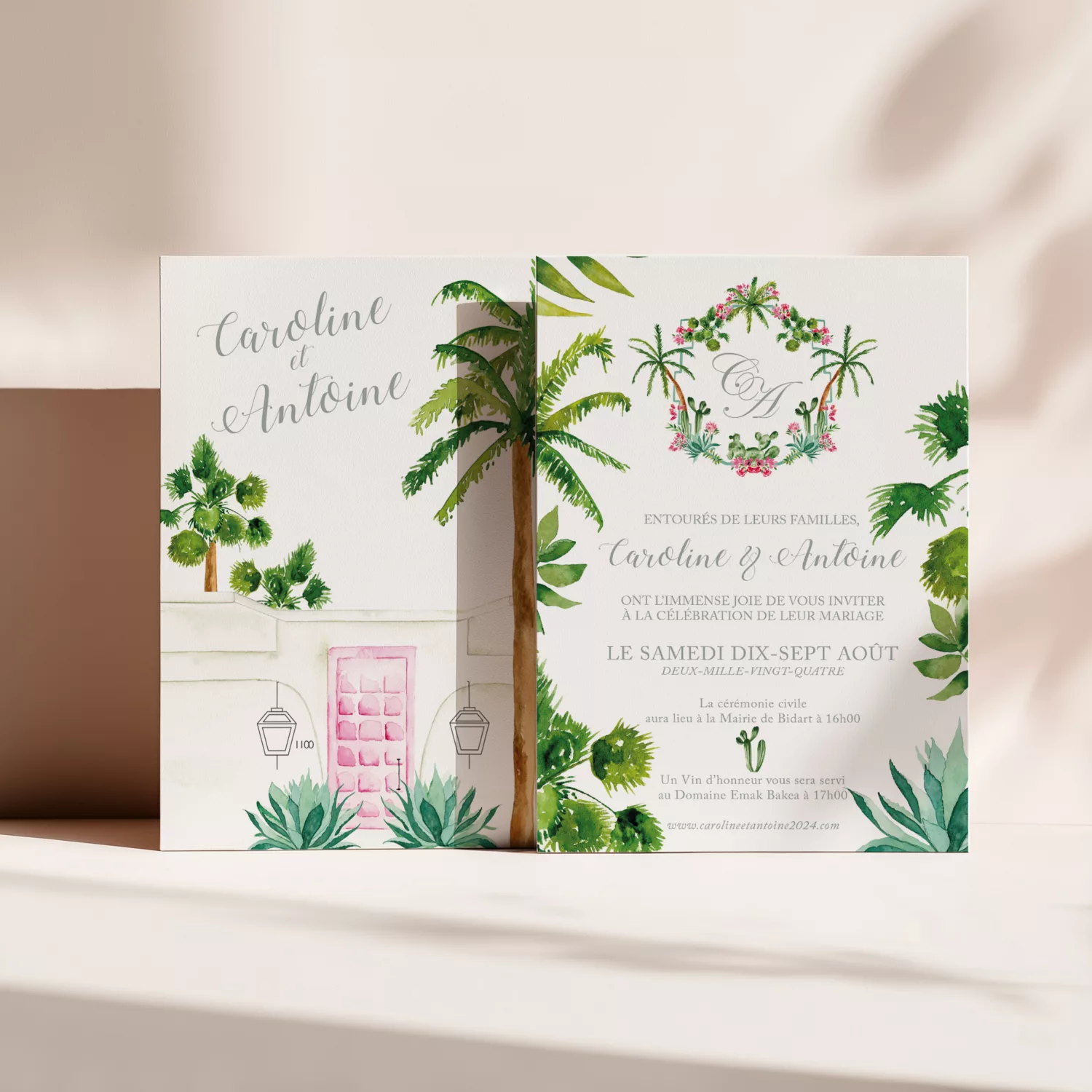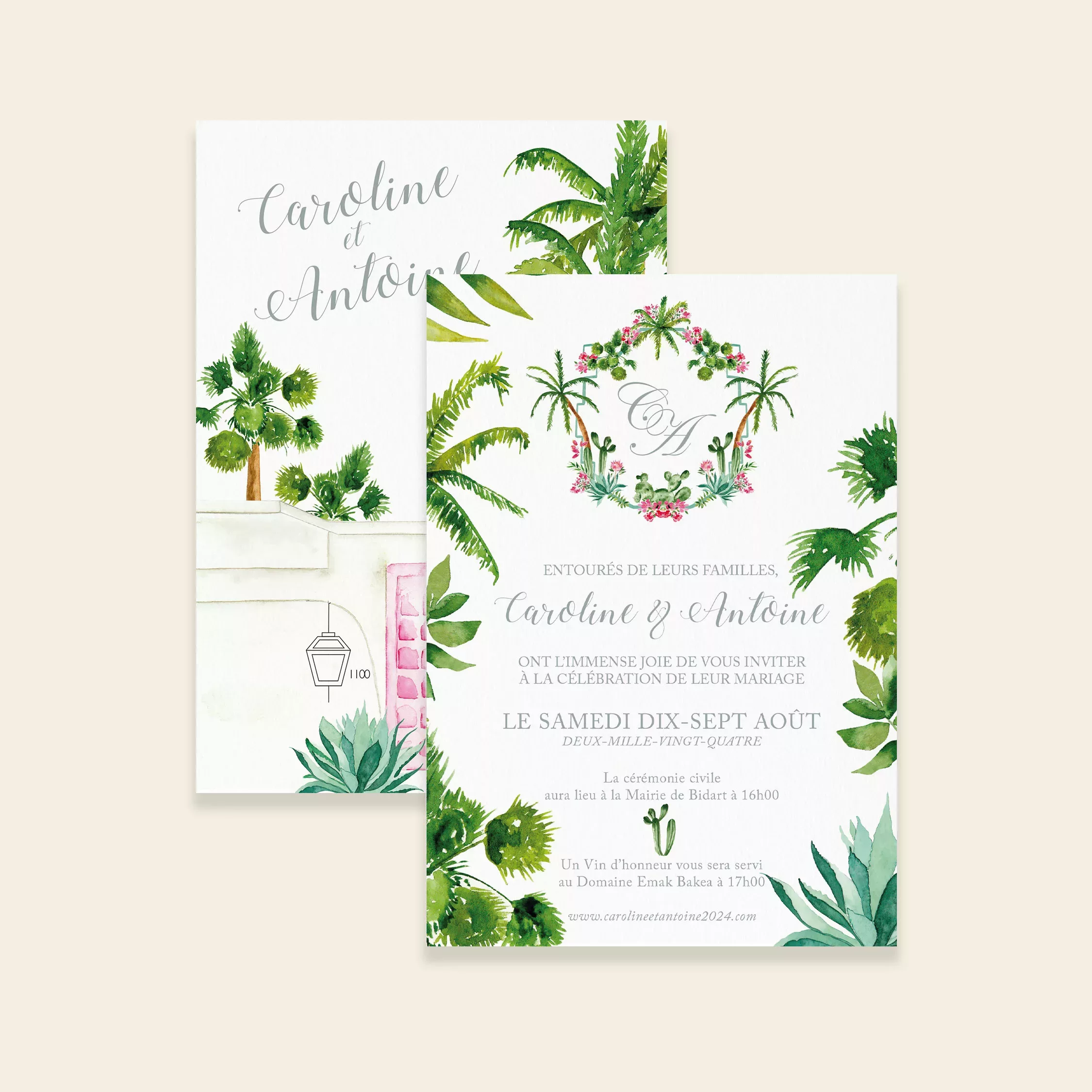De plus, la collection se distingue par son blason, qui combine plantes, fleurs et initiales. Ce symbole devient le fil conducteur de votre papeterie et représente votre union de façon élégante. Cette collection s’adapte parfaitement aux mariages à l’esprit bohème, vintage ou éclectique. Elle transforme chaque élément de votre papeterie en un souvenir unique et mémorable. Vos invités seront immédiatement plongés dans l’univers Palm Springs.