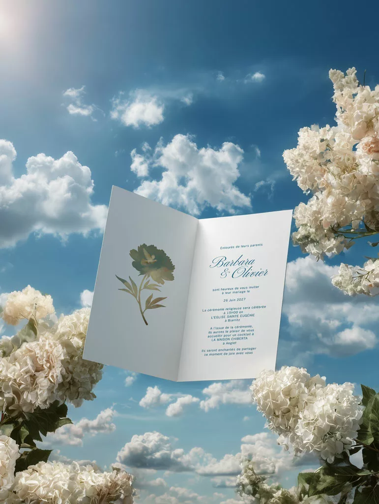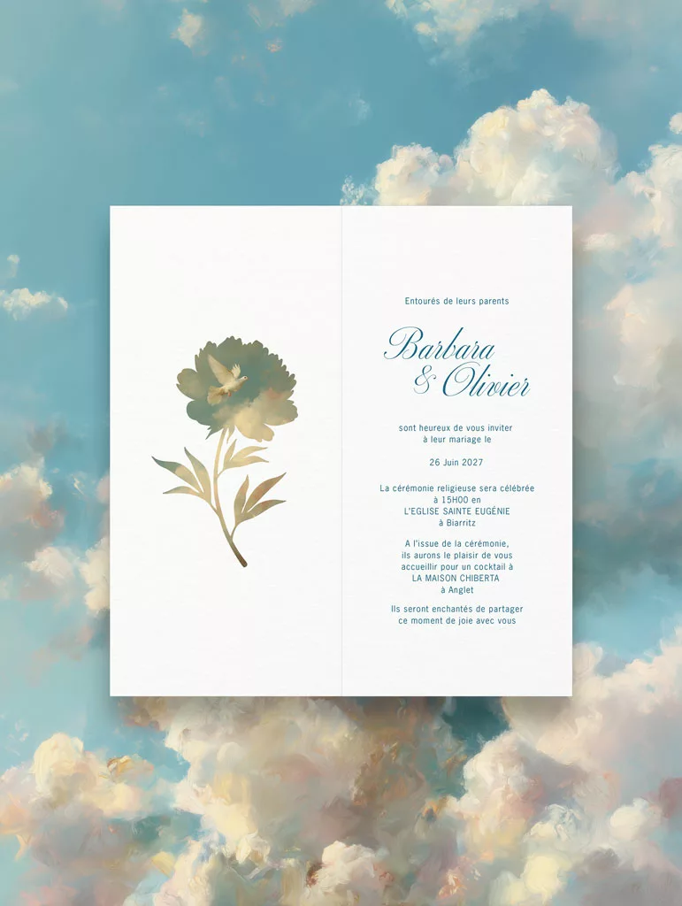 Invitez vos proches à votre mariage avec un faire-part à votre image. Chaque détail reflète l’élégance et la douceur de votre journée. La collection Sixtine s’inspire de l’esthétique Renaissance. Elle réunit des ciels peints, des nuages vaporeux et une lumière céleste qui crée une atmosphère douce et onirique. Maison Célestine y explore un univers audacieux, où les fresques anciennes dialoguent avec une vision plus contemporaine. Chaque création ouvre une parenthèse suspendue : une invitation à s’élever, à contempler et à célébrer le mariage comme une scène picturale.
