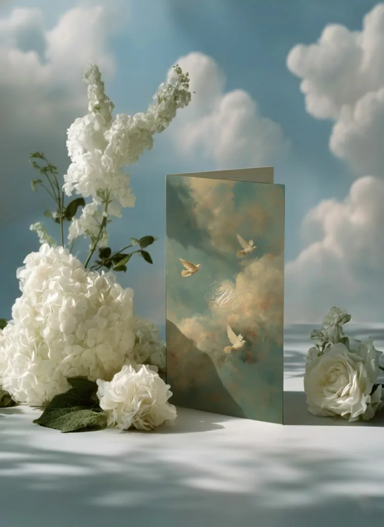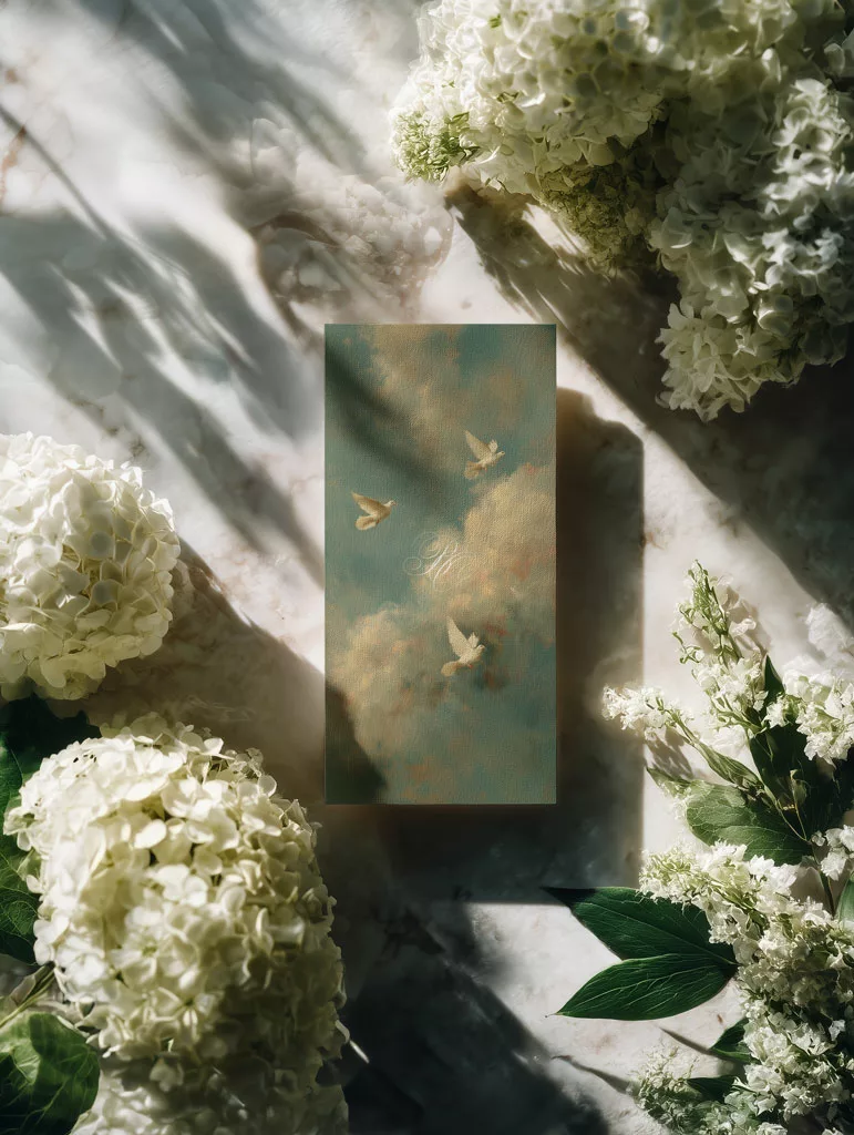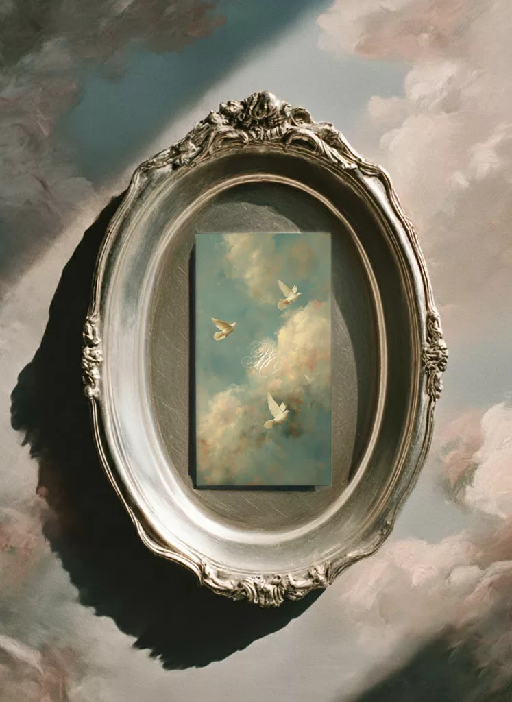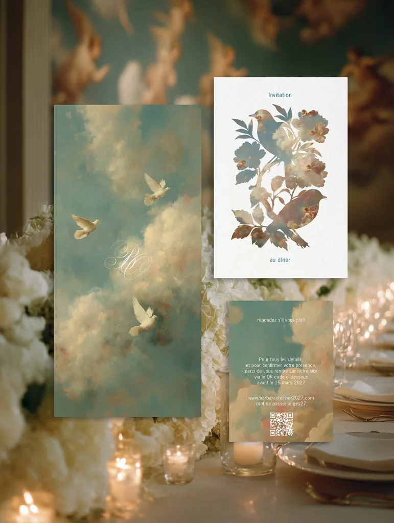 Les visuels mêlent collages artistiques et textures nuageuses. Ils rappellent les plafonds peints des grandes chapelles italiennes. On y aperçoit des colombes, des éclats de lumière et des fragments de ciel. Ainsi, la Renaissance ne se contente pas d’être citée : elle se transforme, se réinterprète et devient un langage graphique propre à Maison Célestine. Cette collection s’adresse aux couples sensibles à la poésie des images et à la beauté des atmosphères célestes. Elle séduira aussi celles et ceux qui aiment les nuances subtiles, les compositions peintes et les détails qui racontent une histoire. Dans Sixtine, chaque élément — typographie, couleurs, textures — forme un fragment d’une fresque moderne, élégante et intemporelle.