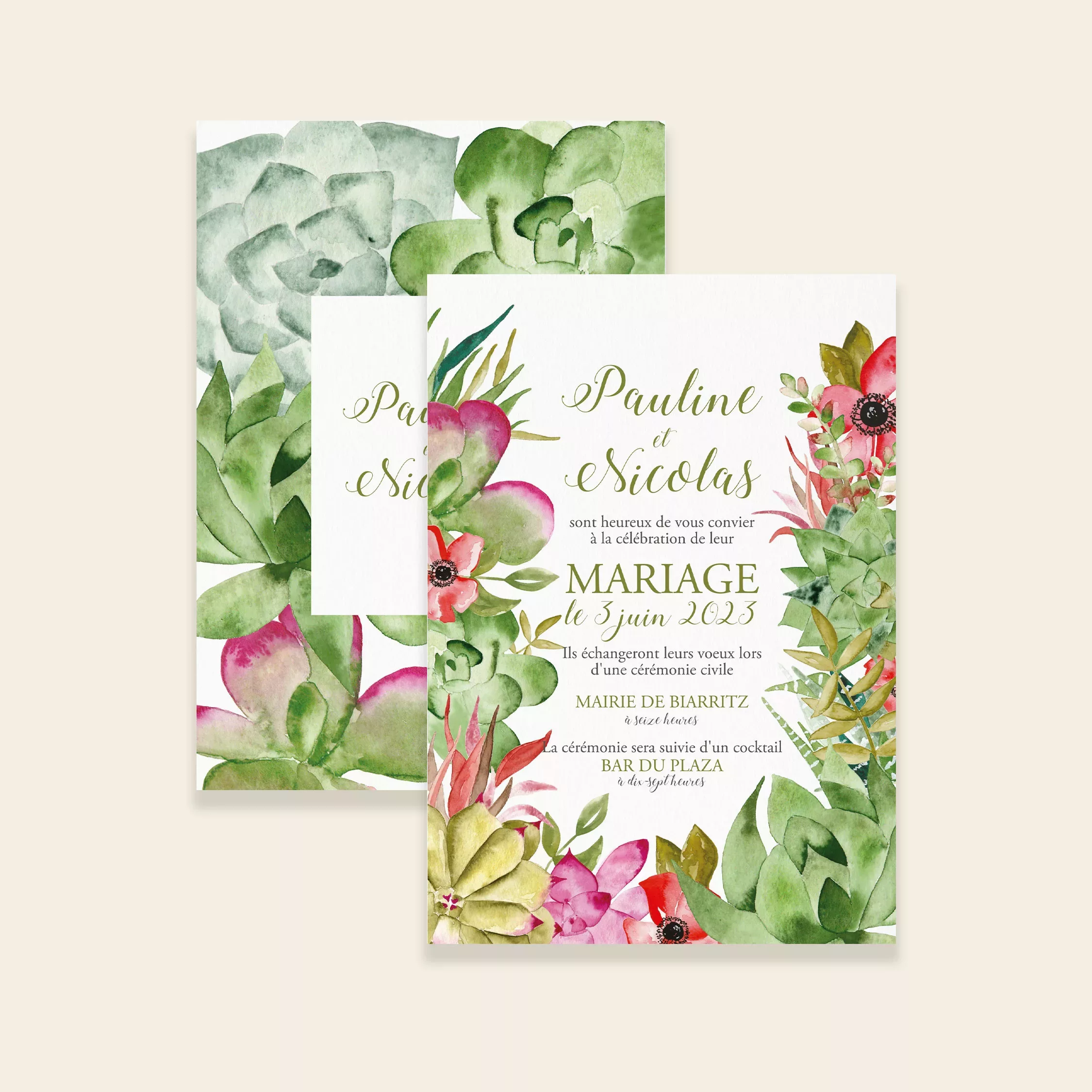 Cette papeterie se distingue par son esprit naturel et bohème. Les tons doux et lumineux apportent fraîcheur et légèreté à vos invitations. Elle s’adresse aux couples en quête d’un faire-part de mariage coloré, original et élégant, inspiré par la nature. Les créations Succulentes s’harmonisent parfaitement avec un mariage en extérieur, dans un jardin ou une serre végétale. Elles évoquent une ambiance conviviale et poétique, idéale pour les amoureux de la botanique.