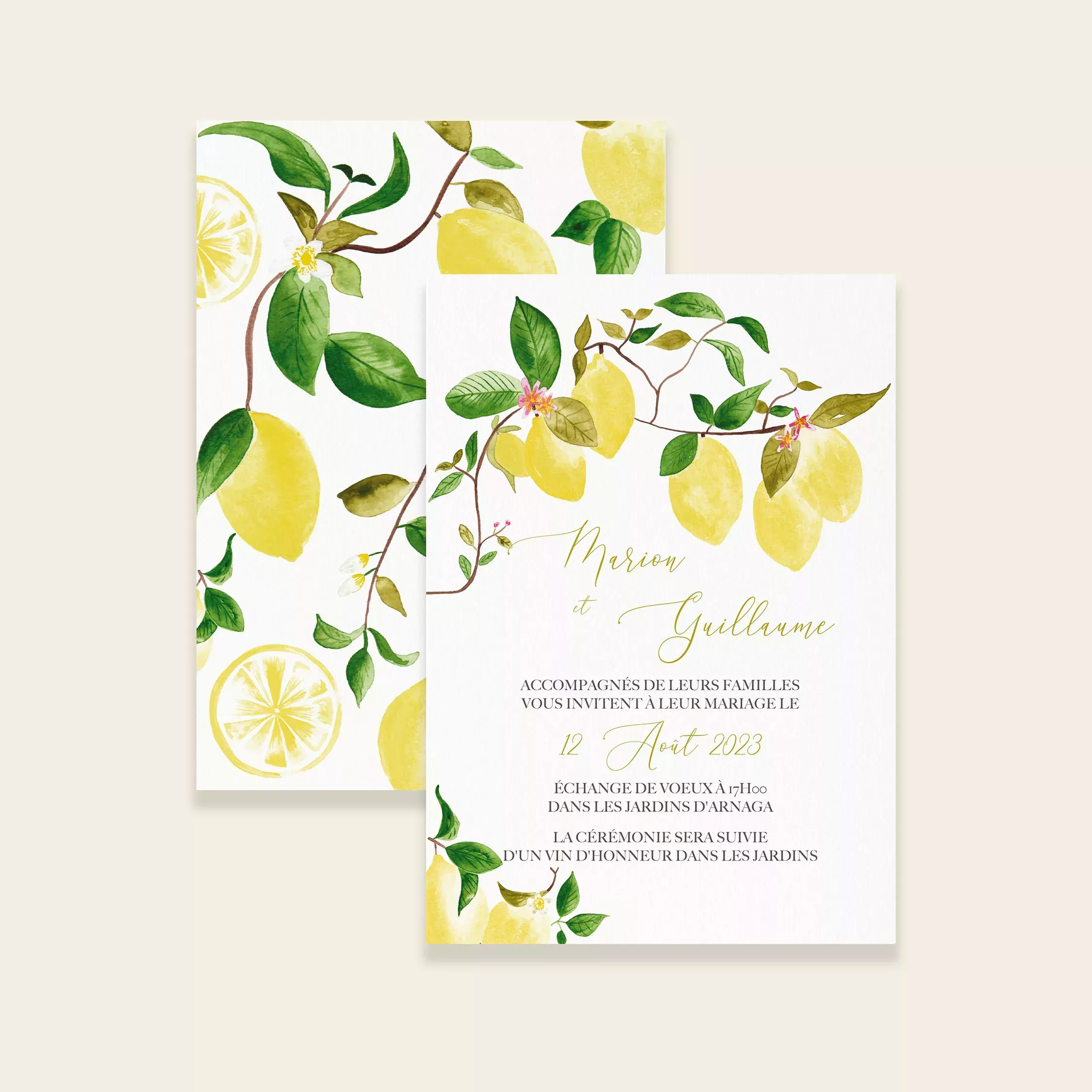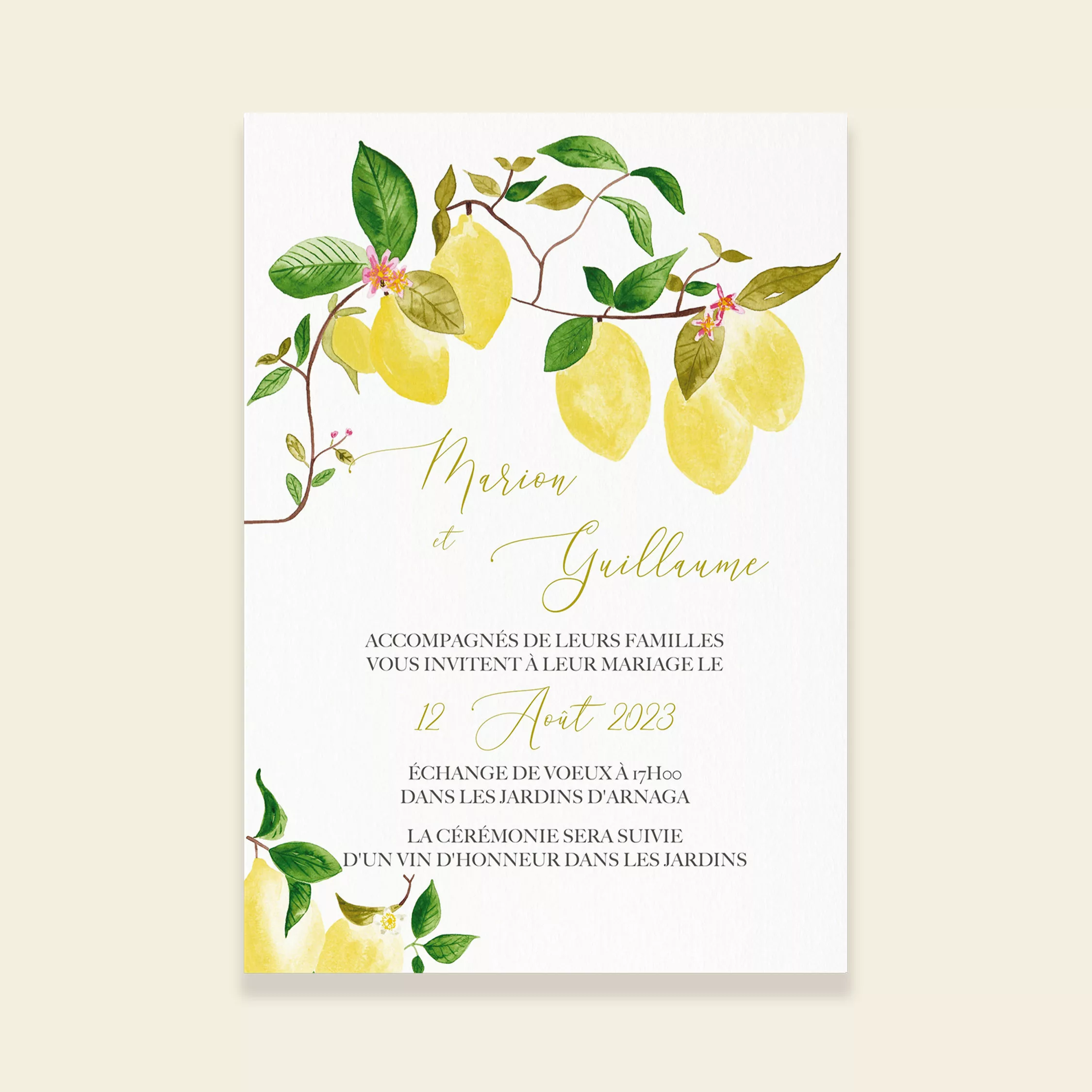 La collection Un Amour de Citron de Maison Célestine célèbre les mariages lumineux. Peinte à la main à l’aquarelle, elle met en scène citrons et branchages. Ainsi, les tons jaune et vert évoquent le printemps et l’été. Chaque illustration apporte fraîcheur, poésie et ambiance botanique. Par ailleurs, cette collection convient parfaitement aux mariages bohèmes, naturels ou colorés.