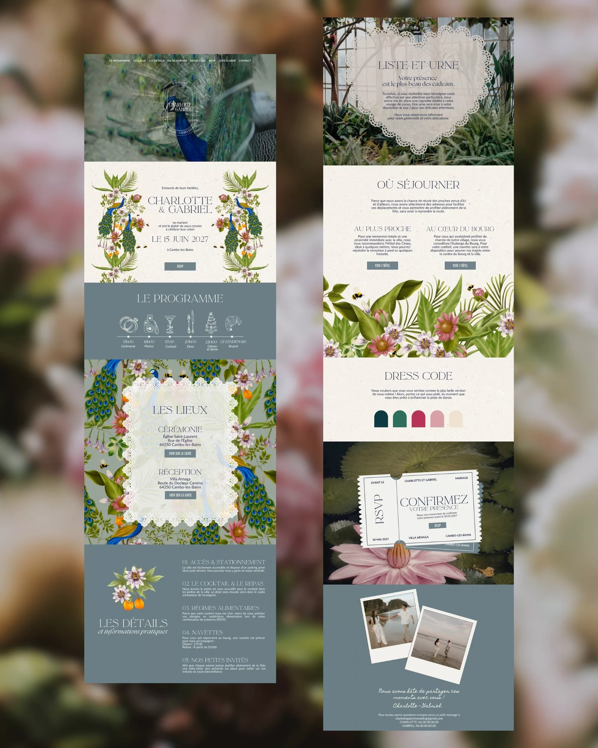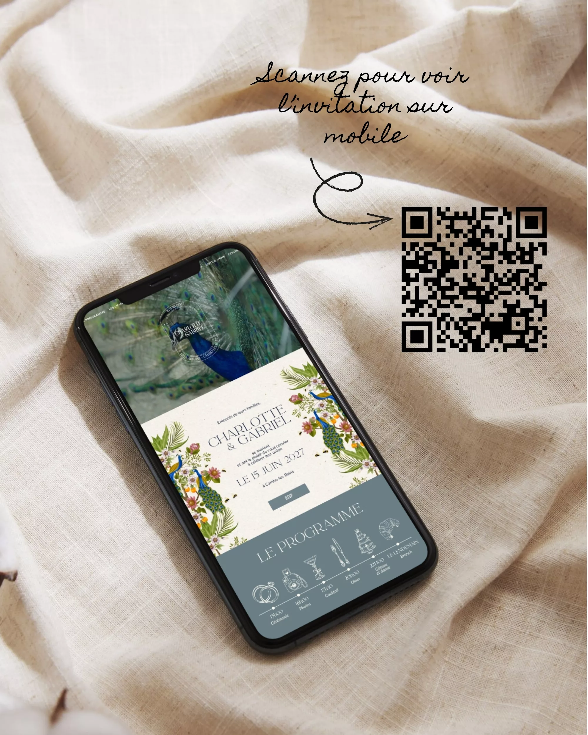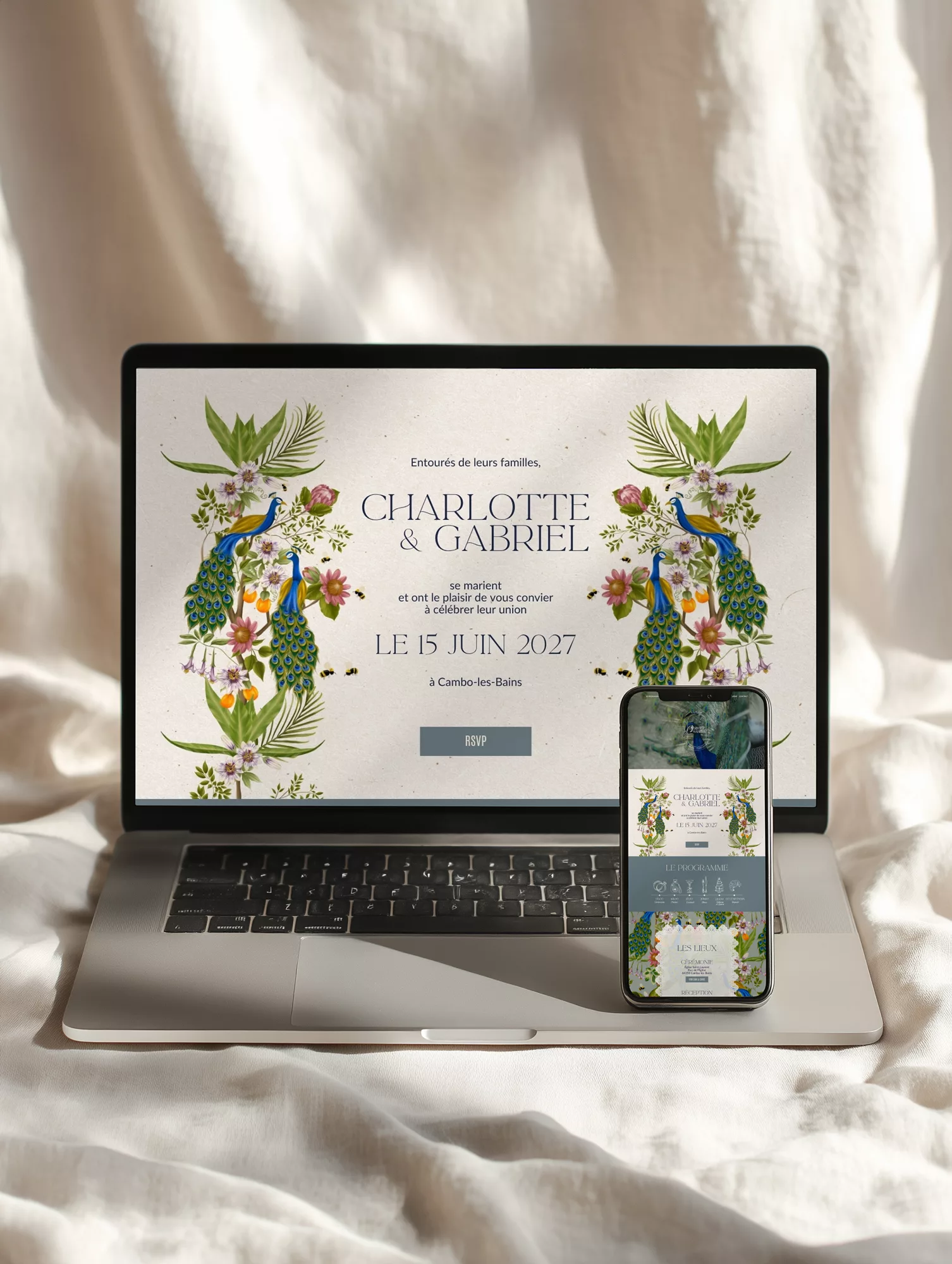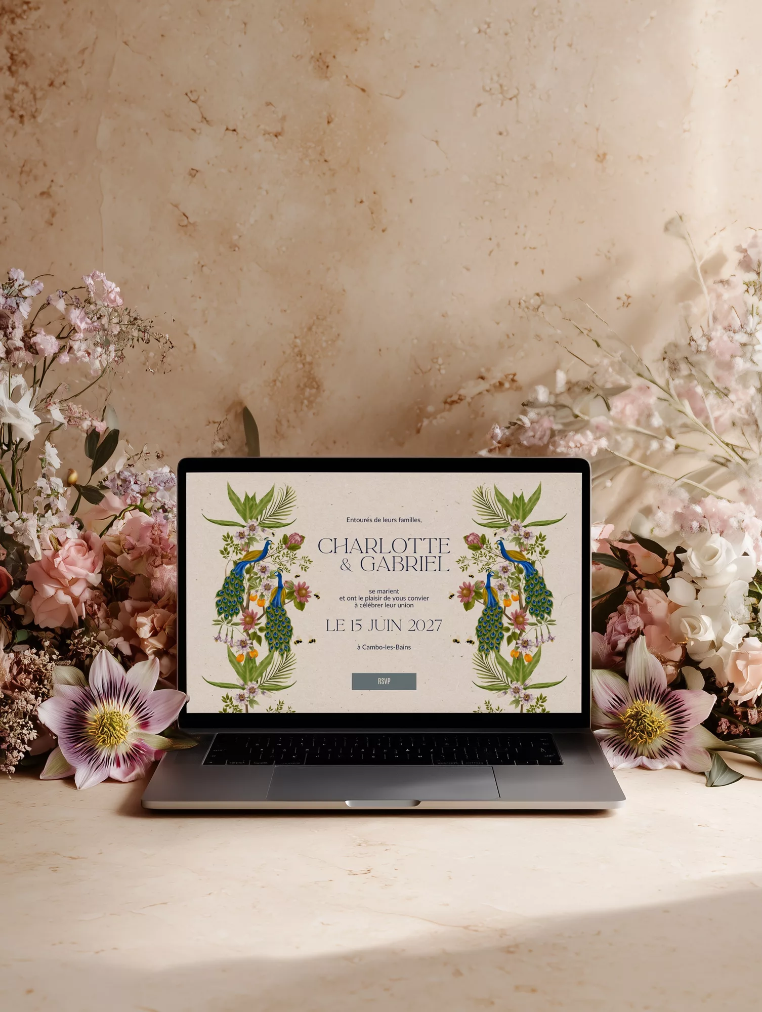 Inspiré de l’atmosphère des jardins luxuriants, le modèle de faire-part digital exotique Peacock Garden prend la forme d’un mini-site élégant, conçu pour partager votre mariage avec intensité et modernité.