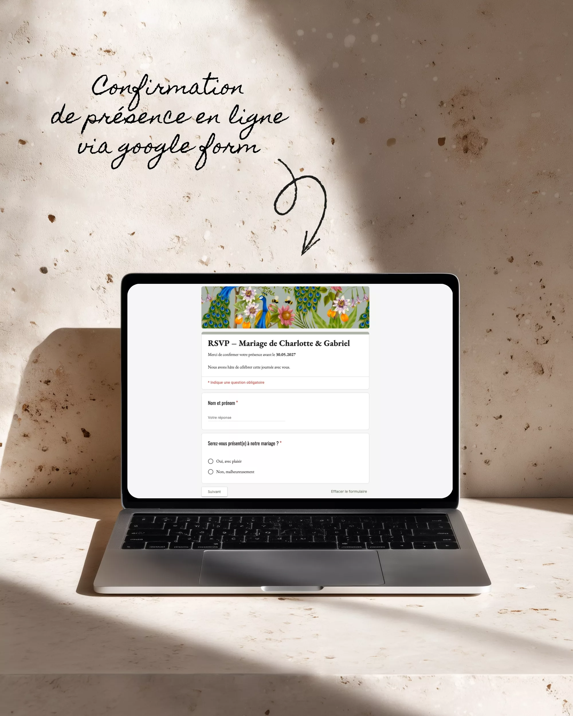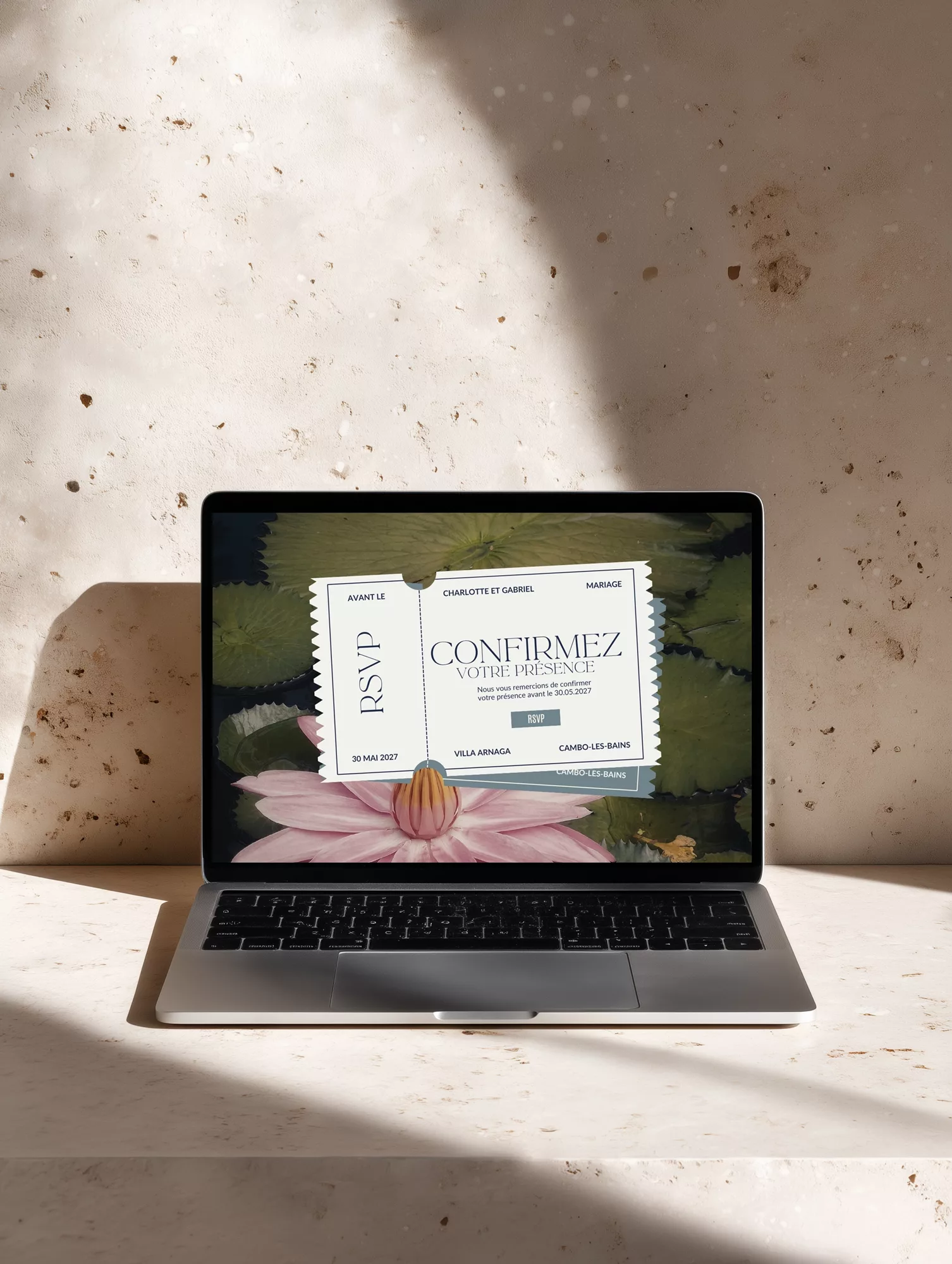 Un formulaire de confirmation de présence (RSVP) peut être intégré à votre invitation digitale afin de faciliter l’organisation de votre mariage.