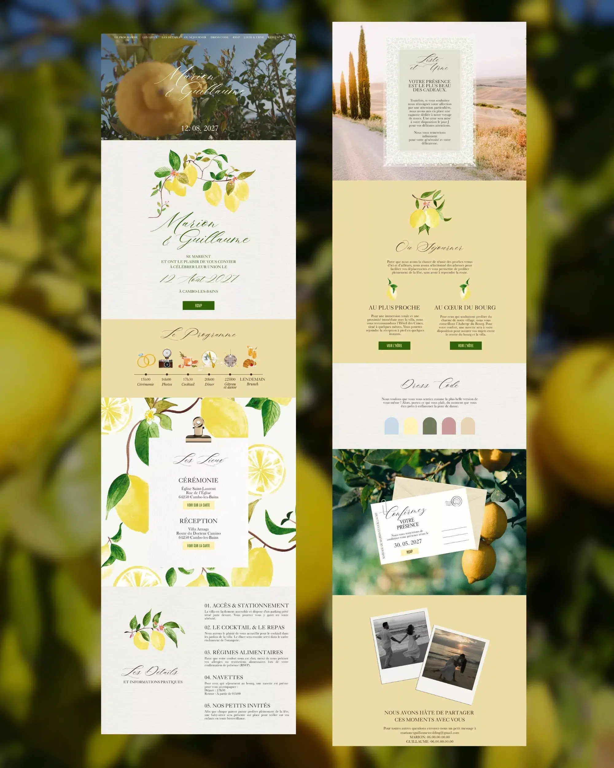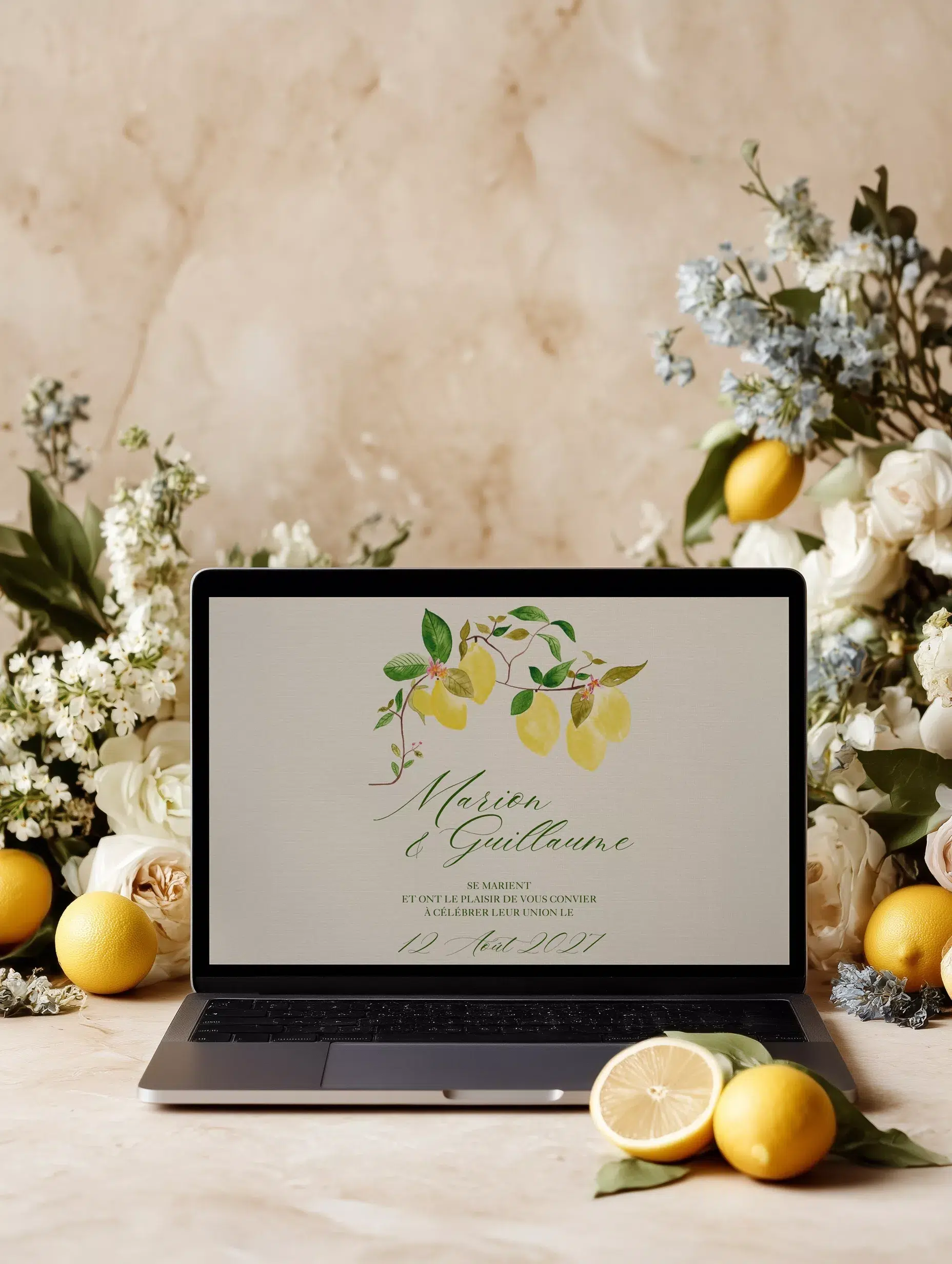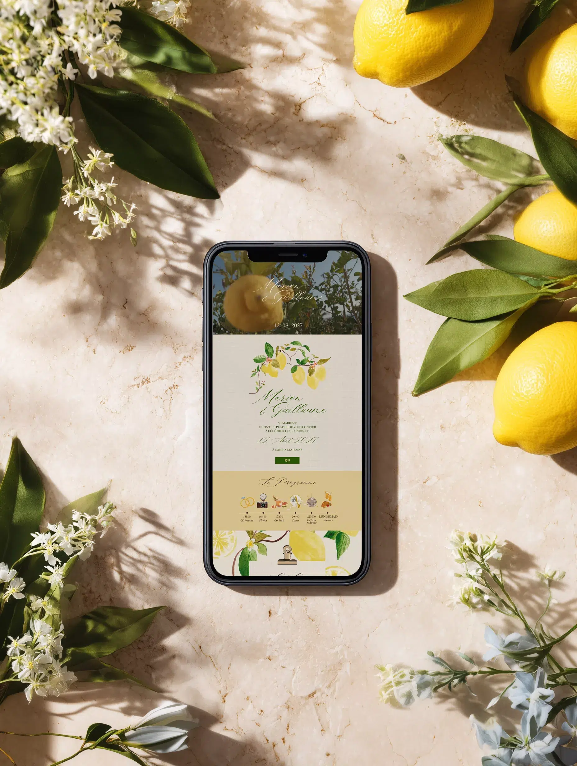 Inspiré de l’atmosphère des jardins méditerranéens, le modèle de faire-part digital citron Un Amour de Citron prend la forme d’un mini-site élégant, conçu pour partager votre mariage avec fraîcheur et modernité.