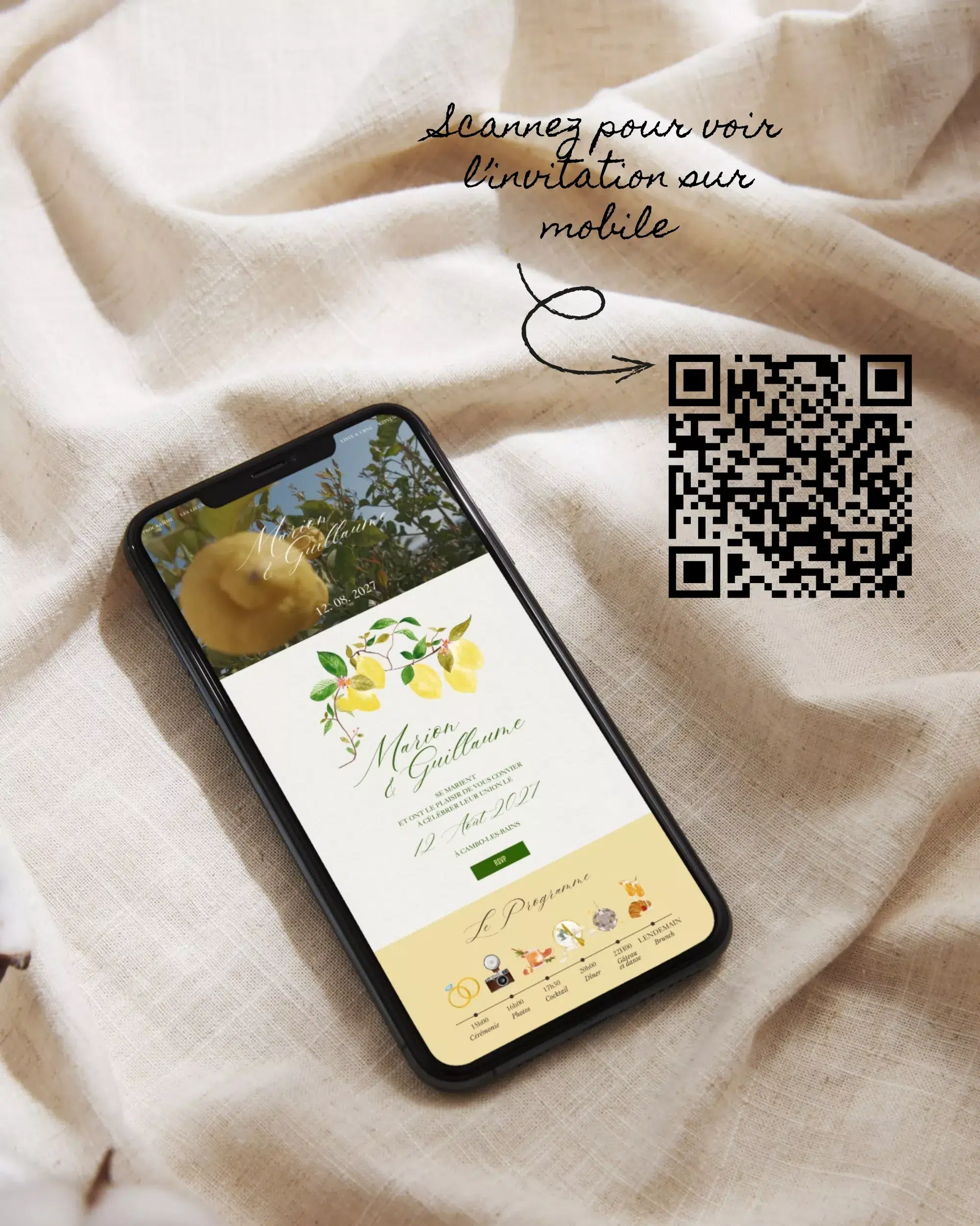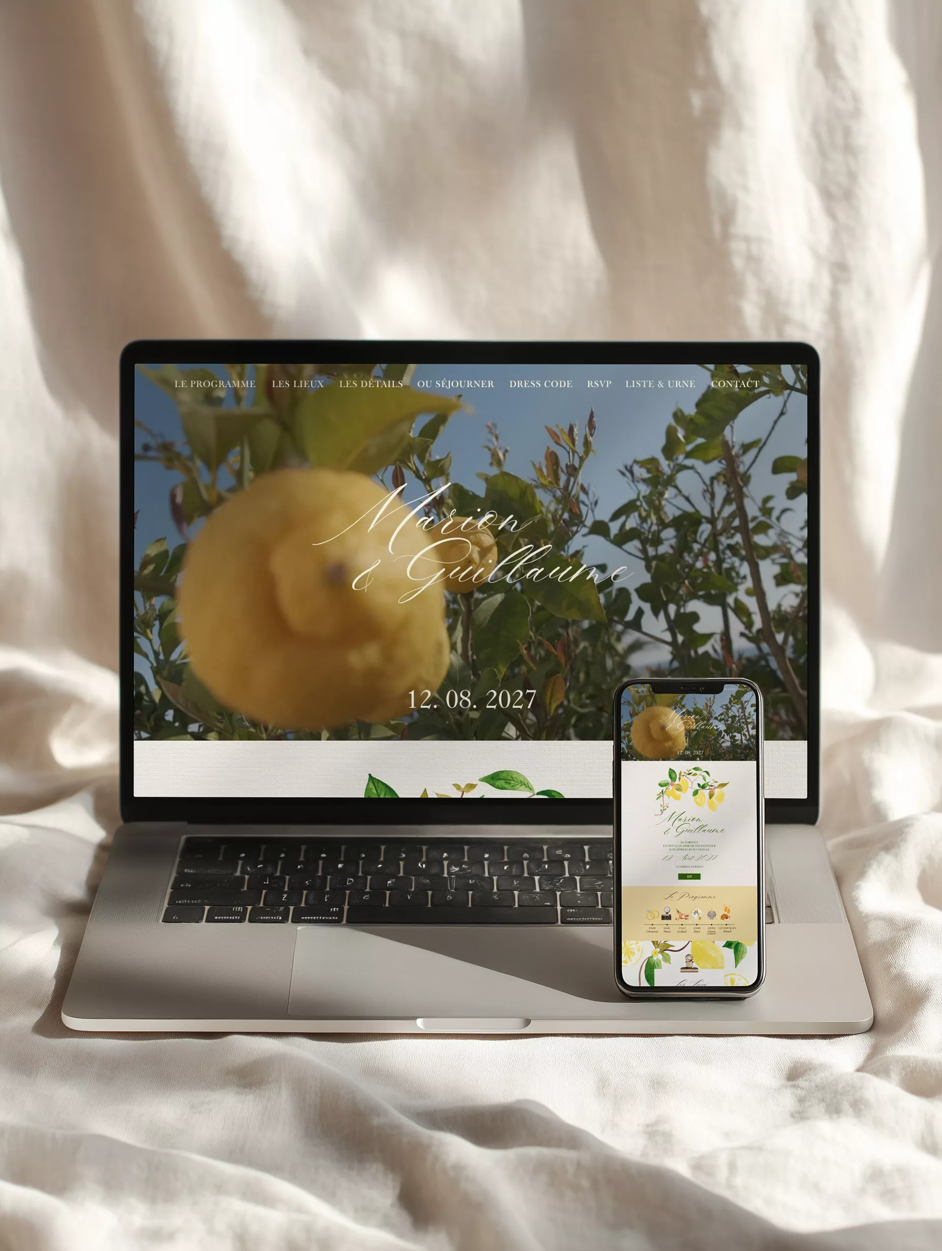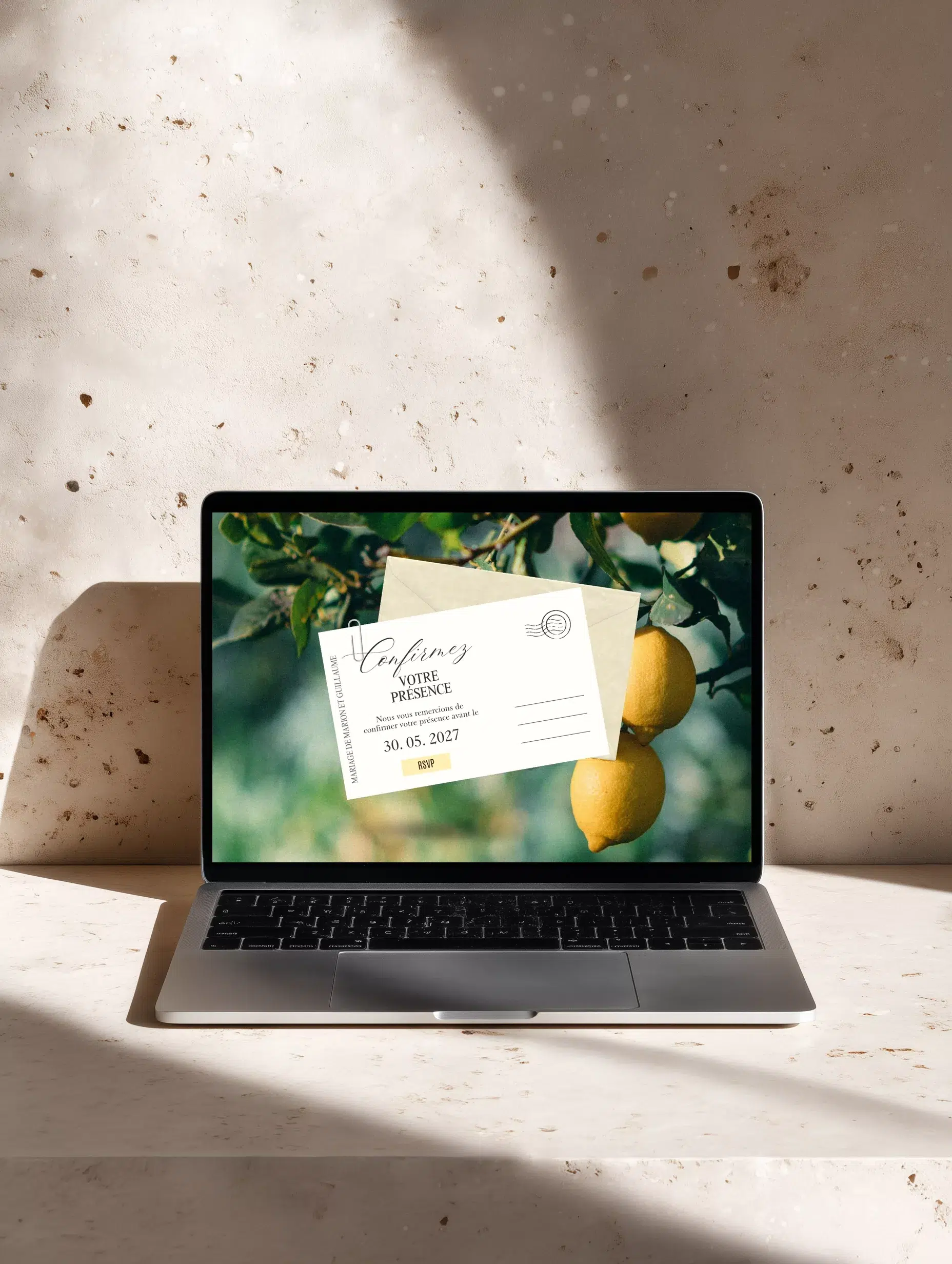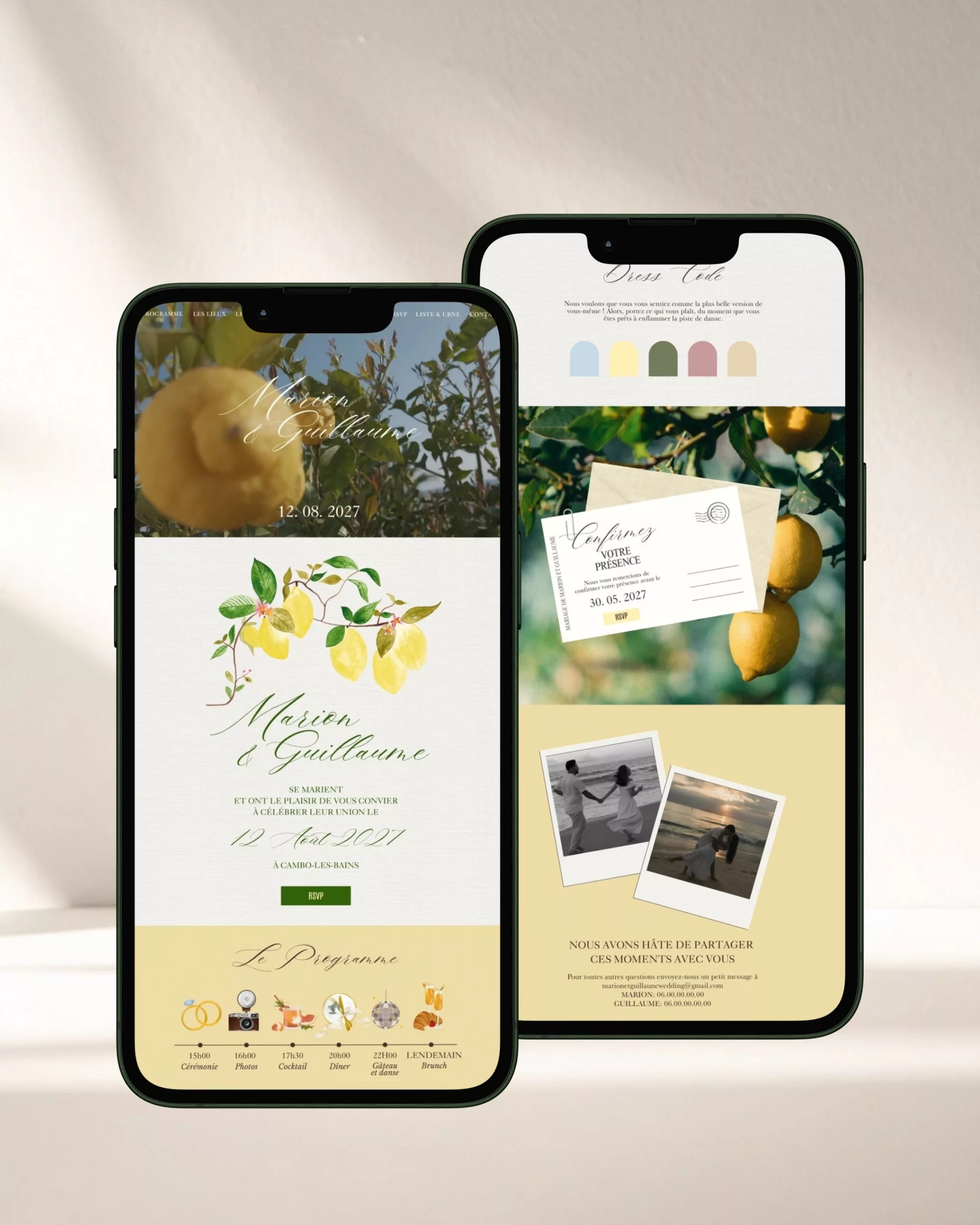 Inspiré de l’atmosphère des jardins méditerranéens, le modèle de faire-part digital citron Un Amour de Citron prend la forme d’un mini-site élégant, conçu pour partager votre mariage avec fraîcheur et modernité.