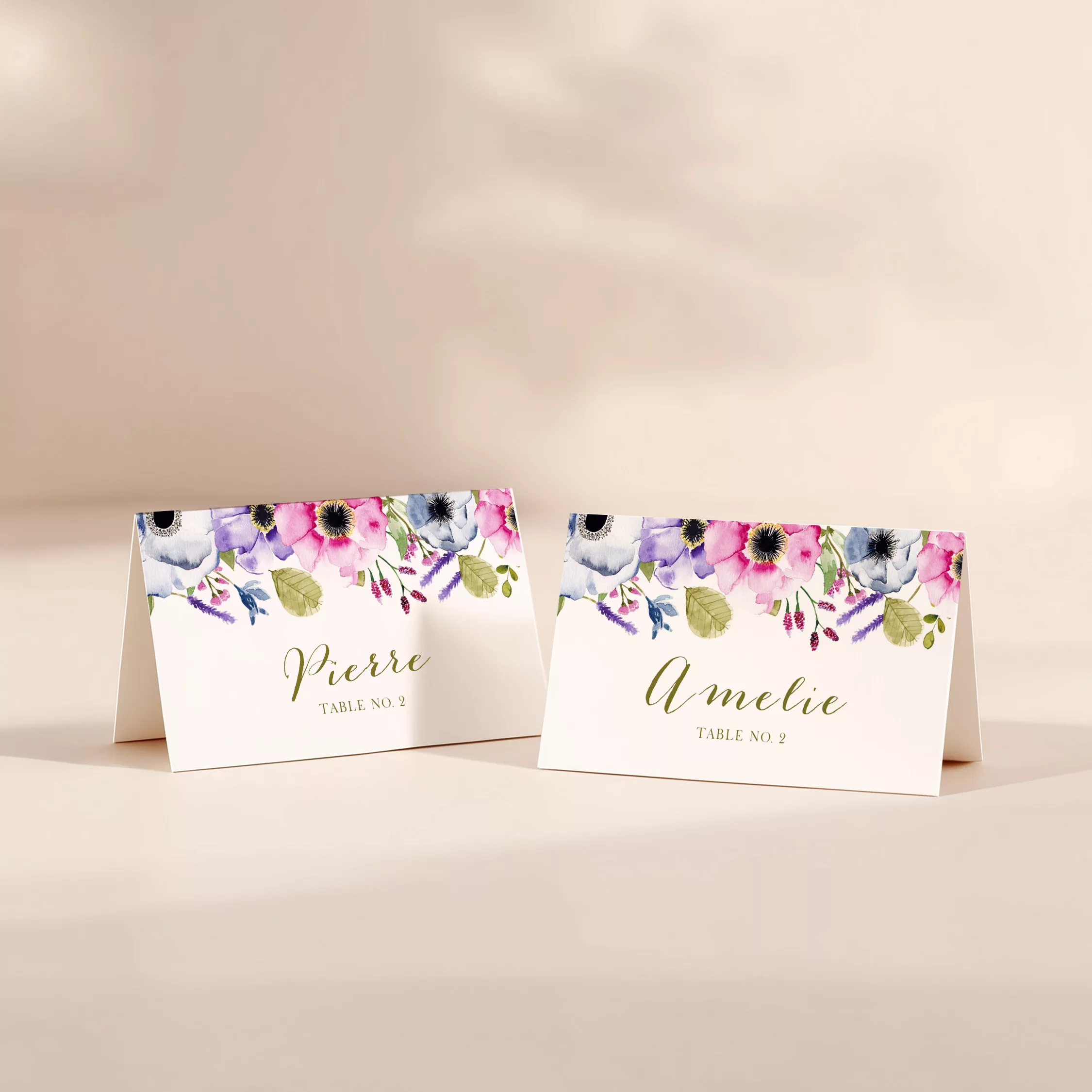 Organisez la place de chacun avec style grâce à un marque-place personnalisé. Ce petit détail pratique complète votre papeterie et facilite l’installation de vos invités. Il apporte une touche raffinée et harmonieuse à votre table. Inspirée des prairies en fleurs et des paysages naturels baignés de lumière, la collection « Balade Champêtre » célèbre les mariages simples, poétiques et profondément ancrés dans la nature. Ses illustrations à l’aquarelle, composées de fleurs des champs et de feuillages sauvages, évoquent une nature libre et spontanée. Chaque détail semble cueilli sur le vif, pour créer une papeterie douce, vivante et délicatement romantique.