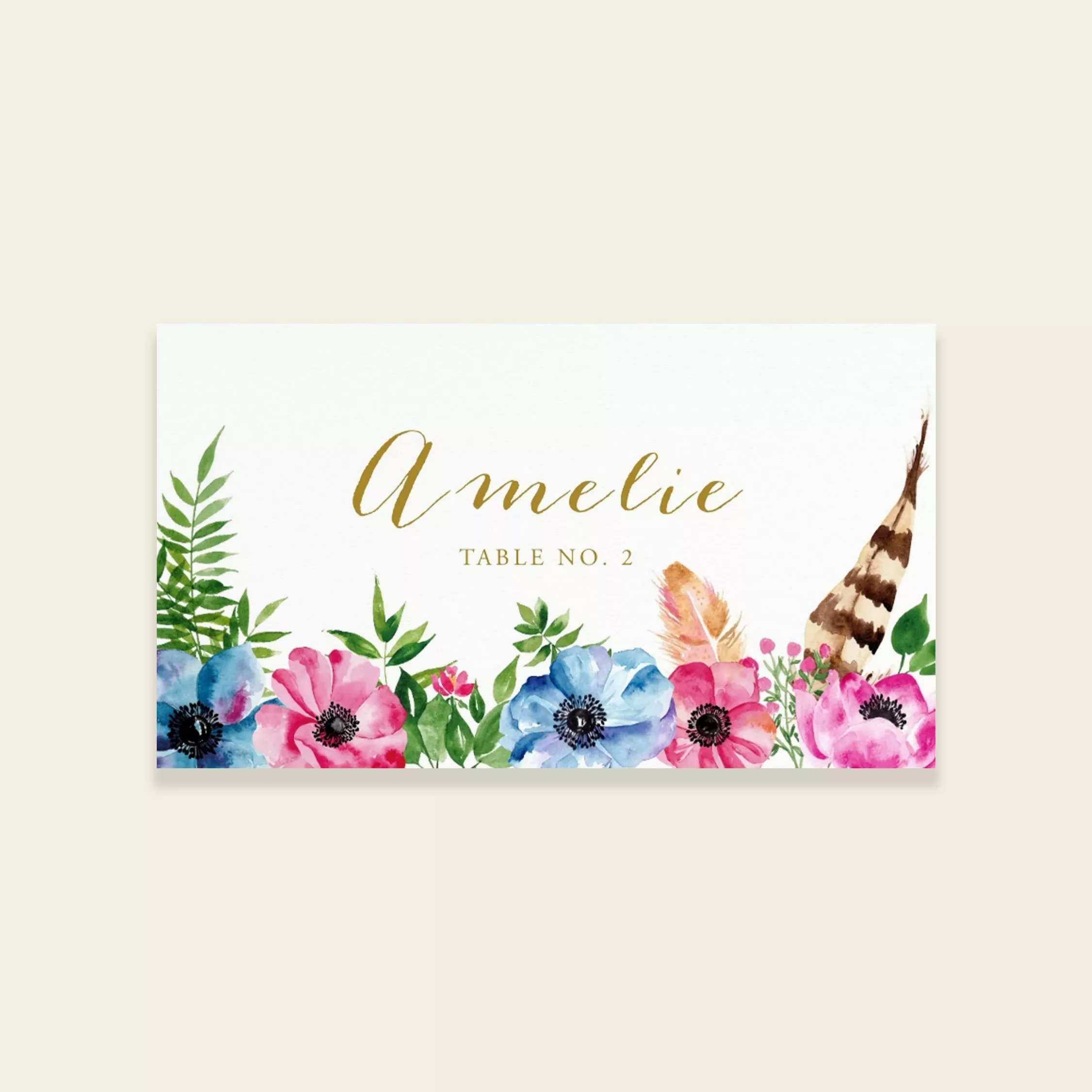 Marque-place de la collection BOHOWILD issue de la gamme mariage de Maison Célestine. “Bohowild” est un design à l’esprit bohème entièrement peint à la main à l’aquarelle au studio. Cette papeterie de mariage mêle fleurs, feuillage, plumes, bois de cerf et typographie chic et romantique. C’est une collection idéale pour les mariages à l’esprit bohème et rustique.