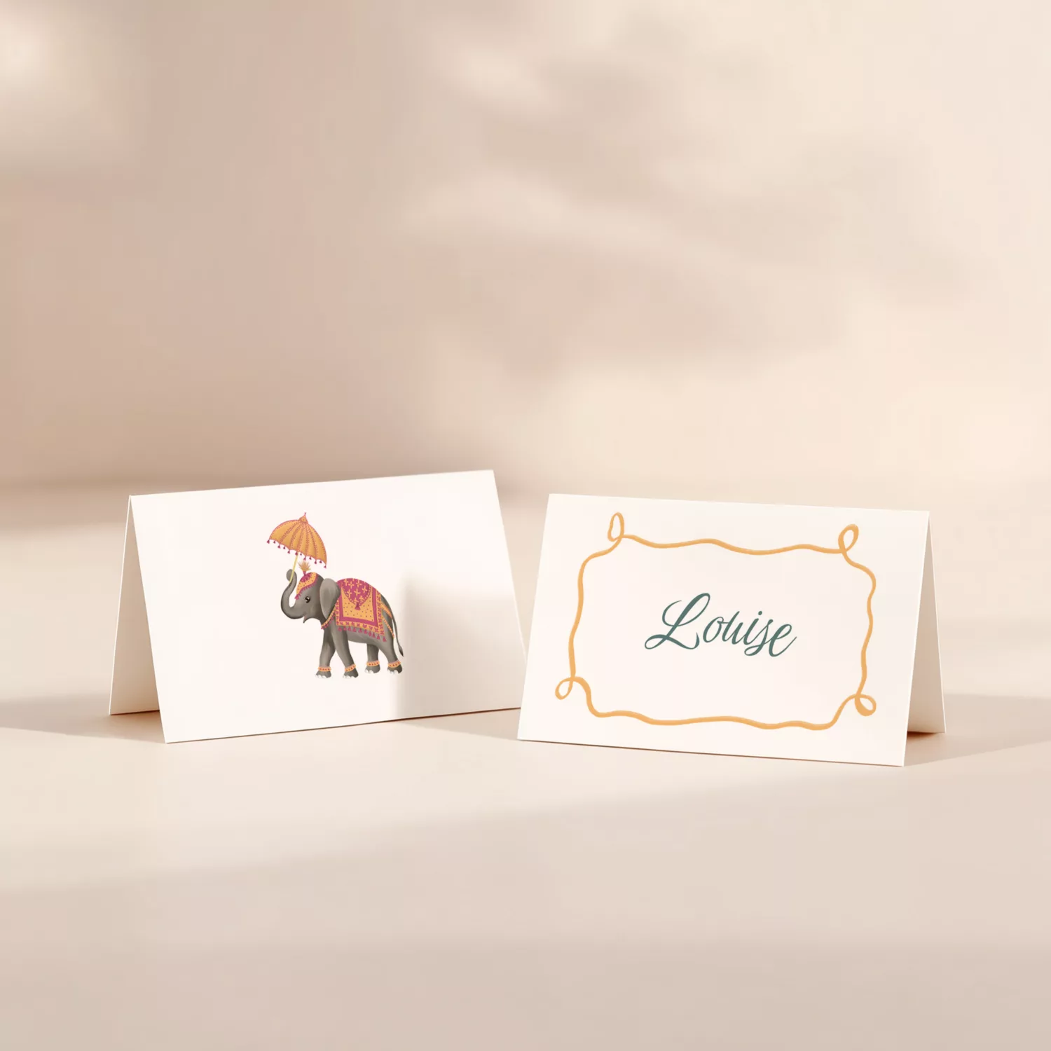 Organisez la place de chacun avec style grâce à un marque-place personnalisé. Ce petit détail pratique complète votre papeterie et facilite l’installation de vos invités. Il apporte une touche raffinée et harmonieuse à votre table. La collection Jaipur apporte de l’éclat à votre mariage. En effet, ce modèle s’inspire des jardins orientaux et des fêtes traditionnelles. Il combine des fleurs luxuriantes avec des éléphants de parade. De plus, des détails fantaisistes créent un ensemble harmonieux. Les nuances de rose et de jaune safran diffusent une énergie solaire. Ainsi, votre papeterie devient une véritable invitation au voyage.