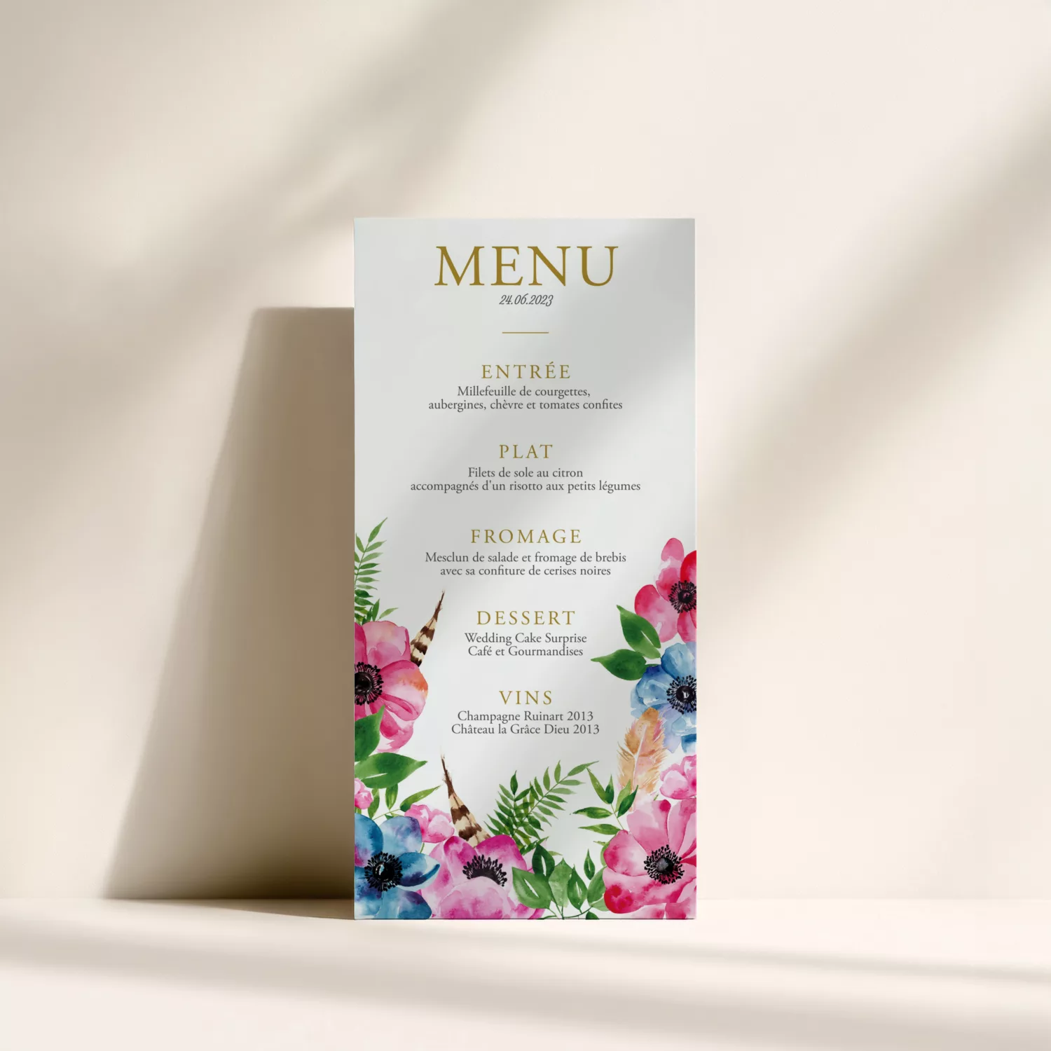 Présentez le repas de votre mariage avec élégance grâce à un menu personnalisé. Ce support complète votre papeterie et guide vos invités à travers chaque étape du repas. Il ajoute une touche raffinée et cohérente à votre table.